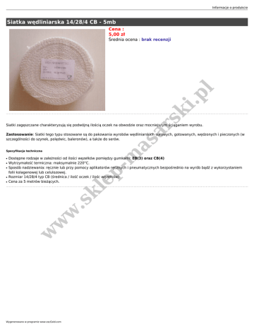 Informacje o produkcie Siatka wędliniarska 14/28/4 CB - 5mb Cena : 5,00 zł ar sk i.p l Średnia ocena : brak recenzji Siatki zagęszczane charakteryzują się podwójną ilością oczek na obwodzie oraz mocniejszym ściąganiem wyrobu. as Zastosowanie: Siatki tego typu stosowane są do pakowania wyrobów wędliniarskich surowych, gotowanych, wędzonych i pieczonych (w szczególności do szynek, polędwic, baleronów), a także do serów. ● ● ● w w w .s kl ● Dostępne rodzaje w zależności od ilości węzełków pomiędzy gumkami: EB(3) oraz CB(4) Wytrzymałość termiczna: maksymalnie 220°C. Sposób nadziewania: ręcznie lub przy pomocy aplikatorów ręcznych i pneumatycznych bezpośrednio na wyrób bądź z wykorzystaniem folii kolagenowej lub celulozowej. Rozmiar 14/28/4 typ CB (średnica / ilość oczek / ilośc węzełków) Cena za 5 metrów bieżących. ep ● -m Specyfikacja techniczna Wygenerowano w programie www.oscGold.com