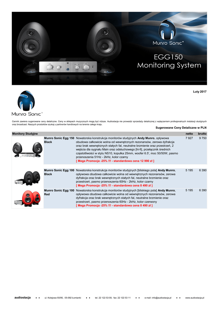 Luty 2017 Cennik zawiera sugerowane ceny detaliczne. Ceny w sklepach muzycznych mogą być niższe. Audiostacja nie prowadzi sprzedaży detalicznej z wyłączeniem profesjonalnych instalacji studyjnych oraz broadcast. Naszych produktów szukaj u partnerów handlowych na terenie całego kraju. Sugerowane Ceny Detaliczne w PLN Monitory Studyjne audiostacja ♦ ♦ netto brutto Munro Sonic Egg 150 Nowatorska konstrukcja monitorów studyjnych Andy Munro, opływowa obudowa całkowicie wolna od wewnętrznych rezonansów, zerowa dyfrakcja Black oraz brak wewnętrznych stałych fal, neutralne brzmienie oraz przestrzeń, 2 wejścia dla sygnału Main oraz odsłuchowego [hi-fi], przełącznik średnich częstotliwości w stylu NS10, kopułka 25mm, woofer 6.5', moc 50/50W, pasmo przenoszenia 51Hz - 2kHz, kolor czarny [ Mega Promocja -25% !!! - standardowa cena 12 990 zł ] 7 927 9 750 Munro Sonic Egg 100 Nowatorska konstrukcja monitorów studyjnych [bliskiego pola] Andy Munro, opływowa obudowa całkowicie wolna od wewnętrznych rezonansów, zerowa Black dyfrakcja oraz brak wewnętrznych stałych fal, neutralne brzmienie oraz przestrzeń, pasmo przenoszenia 60Hz - 2kHz, kolor czarny [ Mega Promocja -25% !!! - standardowa cena 8 490 zł ] 5 195 6 390 Munro Sonic Egg 100 Nowatorska konstrukcja monitorów studyjnych [bliskiego pola] Andy Munro, opływowa obudowa całkowicie wolna od wewnętrznych rezonansów, zerowa Red dyfrakcja oraz brak wewnętrznych stałych fal, neutralne brzmienie oraz przestrzeń, pasmo przenoszenia 60Hz - 2kHz, kolor czerwony [ Mega Promocja -25% !!! - standardowa cena 8 490 zł ] 5 195 6 390 ul. Kolejowa 93/95, 05-092 Łomianki ♦ ♦ tel. 22 122 53 00, fax: 22 122 53 11 ♦ ♦ e-mail: [email protected] ♦ ♦ www.audiostacja.pl
