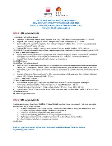 SPOTKANIE BENEFICJENTÓW PROGRAMU DOM KULTURY+ INICJATYWY LOKALNE 2013-2016 MIEJSCE: Chorzów, CHORZOWSKIE CENTRUM KULTURY TERMIN: 28-29 kwietnia 2016 DZIEŃ 1 (28 kwietnia 2016) 11.00-12.00 (sala widowiskowa) Powitanie uczestników (Marek Mutor dyrektor NCK, Eliza Dzwonkiewicz z-ca dyrektora NCK) – 15 min. Program Dom Kultury+ Inicjatywy lokalne (Małgorzata Gaduła-Zawratyńska NCK) – 5 min. Ocena wybranych aspektów programu Dom Kultury+ Inicjatywy lokalne 2015 – wyniki ewaluacji (Maciej Frąckowiak/Public Profits) – 20 min. Chorzowskie Centrum Kultury – prezentacja instytucji (Tomasz Ignalski dyrektor ChCK) – 20 min. 12.00-12.30 Przerwa kawowa (projekcja filmu ewaluacyjnego programu Dom Kultury+ Inicjatywy lokalne 2015) 12.30 – 14.30 (sala widowiskowa) Relacje domu kultury ze szkołami w programie Dom Kultury+ Inicjatywy lokalne – wyzwania w kontekście współpracy z placówkami oświatowymi. Panel ekspercki oraz dyskusja z udziałem uczestników Bardzo Młoda Kultura (Regionalny Ośrodek Kultury w Katowicach) 14.30-15.30 obiad 15.30-17.00 (sala widowiskowa) Dobre praktyki: przedstawiciele wybranych domów kultury – uczestników edycji Dom Kultury+ Inicjatywy lokalne 2015 (Bemowskie Centrum Kultury, Dom Kultury w Kozach, Ośrodek Kultury w Sejnach) – 60 min. Animatorzy – „kilka słów o pracy animatora...” (Teresa Jankowska, Grażyna Gnatowska, Karol Ostalski) – 40 min. Centrum Wspierania Aktywności Lokalnej CAL – podsumowanie edycji programu Dom Kultury+ Inicjatywy lokalne 2015 (Bohdan Skrzypczak CAL) – 20 min. 17.00 – 17.30 Przerwa kawowa 17.30 – 18.45 (sala widowiskowa) Działania NCK aktywizujące i sieciujące dla animatorów kultury – Kultura Dostępna, Niekongres Animatorów, Giełda Projektów (Aleksandra Stańczuk, Irena Madej NCK) – 35 min. Profesjonalizacja sektora kultury – Program Kadra Kultury (Paulina Kobza NCK) – 20 min. „Zaproś nas do siebie” – szkolenia dla uczestników programu Dom Kultury+ (Agata Radecka NCK) – 15 min. 19.00-20.00 kolacja od 20.00 Klub konferencyjny DZIEŃ 2 (29 kwietnia 2016) 9.00-14.30 warsztaty do wyboru (MOŻNA WYBRAĆ TYLKO 1; odbywają się równolegle). Podczas warsztatów przewidziana jest przerwa kawowa: 1. Strategia budowania relacji domu kultury z otoczeniem (komunikacja społeczna w Programie Dom Kultury+ Inicjatywy lokalne oraz po zakończeniu programu) 2. Ewaluacja – narzędzie profesjonalizacji domu kultury 3. Edukacja przez sztukę jako narzędzie rozwoju małych społeczności 4. Wykorzystanie darmowych narzędzi internetowych w działalności domów kultury 5. Działania domów kultury w przestrzeni publicznej 14.30 obiad Podczas spotkania można będzie kupić wydawnictwa Narodowego Centrum Kultury w promocyjnych cenach