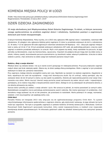 KOMENDA MIEJSKA POLICJI W ŁODZI Źródło: http://www.lodz.policja.gov.pl/eld/komunikaty-1/aktualnosci/2525,Dzien-Dziecka-Zaginionego.html Wygenerowano: Poniedziałek, 6 marca 2017, 23:07 DZIEŃ DZIECKA ZAGINIONEGO 25 maja obchodzony jest Międzynarodowy Dzień Dziecka Zaginionego. To dzień, w którym zwracamy uwagę społeczeństwa na problem zaginięć dzieci i młodzieży. Symbolem pamięci o zaginionych dzieciach jest kwiat niezapominajki. Z danych Komendy Wojewódzkiej Policji wynika, że w 2015 roku zgłoszono 496 zaginięć dzieci i nastolatków, natomiast 488 odnaleziono. W ubiegłym roku zgłoszono łódzkiej policji zaginięcie 21 dzieci w przedziale wiekowym do lat 6, a odnaleziono 21. W wieku 7-13 lat zgłoszono 60 osób zaginionych natomiast odnaleziono 60 Najwięcej – 415 – dotyczyło zaginięć młodych ludzi w wieku od 14 do 17 lat. W tym przedziale wiekowym odnaleziono 407 osób. Jak podkreślają policjanci, znaczna część zaginięć w ostatnim przedziale wiekowym, to ucieczki. Myśl o nich pojawia się wtedy, kiedy nastolatek ma poczucie, że jego potrzeby są lekceważone, czuje się niezrozumiany, opuszczony. Impulsem do podjęcia decyzji mogą stać się słabe oceny w szkole, miłosny zawód, skumulowanie poczucia osamotnienia czy bezsilności wobec własnych problemów. Ucieczka to także wołanie o pomoc, chęć zwrócenia na siebie uwagi lub możliwość poznania nowych ludzi. Rodzicu, dbaj o swoje dziecko! Młodsze dzieci są ciekawe świata i nie są w stanie ocenić grożącego im niebezpieczeństwa. Przyczyną większości zaginięć małych dzieci jest brak należytej opieki. Zdarza się, że dzieci padają ofiarą przestępstwa. Wiele z zaginięć w tym przedziale wiekowym to także tzw. porwania rodzicielskie. Przy zaginięciu małego dziecka szczególnie ważny jest czas. Najmłodsi są narażeni na większe zagrożenia. Zagubienie w lesie, wpadnięcie do rzeki lub wyziębienie – mogą mieć dramatyczne skutki. By ich uniknąć, należy pamiętać, aby nie zostawiać dzieci do lat 10 samych w domu czy bez opieki na podwórku. Dziecko jak najwcześniej powinno znać swoje imię i nazwisko oraz adres. Warto nauczyć również swoją pociechę zasad zachowania się wobec obcych osób. I najważniejsze: pamiętajmy, że to rodzice mają dbać o bezpieczeństwo swoich dzieci, dlatego to oni są zobowiązani do pilnowania dziecka, a nie dziecko pilnowania się rodzica. Starsze dzieci potrafią już zadbać o swoje zdrowie i życie. Nie oznacza to jednak, że można pozostawić je samych sobie. Nastolatkowie szczególnie mocno potrzebują zainteresowania swoich rodziców. Nie można ignorować ich problemów, choć dorosłemu mogą wydawać się nie aż tak poważne, jak przestawia to nastolatek. Warto poświęcić im uwagę, rozmawiać, wiedzieć, z kim się przyjaźnią i jak spędzają wolny czas. Child Alert Ponadto Polska od listopada 2013 roku włączyła się do ogólnoświatowego programu Child Alert. To system natychmiastowego informowania społeczeństwa o zaginięciu dziecka, gdy okoliczności wskazują, że jego zdrowie lub życie może być zagrożone. Tak było w przypadku zaginięcia w połowie kwietnia 10-letniej dziewczynki z Wołczkowa. Centrum Poszukiwań Osób Zaginionych opracowało komunikat, który został rozpowszechniony w mediach oraz rozpoczęło koordynację działań poszukiwawczych. Po kilkunastu godzinach udało się odnaleźć dziewczynkę oraz zatrzymać sprawcę porwania. Ocena: 0/5 (0) Tweetnij