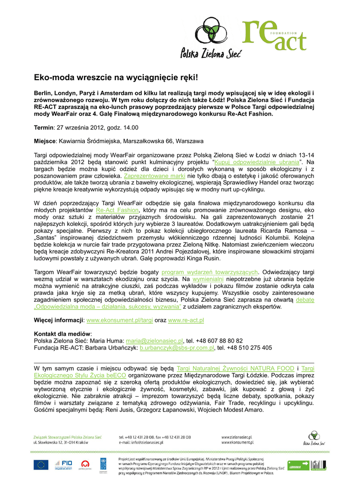 Eko-moda wreszcie na wyciągnięcie ręki! Berlin, Londyn, Paryż i Amsterdam od kilku lat realizują targi mody wpisującej się w ideę ekologii i zrównoważonego rozwoju. W tym roku dołączy do nich także Łódź! Polska Zielona Sieć i Fundacja RE-ACT zapraszają na eko-lunch prasowy poprzedzający pierwsze w Polsce Targi odpowiedzialnej mody WearFair oraz 4. Galę Finałową międzynarodowego konkursu Re-Act Fashion. Termin: 27 września 2012, godz. 14.00 Miejsce: Kawiarnia Śródmiejska, Marszałkowska 66, Warszawa Targi odpowiedzialnej mody WearFair organizowane przez Polską Zieloną Sieć w Łodzi w dniach 13-14 października 2012 będą stanowić punkt kulminacyjny projektu “Kupuj odpowiedzialnie ubrania”. Na targach będzie można kupić odzież dla dzieci i dorosłych wykonaną w sposób ekologiczny i z poszanowaniem praw człowieka. Zaprezentowane marki nie tylko dbają o estetykę i jakość oferowanych produktów, ale także tworzą ubrania z bawełny ekologicznej, wspierają Sprawiedliwy Handel oraz tworząc piękne kreacje kreatywnie wykorzystują odpady wpisując się w modny nurt up-cyklingu. W dzień poprzedzający Targi WearFair odbędzie się gala finałowa międzynarodowego konkursu dla młodych projektantów Re-Act Fashion, który ma na celu promowanie zrównoważonego designu, eko mody oraz sztuki z materiałów przyjaznych środowisku. Na gali zaprezentowanych zostanie 21 najlepszych kolekcji, spośród których jury wybierze 3 laureatów. Dodatkowym uatrakcyjnieniem gali będą pokazy specjalne. Pierwszy z nich to pokaz kolekcji ubiegłorocznego laureata Ricarda Ramosa – „Santas” inspirowanej dziedzictwem przemysłu włókienniczego rdzennej ludności Kolumbii. Kolejna będzie kolekcja w nurcie fair trade przygotowana przez Zieloną Nitkę. Natomiast zwieńczeniem wieczoru będą kreacje zdobywczyni Re-Kreatora 2011 Andrei Pojezdalovej, które inspirowane słowackimi strojami ludowymi powstały z używanych ubrań. Galę poprowadzi Kinga Rusin. Targom WearFair towarzyszyć będzie bogaty program wydarzeń towarzyszących. Odwiedzający targi wezmą udział w warsztatach ekodizajnu oraz szycia. Na wymienialni niepotrzebne już ubrania będzie można wymienić na atrakcyjne ciuszki, zaś podczas wykładów i pokazu filmów zostanie odkryta cała prawda jaka kryje się za metką ubrań, które wszyscy kupujemy. Wszystkie osoby zainteresowane zagadnieniem społecznej odpowiedzialności biznesu, Polska Zielona Sieć zaprasza na otwartą debatę „Odpowiedzialna moda – działania, sukcesy, wyzwania” z udziałem zagranicznych ekspertów. Więcej informacji: www.ekonsument.pl/targi oraz www.re-act.pl Kontakt dla mediów: Polska Zielona Sieć: Maria Huma: [email protected], tel. +48 607 88 80 82 Fundacja RE-ACT: Barbara Urbańczyk: [email protected], tel. +48 510 275 405 W tym samym czasie i miejscu odbywać się będą Targi Naturalnej Żywności NATURA FOOD i Targi Ekologicznego Stylu Życia beECO organizowane przez Międzynarodowe Targi Łódzkie. Podczas imprez będzie można zapoznać się z szeroką ofertą produktów ekologicznych, dowiedzieć się, jak wybierać wytworzoną etycznie i ekologicznie żywność, kosmetyki, zabawki, jak kupować z głową i żyć ekologicznie. Nie zabraknie atrakcji – imprezom towarzyszyć będą liczne debaty, spotkania, pokazy filmów i warsztaty związane z tematyką zdrowego odżywiania, Fair Trade, recyklingu i upcyklingu. Gośćmi specjalnymi będą: Reni Jusis, Grzegorz Łapanowski, Wojciech Modest Amaro.