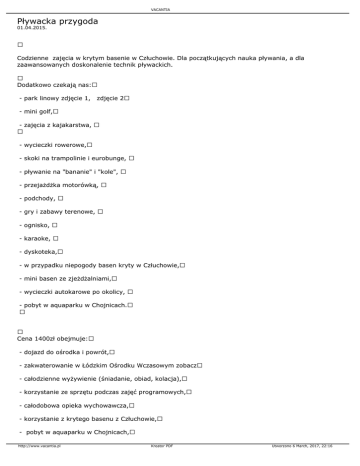 VACANTIA Pływacka przygoda 01.04.2015. Codzienne zajęcia w krytym basenie w Człuchowie. Dla początkujących nauka pływania, a dla zaawansowanych doskonalenie technik pływackich. Dodatkowo czekają nas: - park linowy zdjęcie 1, zdjęcie 2 - mini golf, - zajęcia z kajakarstwa, - wycieczki rowerowe, - skoki na trampolinie i eurobunge, - pływanie na "bananie" i "kole", - przejażdżka motorówką, - podchody, - gry i zabawy terenowe, - ognisko, - karaoke, - dyskoteka, - w przypadku niepogody basen kryty w Człuchowie, - mini basen ze zjeżdżalniami, - wycieczki autokarowe po okolicy, - pobyt w aquaparku w Chojnicach. Cena 1400zł obejmuje: - dojazd do ośrodka i powrót, - zakwaterowanie w Łódzkim Ośrodku Wczasowym zobacz - całodzienne wyżywienie (śniadanie, obiad, kolacja), - korzystanie ze sprzętu podczas zajęć programowych, - całodobowa opieka wychowawcza, - korzystanie z krytego basenu z Człuchowie, - pobyt w aquaparku w Chojnicach, http://www.vacantia.pl Kreator PDF Utworzono 6 March, 2017, 22:16 VACANTIA - korzystanie z parku linowego i mini golfa http://www.vacantia.pl Kreator PDF Utworzono 6 March, 2017, 22:16