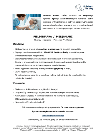 Nobilum Group, spółka wpisana do krajowego rejestru agencji zatrudnienia pod numerem 9084, poszukuje wykwalifikowanej kadry do sprawowania opieki medycznej nad osobami starszymi oraz chorymi w domach seniora oraz w domach prywatnych na terenie Niemiec. PIELĘGNIARKA / PIELĘGNIARZ Niemcy (Nadrenia – Północna Westfalia) Oferujemy: • Stałą umowę o pracę z niemieckim pracodawcą na prawach niemieckich, • Wynagrodzenie w wysokości ok. 1700 EUR brutto/miesiąc (dodatki za pracę w niedziele i święta, nadgodziny), • Zakwaterowanie w mieszkaniach odpowiadających niemieckim standardom, • Pomoc w przeprowadzeniu procesu uznania dyplomu, w tłumaczeniu dokumentów oraz w założeniu rachunku bankowego na terenie Niemiec, • Przed wyjazdem bezpłatny intensywny kurs językowy w kraju, • Zwrot kosztów podróży, • W razie potrzeby wsparcie w osiedleniu rodziny (zatrudnienie dla współmałżonka, szkoła dla dziecka). Wymagania: • Wykształcenie kierunkowe: magister lub licencjat, • Znajomość j. niemieckiego na poziomie komunikatywnym (mile widziana), • Gotowość do wyjazdu w terminie ustalonym na rozmowie kwalifikacyjnej, • Mile widziane prawo jazdy kat. B, • Samodzielność i odpowiedzialność. Zainteresowane osoby prosimy o przesłanie CV oraz skanu dyplomu i prawa do wykonywania zawodu na adres: [email protected] Informujemy, że skontaktujemy się z wybranymi osobami. Prosimy o dopisanie następującej klauzuli: "Wyrażam zgodę na przetwarzanie moich danych osobowych zawartych w mojej ofercie pracy dla potrzeb niezbędnych do realizacji procesu rekrutacji zgodnie z ustawą z dnia 29 sierpnia 1997 r. o ochronie danych osobowych (Dz. U. z 2002 r. Nr 101, poz. 926, ze zm.)"