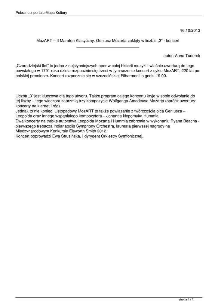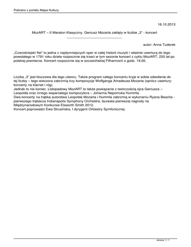 Pobrano z portalu Mapa Kultury 16.10.2013 MozART – II Maraton Klasyczny. Geniusz Mozarta zaklęty w liczbie „3” - koncert ____________________________ autor: Anna Tuderek „Czarodziejski flet” to jedna z najsłynniejszych oper w całej historii muzyki i właśnie uwerturą do tego powstałego w 1791 roku dzieła rozpocznie się trzeci w tym sezonie koncert z cyklu MozART, 220 lat po polskiej premierze. Koncert rozpocznie się w szczecińskiej Filharmonii o godz. 19.00. Liczba „3” jest kluczowa dla tego utworu. Także program całego koncertu kryje w sobie odwołanie do tej liczby – tego wieczora zabrzmią trzy kompozycje Wolfganga Amadeusa Mozarta (oprócz uwertury: koncerty na klarnet i róg). Jednak to nie koniec. Listopadowy MozART to także powiązanie z twórczością ojca Geniusza – Leopolda oraz innego wspaniałego kompozytora – Johanna Nepomuka Hummla. Dwa koncerty na trąbkę autorstwa Leopolda Mozarta i Hummla zabrzmią w wykonaniu Ryana Beacha pierwszego trębacza Indianapolis Symphony Orchestra, laureata pierwszej nagrody na Międzynarodowym Konkursie Elsworth Smith 2012. Koncert poprowadzi Ewa Strusińska, I dyrygent Orkiestry Symfonicznej. strona 1 / 1