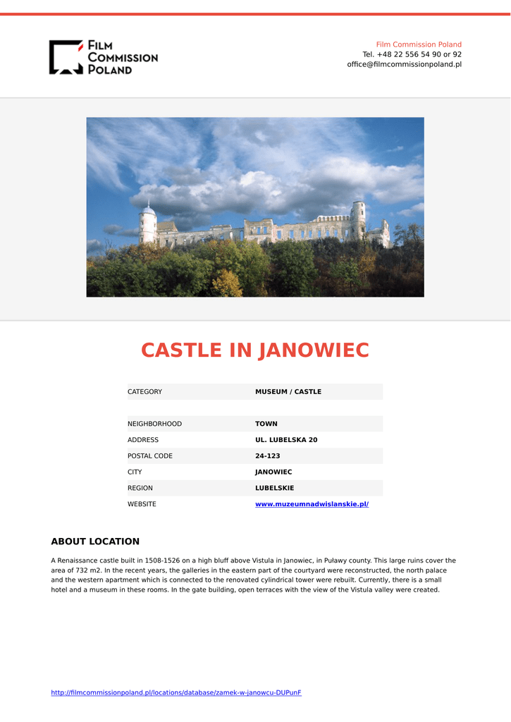 Film Commission Poland Tel. +48 22 556 54 90 or 92 office@filmcommissionpoland.pl CASTLE IN JANOWIEC CATEGORY MUSEUM / CASTLE NEIGHBORHOOD TOWN ADDRESS UL. LUBELSKA 20 POSTAL CODE 24-123 CITY JANOWIEC REGION LUBELSKIE WEBSITE www.muzeumnadwislanskie.pl/ ABOUT LOCATION A Renaissance castle built in 1508-1526 on a high bluff above Vistula in Janowiec, in Puławy county. This large ruins cover the area of 732 m2. In the recent years, the galleries in the eastern part of the courtyard were reconstructed, the north palace and the western apartment which is connected to the renovated cylindrical tower were rebuilt. Currently, there is a small hotel and a museum in these rooms. In the gate building, open terraces with the view of the Vistula valley were created. http://filmcommissionpoland.pl/locations/database/zamek-w-janowcu-DUPunF