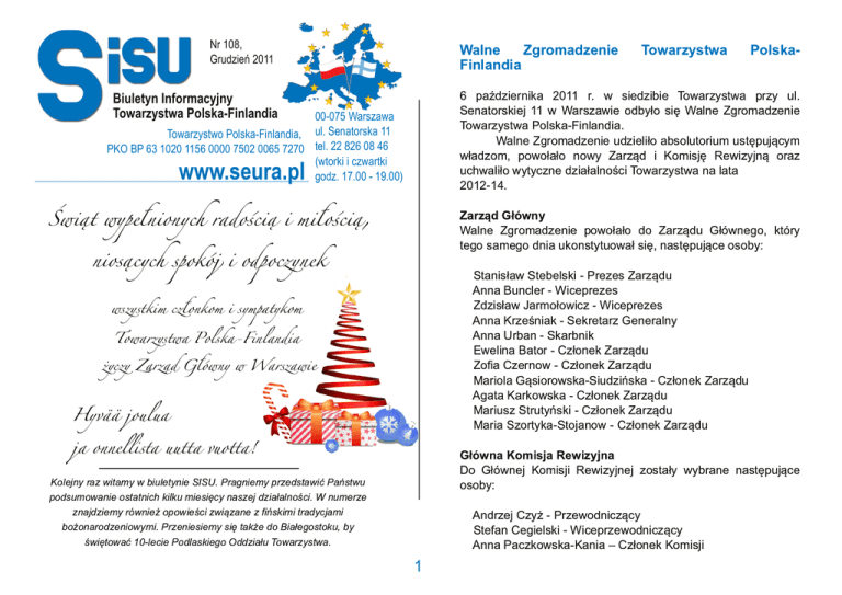 Nr 108, Grudzień 2011 Walne Zgromadzenie Finlandia Biuletyn Informacyjny Towarzystwa PolskaFinlandia Towarzystwa Polska- 6 października 2011 r. w siedzibie Towarzystwa przy ul. Senatorskiej 11 w Warszawie odbyło się Walne Zgromadzenie Towarzystwa Polska-Finlandia. Walne Zgromadzenie udzieliło absolutorium ustępującym władzom, powołało nowy Zarząd i Komisję Rewizyjną oraz uchwaliło wytyczne działalności Towarzystwa na lata 201 2-1 4. 00075 Warszawa Towarzystwo PolskaFinlandia, ul. Senatorska 11 PKO BP 63 1020 1156 0000 7502 0065 7270 tel. 22 826 08 46 (wtorki i czwartki godz. 17.00  19.00) Świątwypełnionychradościąimiłością, niosącychspokój iodpoczynek Zarząd Główny Walne Zgromadzenie powołało do Zarządu Głównego, który tego samego dnia ukonstytuował się, następujące osoby: Stanisław Stebelski - Prezes Zarządu Anna Buncler - Wiceprezes Zdzisław Jarmołowicz - Wiceprezes Anna Krześniak - Sekretarz Generalny Anna Urban - Skarbnik Ewelina Bator - Członek Zarządu Zofia Czernow - Członek Zarządu Mariola Gąsiorowska-Siudzińska - Członek Zarządu Agata Karkowska - Członek Zarządu Mariusz Strutyński - Członek Zarządu Maria Szortyka-Stojanow - Członek Zarządu wszystkim członkom isympatykom TowarzystwaPolska-Finlandia życzy ZarządGłówny wWarszawie Hyvääjoulua jaonnellistauuttavuotta! Główna Komisja Rewizyjna Do Głównej Komisji Rewizyjnej zostały wybrane następujące osoby: Kolejny raz witamy w biuletynie SISU. Pragniemy przedstawić Państwu podsumowanie ostatnich kilku miesięcy naszej działalności. W numerze znajdziemy również opowieści związane z fińskimi tradycjami bożonarodzeniowymi. Przeniesiemy się także do Białegostoku, by świętować 10-lecie Podlaskiego Oddziału Towarzystwa. 1 Andrzej Czyż - Przewodniczący Stefan Cegielski - Wiceprzewodniczący Anna Paczkowska-Kania – Członek Komisji Finlandii. Przez jej rdzennych mieszkańców nazywana jest Sapmi. Większość obszaru Laponii leży poza kołem podbiegunowym. Pod względem krajobrazu jest to rozległy teren wyżynny o wysokości 300-400 m n.p.m. Północ tej pięknej krainy zajmuje tundra, gdzie jedyną roślinnością są karłowate brzózki i tereny bagienne, pokryte wrzosem lub tereny bardzo suche, porośnięte porostami. Południe pokrywają malownicze lasy tajgi. Największym jeziorem Laponii jest Inan (1 386 km.kw.), najwyższym szczytem Kobnekaise (21 04 m n.p.m.). Polarny klimat Sapmi i jej długie, mroźne zimy sprawiają, że obszar ten jest słabo zaludniony. Pierwotna ludność Laponii to Saamowie (Sami). Są obecnie mniejszością wśród mieszkańców tej krainy, liczącą około 70.000 osób. Język Saami dzieli się na trzy różne dialekty, choć obecnie posługuje się nim jedynie około 20.000 osób. Mika Kaurismäki - od 25 listopada w Polsce! Towarzystwo Polska-Finlandia objęło patronat medialny nad filmem Seks po fińsku (Haarautuvan rakkauden talo) , którego reżyserem jest Mika Kaurismäki. Film wszedł na ekrany kin studyjnych 25 listopada. Scenariusz Seksu po fińsku powstał na podstawie powieści Petriego Karry. W głównych rolach wystąpili Hannu-Pekka Björkman (Klasyk, Sport ekstremalny, Za żywych i umarłych) i Elina Knihtilä (Pułapki dorosłości, Lieksa!) , którzy zostali w 201 0 roku nominowani za swoje kreacje do najważniejszej fińskiej nagrody filmowej – Jussi. Słońce świeci w lecie całą dobę, w zimie można zobaczyć zorzę polarną Kilmat charakteryzuje się bardzo pięknym, często upalnym latem trwającym właściwie 2 miesiące - słońce świeci całą dobę, nie zachodzi wcale. Bardzo długa noc polarna trwa prawie 3 miesiące. Są tam wtedy duże mrozy, ale zazwyczaj nie ma wiatru i występuje wspaniałe zjawisko zorzy polarnej. Może występować w postaci płomienistych fal światła roztaczających się od horyzontu po zenit lub Aurora Borealis, źródło: sxc.hu błyszczących łuków źródło:http://lenivastudio.com/ Laponia, Pracowitość i Święty Mikołaj Właśnie wróciłam z Laponii, z Rovaniemi, gdzie spędziłam trzy dni z moimi wnuczkami. Wcześniej pracowałam w Finlandii 7 lat jako lekarz pediatra. Podziwiam ten kraj, jego wspaniałą przyrodę i ludzi, którzy pracują jak mrówki, są rzetelni i uczciwi. Nazwą Laponia określana jest malownicza, choć surowa krainana dalekiej północy Europy, obejmującą swoim zasięgiem teren o powierzchni ok. 380 000 km2, w skład którego wchodzi rosyjski Półwysep Kolski, a także terytorium Szwecji, Norwegii i 2 światła nad horyzontem, rozchodzących się we wszystkich kierunkach. Światło przeważnie ma barwę czerwoną, niekiedy jednak można podziwiać zorzę o barwach zielonożółtych, błękitnych lub srebrzystych. Zjawisko to występuje najczęściej na linii północnego koła podbiegunowego np. Islandia, Laponia, północna Norwegia. Przybiera różne natężenie, od słabego rozjaśnienia nieba północnego do jasności nieba, porównywalnej do pełni księżyca. Wbrew pozorom nie występuje rzadko. wybierają się całymi rodzinami na tzw. „separacje” reniferów. Mieszkają w szałasach, które nazywają się „kota” i przemierzają dziesiątki kilometrów, skacząc po bezdrożach, często kamienistych i po resztkach śniegu i lodu. Jeśli uda im się spotkać reniferzycę z małym - kolczykują reniferzątko swoim kolczykiem, o ile mają pewność, że do nich należy. Są to ludzie bardzo uczciwi. Problemy zaczynają się wtedy, kiedy renifery przekraczają granicę rosyjską… W 1 964 roku uczestniczyłam w Laponii w separacji reniferów. Było to wspaniale i niezapomniane przeżycie. Źródła utrzymania Lapończyków Głównym źródłem utrzymania jest dla Saamów hodowla zwierząt - zwłaszcza reniferów, które od zawsze grały znaczącą rolę w ich życiu, rybołówstwo, myślistwo, uprawa roli oraz rękodzieło, a w ostatnim czasie także turystyka. Na terenie Laponii prowadzi się też wydobycie