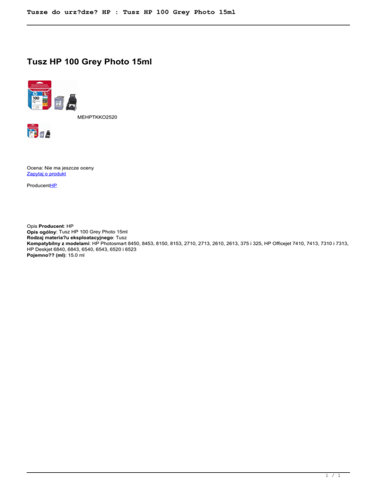 Tusze do urz?dze? HP : Tusz HP 100 Grey Photo 15ml Tusz HP 100 Grey Photo 15ml MEHPTKKO2520 Ocena: Nie ma jeszcze oceny Zapytaj o produkt ProducentHP Opis Producent: HP Opis ogólny: Tusz HP 100 Grey Photo 15ml Rodzaj materia?u eksploatacyjnego: Tusz Kompatybilny z modelami: HP Photosmart 8450, 8453, 8150, 8153, 2710, 2713, 2610, 2613, 375 i 325, HP Officejet 7410, 7413, 7310 i 7313, HP Deskjet 6840, 6843, 6540, 6543, 6520 i 6523 Pojemno?? (ml): 15.0 ml 1 / 1 Powered by TCPDF (www.tcpdf.org)