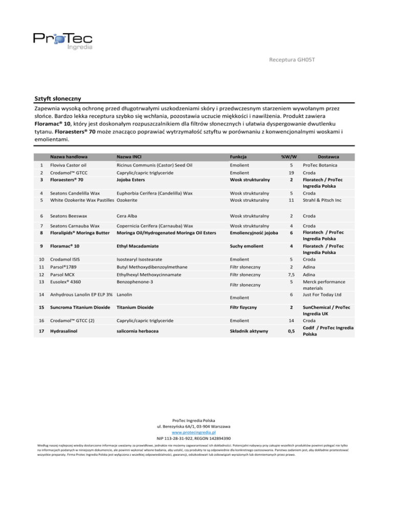 Receptura GH05T Sztyft słoneczny Zapewnia wysoką ochronę przed długotrwałymi uszkodzeniami skóry i przedwczesnym starzeniem wywołanym przez słońce. Bardzo lekka receptura szybko się wchłania, pozostawia uczucie miękkości i nawilżenia. Produkt zawiera Floramac® 10, który jest doskonałym rozpuszczalnikiem dla filtrów słonecznych i ułatwia dyspergowanie dwutlenku tytanu. Floraesters® 70 może znacząco poprawiać wytrzymałość sztyftu w porównaniu z konwencjonalnymi woskami i emolientami. Nazwa handlowa Nazwa INCI Funkcja 1 Floviva Castor oil Ricinus Communis (Castor) Seed Oil Emolient 5 ProTec Botanica 2 3 Crodamol™ GTCC Floraesters® 70 Caprylic/capric triglyceride Jojoba Esters Emolient Wosk strukturalny 19 2 4 5 Seatons Candelilla Wax Euphorbia Cerifera (Candelilla) Wax White Ozokerite Wax Pastilles Ozokerite Wosk strukturalny Wosk strukturalny 5 11 Croda Floratech / ProTec Ingredia Polska Croda Strahl & Pitsch Inc 6 Seatons Beeswax Cera Alba Wosk strukturalny 2 Croda 7 8 Seatons Carnauba Wax Floralipids® Moringa Butter Copernicia Cerifera (Carnauba) Wax Moringa Oil/Hydrogenated Moringa Oil Esters Wosk strukturalny Emoliencyjność jojoba 4 6 Croda Floratech / ProTec Ingredia Polska 9 Floramac® 10 Ethyl Macadamiate Suchy emolient 4 10 Crodamol ISIS Isostearyl Isostearate Emolient 5 Floratech / ProTec Ingredia Polska Croda 11 Parsol®1789 Butyl Methoxydibenzoylmethane Filtr słoneczny 2 Adina 12 13 Parsol MCX Eusolex® 4360 Ethylhexyl Methoxycinnamate Benzophenone-3 Filtr słoneczny 7,5 5 14 Anhydrous Lanolin EP ELP 3% Lanolin 15 Suncroma Titanium Dioxide Titanium Dioxide Filtr fizyczny 2 16 Crodamol™ GTCC (2) Caprylic/capric triglyceride Emolient 14 17 Hydrasalinol salicornia herbacea Składnik aktywny 0,5 Filtr słoneczny Emolient %W/W 6 Dostawca Adina Merck performance materials Just For Today Ltd SunChemical / ProTec Ingredia UK Croda Codif / ProTec Ingredia Polska ProTec Ingredia Polska ul. Berezyńska 6A/1, 03-904 Warszawa www.protecingredia.pl NIP 113-28-31-922, REGON 142894390 Według naszej najlepszej wiedzy dostarczone informacje uważamy za prawidłowe, jednakże nie możemy zagwarantować ich dokładności. Potencjalni nabywcy przy zakupie wszelkich produktów powinni polegać nie tylko na informacjach podanych w niniejszym dokumencie, ale powinni wykonać własne badania, aby ustalić, czy produkty te są odpowiednie dla konkretnego zastosowania. Panstwa zadaniem jest, aby dokładnie przetestować wszystkie preparaty. Firma Protec Ingredia Polska jest wyłączona z wszelkiej odpowiedzialności, gwarancji, odszkodowań lub zobowiązań wyrażonych lub domniemanych przez prawo. Sposób wykonania Do głownej kolby dodać: Floviva Castor oil Rozpocząć mieszanie ze średnią prędkością Crodamol™ GTCC Mieszać do zdyspergowania Podgrzać do 80C Kiedy zawartość głównej kolby osiągnie 80C, do głównej kolby dodać: Floraesters® 70 Mieszać do zdyspergowania Seatons Candelilla Wax Mieszać do zdyspergowania Ozokerite Wax Pastilles Mieszać do zdyspergowania Seatons Beeswax Mieszać do zdyspergowania Seatons Carnauba Wax Mieszać do zdyspergowania Floralipids® Moringa Butter Mieszać do zdyspergowania Floramac® 10 Mieszać do zdyspergowania Crodamol ISIS Mieszać do zdyspergowania Parsol®1789 Mieszać do zdyspergowania Parsol MCX Lanolin Mieszać do zdyspergowania Eusolex® 4360 Mieszać do zdyspergowania Mieszać do zdyspergowania Utrzymać temperaturę 80C Do odpowieniej dodatkowej kolby dodać: Crodamol™ GTCC(2) Suncroma Titanium Dioxide Homogenizować przez 5 min lub do czasu otrzymania gładkiej, homogenicznej mieszaniny Dodać zawartośc kolby dodatkowej do kolby głównej i mieszać do uzyskania jednorodnej i homogenicznej mieszaniny Chłodzić do 65 C Kiedy produkt osiągnie temperaturę 70C, dodać: Hydrasalinol Mieszać do pełnej homoggenizacji Kontynuować chłodzenie do 65C Kiedy produkt osiągnie temperaturę 65C, przenieść go do odpowiednich opakowań na sztyfty. Specyfikacja produktu pH N/A Lepkość N/A Kolor Biały Wygląd Opalizujący, twardy sztyft ProTec Ingredia Polska ul. Berezyńska 6A/1, 03-904 Warszawa www.protecingredia.pl NIP 113-28-31-922, REGON 142894390 Według naszej najlepszej wiedzy dostarczone informacje uważamy za prawidłowe, jednakże nie możemy zagwarantować ich dokładności. Potencjalni nabywcy przy zakupie wszelkich produktów powinni polegać nie tylko na informacjach podanych w niniejszym dokumencie, ale powinni wykonać własne badania, aby ustalić, czy produkty te są odpowiednie dla konkretnego zastosowania. Panstwa zadaniem jest, aby dokładnie przetestować wszystkie preparaty. Firma Protec Ingredia Polska jest wyłączona z wszelkiej odpowiedzialności, gwarancji, odszkodowań lub zobowiązań wyrażonych lub domniemanych przez prawo.