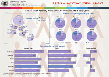 Urz¹d Statystyczny w Warszawie ul. 1 Sierpnia 21, 02-134 Warszawa tel.: 22 464 20 85 faks 22 846 78 32 e-mail: [email protected] http://warszawa.stat.gov.pl 11 LIPCA — ŒWIATOWY DZIEÑ LUDNOŒCI Ludnoœæ i ruch naturalny Warszawy na tle wybranych stolic europejskich Ludnoœæ wed³ug biologicznych grup wieku POLSKA Warszawa Ludnoœæ stolicy a w tys. Warszawa Bratys³awa na 1 km2 19,0% 14,7% 16,6% 14,7% Budapeszt 19,4% 13,3% 1744 3372 CZECHY Praga a 1267 2555 AUSTRIA d Wiedeñ 1840 4434 66,3% 68,7% 67,3% Praga Sofia Wiedeñ 18,4% 14,9% 16,8% 13,9% 16,7% 14,4% S£OWACJA Bratys³awaa 423 1146 WÊGRY Budapeszt c 1758 3347 BU£GARIA Sofiaa b 66,7% 1320 2926 69,3% Grupy wieku: Ruch naturalny na 1000 ludnoœci Bratys³awa Warszawa Wiedeñ 65 lat i wiêcej e Przyrost naturalny 9,9 12,6 9,2 2,7 12,4 Praga Sofia 15–64 0–14 lat Zgony Urodzenia ¿ywe Budapeszt 69,0% 1,9 9,8 11,7 10,2 11,9 11,4 11,0 a Stan w dniu 31.12.2015 r. b Zespó³ miejski. c Stan w dniu 01.01.2015 r. d Stan w dniu 01.01.2016 r. e Dane za 2015 r. r ó d ³ o: dane ze stron internetowych urzêdów statystycznych poszczególnych pañstw. -3,2 10,7 9,1 -1,7 0,8 1,9