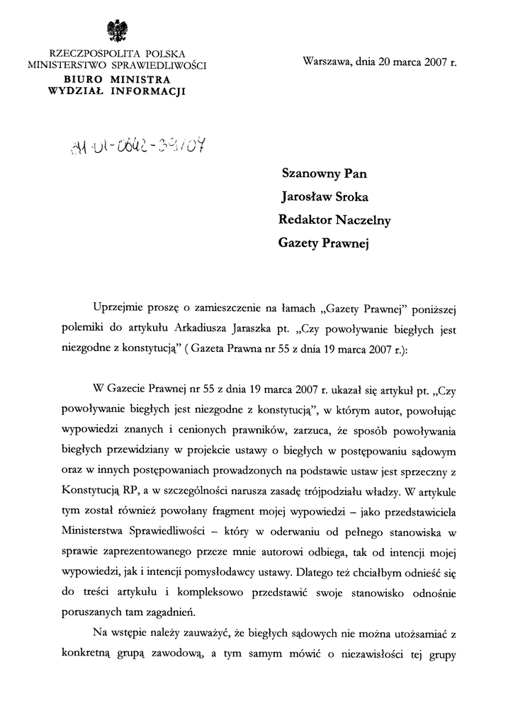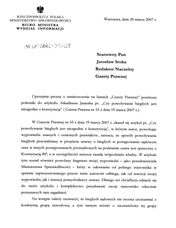 • RZECZPOSPOLITA POLSKA MINISTERSTWO SPRAWIEDLIWOŚCI BIURO WYDZIAŁ Warszawa, dnia 20 marca 2007 r. MINISTRA INFORMACJI Szanowny Pan Jarosław Sroka Redaktor Naczelny Gazety Prawnej Uprzejmie prosz~ o zamieszczenie na łamach "Gazety Prawnej" poniższej polemiki do artykułu Arkadiusza ]araszka pt. "Czy powoływanie biegłych jest niezgodne z konstytucją" ( Gazeta Prawna nr 55 z dnia 19 marca 2007 r.): W Gazecie Prawnej nr 55 z dnia 19 marca 2007 r. ukazał si~ artykuł pt. "Czy powoływanie biegłych jest niezgodne z konstytucją", w którym autor, powołując wypowiedzi znanych i cenionych prawników, zarzuca, że sposób powoływania biegłych przewidziany w projekcie ustawy o biegłych w post~powaniu sądowym oraz w innych post~powaniach prowadzonych na podstawie ustaw jest sprzeczny z Konstytucją RP, a w szczególności narusza zasad~ trójpodziału władzy. W artykule tym został również powołany fragment mojej wypowiedzi - jako przedstawiciela Ministerstwa Sprawiedliwości - który w oderwaniu od pełnego sprawie zaprezentowanego stanowiska w przeze mnie autorowi odbiega, tak od intencji mojej wypowiedzi, jak i intencji pomysłodawcy ustawy. Dlatego też chciałbym odnieść si~ do treści artykułu i kompleksowo przedstawić swoje stanowisko odnośnie poruszanych tam zagadnień. N a wst~pie należy zauważyć, że biegłych sądowych nie można utożsamiać z konkretną grupą zawodową, a tym samym mówić o niezawisłości tej grupy 2 zawodowej lub jej podporządkowaniu władzy wykonawczej. Biegli wywodzą si~ z tak licznych grup zawodowych bądź środowisk naukowych, jak liczne prezentują specjalizacje właśnie jako biegli sądowi. Mówienie o nich jako o grupie zawodowej w kontekście niezależności od władzy wykonawczej sugeruje, że mamy do czynienia z kolejną - obok s~dziów - grupą zawodową wykonującą w Polsce władz~ sądowniczą. Tymczasem biegli sądowi to m.l1l. lekarze, pracownicy dydaktyczni czy naukowi zatrudniani na umowy o prac~, pobierający granty i stypendia czy sponsorowani w swojej działalności naukowej przez prywatne przedsi~biorstwa. Już sam ten fakt sprawia, że nie są to ludzie w pełni niezależni i niezawiśli. Dużo bardziej prawdopodobne poszczególnych jest zatem, że naciski na biegłych w sprawach wywierać b~dą ich pracodawcy lub sponsorzy (takie zagrożenie istnieje i w obecnym stanie prawnym), a nie Minister Sprawiedliwości. Nie oznacza to jednak, że biegli sądowi zwolnieni są z obowiązku wydawania w sprawie sądowej bezstronnych i rzetelnych opinii, tyle że gwarancją uczciwości procesów z udziałem biegłych nie jest ich niezależność, ale niezawisłość sądu, który opini~ biegłego sądowego ocenia jak każdy inny dowód w sprawie, także pod wzgl~dem jego wiarygodności i obiektywizmu. W przypadku, gdy sąd dojdzie do przekonania (sam lub na zarzut strony), że dany biegły może być nieobiektywny lub może podlegać naciskom, ma prawo powołać innego biegłego. Trzeba w tym rrueJscu zaprzeczyć, by projektowana ustawa zabraniała sądom powoływania biegłych spoza listy Ministra Sprawiedliwości. Dopuszcza ona taką możliwość zastrzegając jednak, by ograniczać to do przypadków szczególnych, a nie by stało si~ to zasadą. O tym czy mamy do czynienia z przypadkiem każdorazowo szczególnym, decydować ma niezawisły sąd i w tym zakresie ustawa nie czyni już żadnych ograniczeń. Niewątpliwie przypadkiem szczególnym może być podejrzenie wywierania na biegłego nacisku ze strony ministra, brak na liście biegłego o określonej specjalności, czy wreszcie przeciążenie biegłych umieszczonych na liście powodujące nadmierne wydłużenie czasu oczekiwania na opini~. 3 Dodatkowo niezależność biegłych przy wykonywaniu swoich czynności ma umocnić nadanie im przez projektowaną ustaw~ ochrony przysługującej funkcjonariuszowi publicznemu. Trzeba również dodać, że w wielu przypadkach istnienie krajowej listy biegłych może skrócić czas niezb~dny do uzyskania określonej opinii. W obecnym stanie prawnym jeżeli sąd zamierza zwrócić si~ o opini~ do biegłego sądowego lub instytutu naukowego znajdującego si~ na liście prezesa innego sądu okr~gowego, musi wszczynać procedur~ tzw. pomocy prawnej i zwracać si~ do biegłego za pośrednictwem właściwego miejscowo sądu. Według projektowanych rozwiązań każdy sąd b~dzie mógł wyst~pować do biegłego z listy bezpośrednio. Nie zgadzam si~ również z sugestią, że Minister Sprawiedliwości b~dzie autorytatywnie oceniał prac~ biegłych i decydował o ich wpisaniu bądź wykreśleniu z listy. Ocena jakości pracy biegłego dokonywana Kwalifikacyjną, a to ma na celu podniesienie b~dzie przez Komisj~ jakości tej pracy i weryfikacj~ umiej~tności biegłego, co w obecnym rozwiązaniu praktycznie jest niemożliwe (prezes sądu powołujący obecnie biegłych nie ma bowiem dostatecznej wiedzy by zweryfikować ich umiej~tności). Ponadto decyzja Ministra Sprawiedliwości w przedmiocie umieszczenia lub wykreślenia biegłego z listy b~dzie zaskarża1na do Sądu Administracyjnego. Ministerstwo Sprawiedliwości przygotowując projekt ustawy o biegłych [...] uważnie zapoznało środowisk. Nie niekonstytucyjności si~ ze wszystkimi otrzymanymi opiniami zainteresowanych podzieliło jednak poglądów niektórych Op1nll co do przyj~tych rozwiązań i sugestii odmiennego ukierunkowania projektowanych zmian. S~dzia Sławomir Różycki Ministerstwo Sprawiedliwości Wydział Informacji