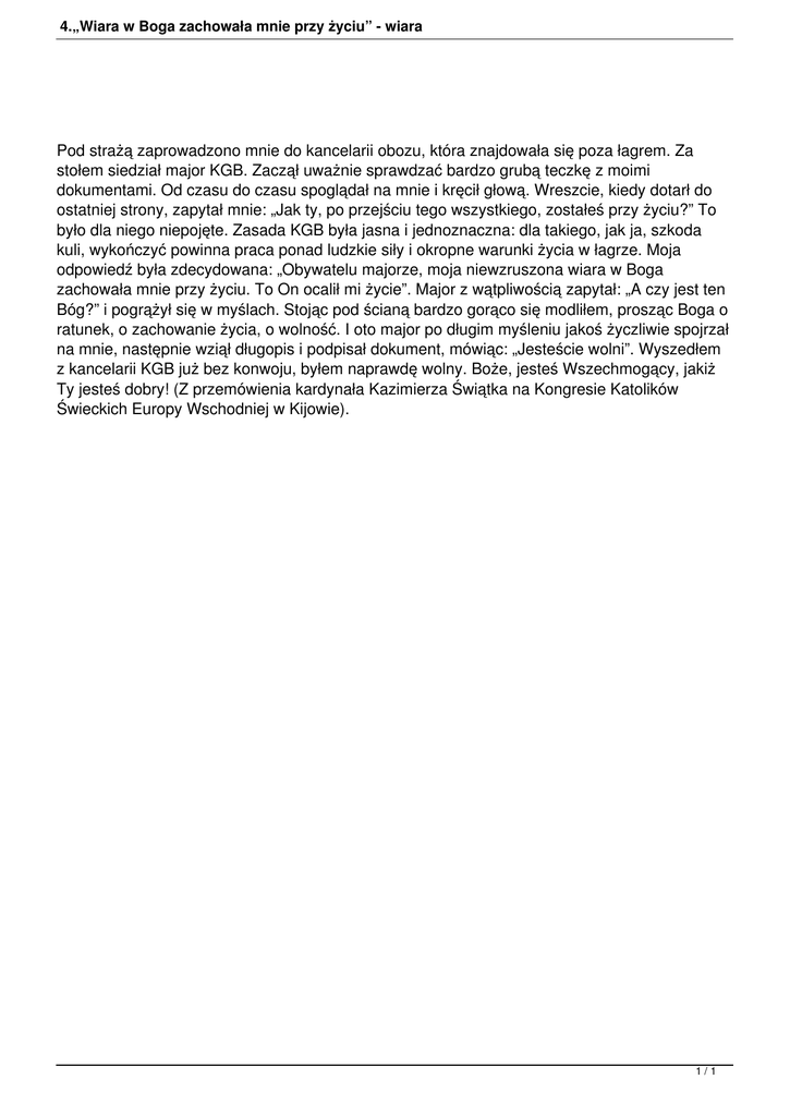 4.„Wiara w Boga zachowała mnie przy życiu” - wiara Pod strażą zaprowadzono mnie do kancelarii obozu, która znajdowała się poza łagrem. Za stołem siedział major KGB. Zaczął uważnie sprawdzać bardzo grubą teczkę z moimi dokumentami. Od czasu do czasu spoglądał na mnie i kręcił głową. Wreszcie, kiedy dotarł do ostatniej strony, zapytał mnie: „Jak ty, po przejściu tego wszystkiego, zostałeś przy życiu?” To było dla niego niepojęte. Zasada KGB była jasna i jednoznaczna: dla takiego, jak ja, szkoda kuli, wykończyć powinna praca ponad ludzkie siły i okropne warunki życia w łagrze. Moja odpowiedź była zdecydowana: „Obywatelu majorze, moja niewzruszona wiara w Boga zachowała mnie przy życiu. To On ocalił mi życie”. Major z wątpliwością zapytał: „A czy jest ten Bóg?” i pogrążył się w myślach. Stojąc pod ścianą bardzo gorąco się modliłem, prosząc Boga o ratunek, o zachowanie życia, o wolność. I oto major po długim myśleniu jakoś życzliwie spojrzał na mnie, następnie wziął długopis i podpisał dokument, mówiąc: „Jesteście wolni”. Wyszedłem z kancelarii KGB już bez konwoju, byłem naprawdę wolny. Boże, jesteś Wszechmogący, jakiż Ty jesteś dobry! (Z przemówienia kardynała Kazimierza Świątka na Kongresie Katolików Świeckich Europy Wschodniej w Kijowie). 1/1