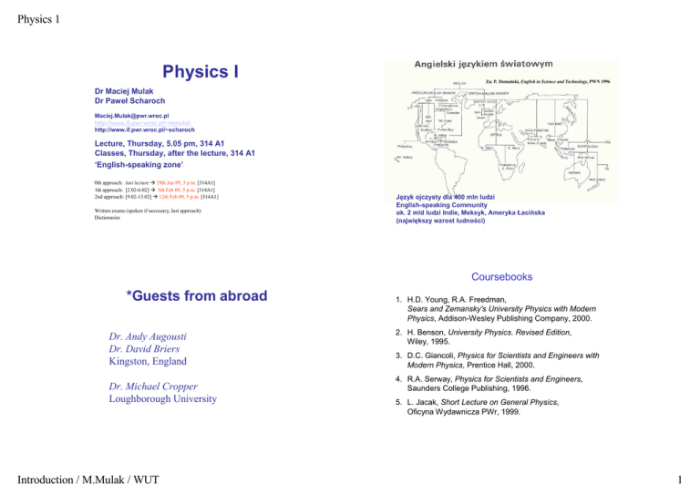 Physics 1 Physics I Za: P. Domański, English in Science and Technology, PWN 1996 Dr Maciej Mulak Dr Paweł Scharoch [email protected] http://www.if.pwr.wroc.pl/~mmulak http://www.if.pwr.wroc.pl/~scharoch Lecture, Thursday, 5.05 pm, 314 A1 Classes, Thursday, after the lecture, 314 A1 ‘English-speaking zone’ 0th approach: last lecture 29th Jan 09, 5 p.m. [314A1] 1th approach: [2.02-6.02] 5th Feb 09, 5 p.m. [314A1] 2nd approach: [9.02-13.02] 12th Feb 09, 5 p.m. [314A1] Written exams (spoken if necessary, last approach) Dictionaries Język ojczysty dla 400 mln ludzi English-speaking Community ok. 2 mld ludzi Indie, Meksyk, Ameryka Łacińska (największy wzrost ludności) Coursebooks *Guests from abroad Dr. Andy Augousti Dr. David Briers Kingston, England Dr. Michael Cropper Loughborough University Introduction / M.Mulak / WUT 1. H.D. Young, R.A. Freedman, Sears and Zemansky's University Physics with Modern Physics, Addison-Wesley Publishing Company, 2000. 2. H. Benson, University Physics. Revised Edition, Wiley, 1995. 3. D.C. Giancoli, Physics for Scientists and Engineers with Modern Physics, Prentice Hall, 2000. 4. R.A. Serway, Physics for Scientists and Engineers, Saunders College Publishing, 1996. 5. L. Jacak, Short Lecture on General Physics, Oficyna Wydawnicza PWr, 1999. 1 Physics 1 Some Polish Books H.D. Young, R.A. Freedman, Sears and Zemansky's University Physics with Modern Physics, 11th Edition Addison-Wesley Publishing Company, 2004 D. Halliday, R. Resnick, J. Walker, Postawy fizyki, t. I-V, Wyd. Naukowe PWN, Warszawa 2003 (www.pwn.pl) J. Walker, Postawy fizyki. Zbiór zadań, Wyd. Naukowe PWN, Warszawa 2005. J. Orear, Fizyka, t. I-II, WNT, Warszawa 1993. P.G. Hewitt, Fizyka wokół nas, PWN, Warszawa 2000. C. Bobrowski, Fizyka - krótki kurs, WNT, Warszawa 1995. *http://www.if.pwr.wroc.pl/dydaktyka Całościowe opracowanie angielszczyzny naukowo-technicznej zasady pisania tekstów naukowo-technicznych metoda bilingwalna: pełna dwujęzyczność (wymowa, detale, dodatki) 7500 wyrazów (nauki chemiczne) Introduction / M.Mulak / WUT HYPERPHYSICS: STRONA GŁÓWNA http://hyperphysics.phy-astr.gsu.edu/hbase/hframe.html 2 Physics 1 HYPERPHYSICS: IDEA HIPERTEKSTU HyperPhysics Department of Physics & Astronomy Georgia State University 456 Science Annex, Atlanta, GA 30303 e-mail: [email protected] Rod Nave Podziękowania Introduction / M.Mulak / WUT 3