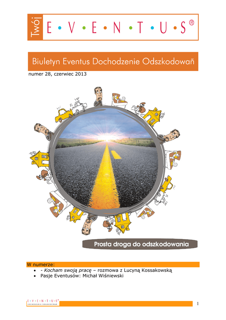 numer 28, czerwiec 2013 W numerze: - Kocham swoją pracę – rozmowa z Lucyną Kossakowską Pasje Eventusów: Michał Wiśniewski 1 BIULETYN Odszkodowania z wypadków komunikacyjnych, to jedne z najczęstszych spraw prowadzonych przez Eventus Dochodzenie Odszkodowań. Ale nie jedyne. Poszkodowany: listonosz Pies to najlepszy przyjaciel człowieka, ale także zwierzę, które nigdy nie wiadomo, jak się zachowa. Nasz klient, listonosz, w czasie pracy został pogryziony przez psa. Została mu trwała blizna. Sprawę skomplikował fakt, że właściciel czworonoga nie był ubezpieczony. Sprawa jest w toku. – Z tego powodu sprawy dochodziliśmy indywidualnie. Chociaż chciał on zawrzeć ugodę, poszkodowany się na nią nie zgodził. W tej chwili rozważana jest kwestia ewentualnego odszkodowania sądowego – mówi Wojciech Kloska, dyrektor departamentu likwidacji szkód w Eventus Dochodzenie Odszkodowań. Sprawa jest w toku. Na drodze O tym, do czego prowadzi bezmyślność ludzi, przekonała się nasza klientka. Korzystając z wiosennej pogody, wybrała się na wycieczkę rowerową. Na drodze stanęła jej jednak…. koza, przywiązana na łańcuchu obok gospodarstwa agroturystycznego i jednocześnie koło szosy. Zwierzę przeszło na drugą stronę drogi, ciągnąc za sobą łańcuch. Poszkodowana nie zauważyła słabo widocznej przeszkody, co skończyło się dla niej złamaniami i potłuczeniami. Eventus Dochodzenie Odszkodowań ustalił, że gospodarstwo do którego należało pechowe zwierzę, nie posiada polisy OC. Następnie zwrócił się do Ubezpieczeniowego Funduszu Gwarancyjnego. Okazało się jednak, że gospodarstwo nie jest zarejestrowane jako rolne. Nie można więc było się tam ubiegać o ubezpieczenie. Jego właściciel nie posiadał także ubezpieczenia indywidualnego. Sprawa jest w toku. 7,5 tys. za 1% To, że nasze zdrowie jest najcenniejszą wartością – to może banalna, ale prawda. Dlatego warto walczyć o większe odszkodowanie nawet, gdy w wyniku wypadku uszczerbek na zdrowiu wynosi choćby 1%. Wypadek samochodowy, w którym ucierpiała nasza klientka, miał miejsce we wrześniu 2012 r. Od ubezpieczyciela dostała jedynie 3.000 zł. Nie zgadzając się na tak niską kwotę, zgłosiła się po pomoc do Eventus Dochodzenie Odszkodowań. Podczas postępowania sądowego powołano biegłych. Opinia ortopedy: 0% uszczerbku na zdrowiu, opinia neurologa: 2%. Mimo mało optymistycznego orzeczenia, śmiało możemy powiedzieć, że sprawa należy do wygranych. Sąd przyznał bowiem 15 tys. zł odszkodowania, czyli 7,5 tys. za każdy 1% uszczerbku na zdrowiu. Drodzy Czytelnicy! Wszystkich chętnych zapraszamy do zgłaszania nam tematów oraz osób, o których chcielibyście przeczytać na naszych łamach. Piszcie na: [email protected] Zapraszamy do współpracy! 2 BIULETYN Kocham swoją pracę Rozmowa z Lucyną Kossakowską, Kierownikiem regionu Grudziądz - Świecie Eventus Dochodzenie Odszkodowań Wieloletnie doświadczenie, pasja do pracy z poszkodowanymi. Choć pani Lucyna jest już na emeryturze i mogłaby odpoczywać z mężem w ukochanym domku w Borach Tucholskich, nie przestaje służyć klientom radą i pomocą. Nam zdradziła kilka swoich zawodowych tajemnic… - Która sytuacja zawodowa, prowadzona sprawa, była dla pani najbardziej stresująca? - Dotarcie do rodziny, w której jedna z osób uległa śmiertelnemu wypadkowi. Oczywiście świadomie odkładałam to spotkanie... Wiedziałam, że muszę się do niego bardzo dobrze przygotować nie tylko pod kątem wiedzy, ale przede wszystkim emocjonalnie. Ta rodzina doznała przecież wielkiej tragedii, utraty bliskiej osoby. Byłam świadoma tego, że spotkanie ze mną nie może jeszcze bardziej zranić tej rodziny, więc muszę to zrobić najlepiej jak potrafię. - Jak wyglądają takie przygotowania? - Zawsze staram się zdobyć jak najwięcej informacji o sprawie i klientach, żeby nie popełnić gafy, pomyłki. Jest to szczególnie ważne w przypadkach wypadków śmiertelnych. Jeśli klientem jest osoba, która uległa urazom, również muszę dbać o to, żeby wzbudzić zaufanie. Poszkodowani mają mi przecież powierzyć swoją tragedię, a ja muszę im pomóc w odzyskaniu środków umożliwiających odzyskanie zdrowa poprzez leczenie i rehabilitację. - Którą ze spraw, uważa pani za swój najwięk -szy sukces? - Sukcesem jest dla mnie każde spotkanie z klientem i przekonanie go do mnie. To, że poszkodowany przekaże mi swoją sprawę, zaufa mi. - Nie mam wątpliwości, że ta praca jest pani pasją… - Tak, jak uczenie młodych pracowników tej branży. Jest to trudna praca wymaga wielkiego zdyscyplinowania, zaangażowania, świetnej organizacji, dokształcania się. Po przekazaniu sprawy do kancelarii pozostaję w kontakcie z klientem, śledzę jego losy, zmagania w odzyskiwaniu zdrowia, a także postępy w prowadzeniu sprawy mojego klienta. Pochłania to wiele czasu, ale ja po prostu kocham to, co robię. 3 BIULETYN PO GODZINACH CZYLI PASJE EVENTUSÓW Jacy jesteśmy? Co lubimy? Jakie skrywamy w sobie pasje i czym zajmujemy się po godzinach? Chcemy, dać się poznać nie tylko od służbowej, ale także od prywatnej strony. Dzisiaj kolej na… Dwa Michały, jeden i drugi dobrze nam znany Nie ma czerwonych włosów, przekłutych uszu i na dodatek nie umie śpiewać. Sprawdziliśmy jednak. W dowodzie wyraźnie jest napisane imię: Michał, nazwisko: Wiśniewski. – I to ja byłem wcześniej na świecie! – wyjaśnia pan Michał. Tak, jak muzyk z zespołu Ich Troje jest znany z oryginalnego wyglądu i wpadających w ucho hitów, tak eventusowy Michał Wiśniewski jest znany w branży ubezpieczeniowej. I nie ma co się dziwić, bo w końcu ponad dwudziestoletnie doświadczenie robi swoje. Około 10 tysięcy przeprowadzonych spraw, tysiące klientów. W Eventus Dochodzenie Odszkodowań jako jedyny zajmuje się sprawami motoryzacyjnymi, choć nie tylko takimi. – W tej pracy najbardziej cenię k