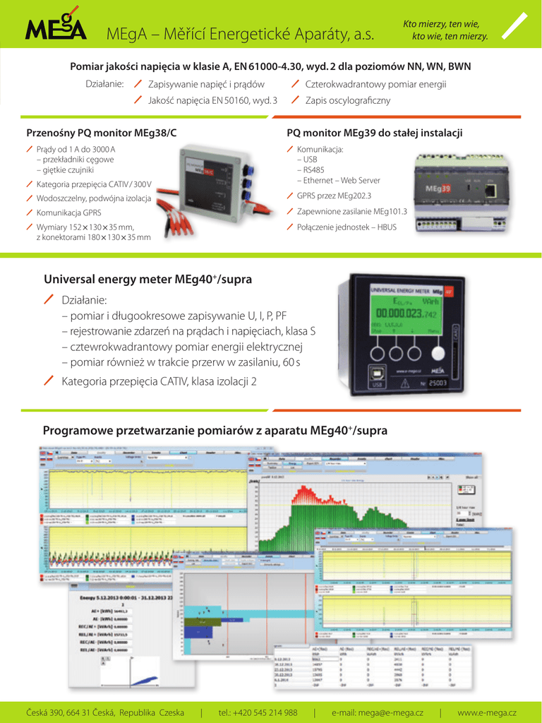 MEgA–MěřícíEnergetickéAparáty,a.s. Kto mierzy, ten wie, kto wie, ten mierzy. Pomiar jakości napięcia w klasie A, EN 61000-4.30, wyd. 2 dla poziomów NN, WN, BWN Działanie: Zapisywanienapięćiprądów Czterokwadrantowypomiarenergii JakośćnapięciaEN50160,wyd.3 Zapisoscylograficzny Przenośny PQ monitor MEg38/C Prądyod1Ado3000A –przekładnikicęgowe –giętkieczujniki PQ monitor MEg39 do stałej instalacji KategoriaprzepięciaCATIV/300V Komunikacja: –USB –RS485 –Ethernet–WebServer Wodoszczelny,podwójnaizolacja GPRSprzezMEg202.3 KomunikacjaGPRS ZapewnionezasilanieMEg101.3 Wymiary152 × 130 × 35mm, zkonektorami180 × 130 × 35mm Połączeniejednostek–HBUS Universal energy meter MEg40+/supra Działanie: –pomiaridługookresowezapisywanieU,I,P,PF –rejestrowaniezdarzeńnaprądachinapięciach,klasaS –cztewrokwadrantowypomiarenergiielektrycznej –pomiarrównieżwtrakcieprzerwwzasilaniu,60s KategoriaprzepięciaCATIV,klasaizolacji2 Programowe przetwarzanie pomiarów z aparatu MEg40+/supra Česká390,66431Česká, Republika Czeska|tel.:+420545214988|e-mail:[email protected]|www.e-mega.cz