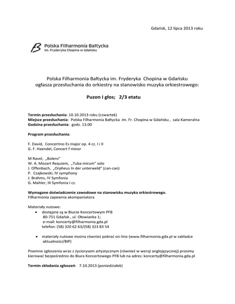 Gdaosk, 12 lipca 2013 roku Polska Filharmonia Bałtycka im. Fryderyka Chopina w Gdaosku ogłasza przesłuchania do orkiestry na stanowisko muzyka orkiestrowego: Puzon I głos; 2/3 etatu Termin przesłuchania: 10.10.2013 roku (czwartek) Miejsce przesłuchania: Polska Filharmonia Bałtycka im. Fr. Chopina w Gdaosku , sala Kameralna Godzina przesłuchania: godz. 13.00 Program przesłuchania: F. David, Concertino Es major op. 4 cz. I i II G. F. Haendel, Concert f minor M Ravel, „Bolero” W. A. Mozart Requiem, „Tuba mirum” solo J. Offenbach, „Orpheus In der unterweld” (can-can) P. Czajkowski, IV symphony J. Brahms, IV Symfonia G. Mahler, III Symfonia I cz. Wymagane doświadczenie zawodowe na stanowisku muzyka orkiestrowego. Filharmonia zapewnia akompaniatora Materiały nutowe: dostępne są w Biurze Koncertowym PFB 80-751 Gdaosk , ul. Ołowianka 1; e-mail: [email protected] telefon: (58) 320 62 63/(58) 323 83 54 materiały nutowe można również pobrad on-line (www.filharmonia.gda.pl w zakładce aktualności/BIP) Pisemne zgłoszenia wraz z życiorysem artystycznym (również w wersji anglojęzycznej) prosimy kierowad bezpośrednio do Biura Koncertowego PFB lub na adres: [email protected] Termin składania zgłoszeo: 7.10.2013 (poniedziałek)