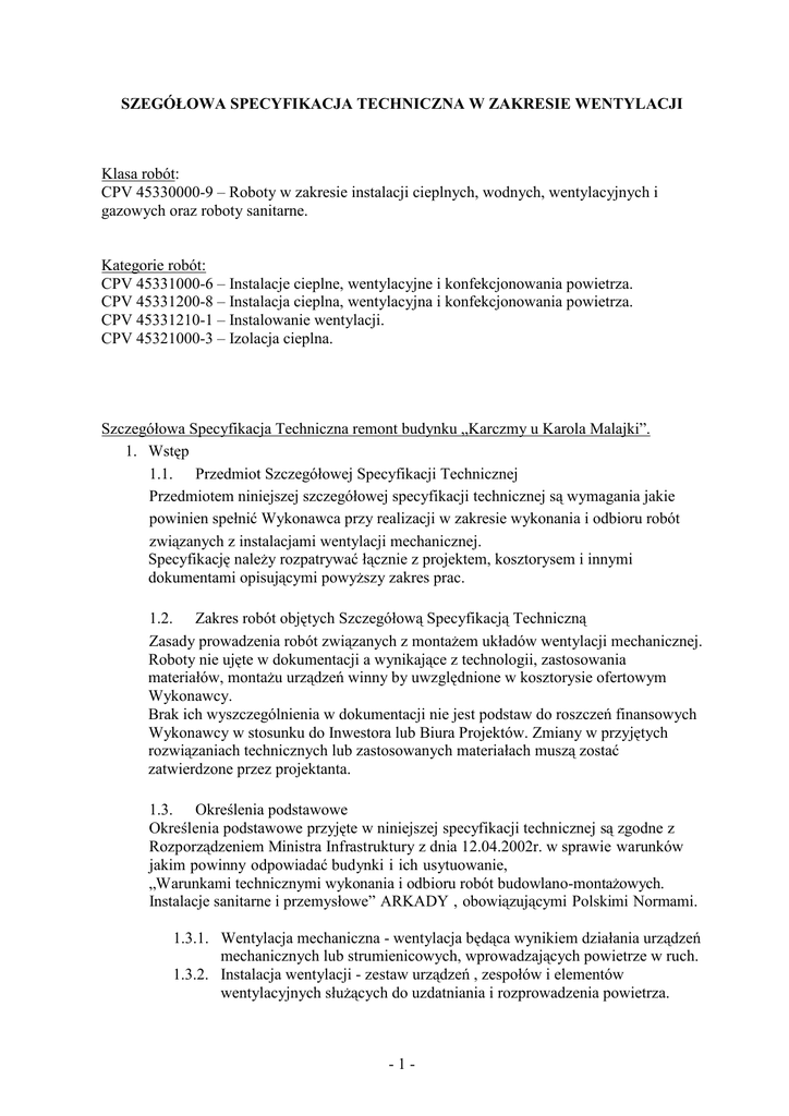 SZEGÓŁOWA SPECYFIKACJA TECHNICZNA W ZAKRESIE WENTYLACJI Klasa robót: CPV 45330000-9 – Roboty w zakresie instalacji cieplnych, wodnych, wentylacyjnych i gazowych oraz roboty sanitarne. Kategorie robót: CPV 45331000-6 – Instalacje cieplne, wentylacyjne i konfekcjonowania powietrza. CPV 45331200-8 – Instalacja cieplna, wentylacyjna i konfekcjonowania powietrza. CPV 45331210-1 – Instalowanie wentylacji. CPV 45321000-3 – Izolacja cieplna. Szczegółowa Specyfikacja Techniczna remont budynku „Karczmy u Karola Malajki”. 1. Wstęp 1.1. Przedmiot Szczegółowej Specyfikacji Technicznej Przedmiotem niniejszej szczegółowej specyfikacji technicznej są wymagania jakie powinien spełnić Wykonawca przy realizacji w zakresie wykonania i odbioru robót związanych z instalacjami wentylacji mechanicznej. Specyfikację należy rozpatrywać łącznie z projektem, kosztorysem i innymi dokumentami opisującymi powyższy zakres prac. 1.2. Zakres robót objętych Szczegółową Specyfikacją Techniczną Zasady prowadzenia robót związanych z montażem układów wentylacji mechanicznej. Roboty nie ujęte w dokumentacji a wynikające z technologii, zastosowania materiałów, montażu urządzeń winny by uwzględnione w kosztorysie ofertowym Wykonawcy. Brak ich wyszczególnienia w dokumentacji nie jest podstaw do roszczeń finansowych Wykonawcy w stosunku do Inwestora lub Biura Projektów. Zmiany w przyjętych rozwiązaniach technicznych lub zastosowanych materiałach muszą zostać zatwierdzone przez projektanta. 1.3. Określenia podstawowe Określenia podstawowe przyjęte w niniejszej specyfikacji technicznej są zgodne z Rozporządzeniem Ministra Infrastruktury z dnia 12.04.2002r. w sprawie warunków jakim powinny odpowiadać budynki i ich usytuowanie, „Warunkami technicznymi wykonania i odbioru robót budowlano-montażowych. Instalacje sanitarne i przemysłowe” ARKADY , obowiązującymi Polskimi Normami. 1.3.1. Wentylacja mechaniczna - wentylacja będąca wynikiem działania urządzeń mechanicznych lub strumienicowych, wprowadzających powietrze w ruch. 1.3.2. Instalacja wentylacji - zestaw urządzeń , zespołów i elementów wentylacyjnych służących do uzdatniania i rozprowadzenia powietrza. -1- 1.3.3. Rozdział powietrza w pomieszczeniu - rozdział powietrza w wentylowanej przestrzeni z zastosowaniem nawiewników i wywiewników, w celu zagwarantowania wymaganych warunków. 1.3.4. Wentylator - urządzenie służące do wprawiania powietrza w ruch. 1.3.5. Czerpni wentylacyjna - element instalacji, przez który jest zasysane powietrze zewnętrzne. 1.3.6. Wyrzutnia wentylacyjna - element instalacji, przez który powietrze jest usuwane na zewnątrz. 1.3.7. Filtr powietrza – zespół oczyszczający powietrze z zanieczyszczeń stałych i ciekłych. 1.3.8. Przewód wentylacyjny - element, o zamkniętym obwodzie przekroju poprzecznego, stanowiący obudowę przestrzeni, przez którą przepływa powietrze. 1.3.9. Przepustnica - Zespół samodzielny lub wbudowany w urządzenie lub w przewód wentylacyjny pozwalający na zamknięcie lub na regulację strumienia powietrza przez zmianę oporu przepływu powietrza, poziomu hałasu w strefie przebywania ludzi. 2. Materiały 2.1.1. Wszystkie materiały i urządzenia jakie mają być wbudowane muszą być zgodne z wymaganiami Polskich Norm (PN), Kodeksu Europejskiego (EN) oraz Standardami Europejskimi (ISO). Importowane materiały, urządzenia muszą posiadać certyfikat dopuszczenie do stosowania na terenie Polski. 2.1.2. Wszystkie materiały i urządzenia muszą posiadać odpowiednie atesty, deklaracje zgodności, dopuszczenia do stosowania w budownictwie. 2.1.3. Rodzaj urządzeń i materiałów został określony w projekcie. W przypadku jakichkolwiek wątpliwości wbudowywany materiał należy uzgodnić z przedstawicielem Inwestora bądź jednostką projektującą obiekt. 2.2. Materiały budowlane 2.2.1. Instalacja wentylacji mechanicznej Centrala wentylacyjna nawiewno-wywiewna z rekuperatorem Vn=1934m3/h, Vw=1869m3/h przepustnica wielopłaszczyznowa z siłownikiem 230V ze sprężyną powrotną; filtry świeżego powietrza klasy EU4 na nawiewie i EU3 na wywiewie; wymiennik krzyżowy z zabezpieczeniem przeciwzamrożeniowym; wentylator o napędzie bezpośrednim z silnikiem elektrycznym z elektroniczną komutacją; nagrzewnica elektryczna z zabezpieczeniem termicznym; centrala wyposażona jest w automatykę sterującą połączoną z pilotem 15metrowym przewodem sterowniczym; -2- Centrala wentylacyjna nawiewna Vn=905m3/h; energooszczędny wentylator o napędzie bezpośrednim z silnikiem elektrycznym z elektroniczną komutacją; filtr powietrza EU4; nagrzewnica elektryczna o mocy 12,4kW; centrala wyposażona jest w automatykę sterującą połączoną z pilotem 15metrowymprzewodem sterowniczym; Dostawa i transport oraz montaż należy przeprowadzi zgodnie z DTR urządzenia ; Centrale zabudować w sposób eliminujący maksymalnie przenoszenie drgań do konstrukcji budynku stosując gumowe wibroizolatory lub przekładki oraz na kanały stosując króćce elastyczne; Centrale wyposażyć na wlotach powietrza świeżego i wywiewanego w przepustnice powietrzno – szczelne; Wyposażenie wszystkich central w AKPiA realizuje wykonawca wentylacji; Centrale należy wyposażyć w wyłączniki serwisowe. Rozruch urządzeń ma wykona autoryzowany serwis na zlecenie i koszt Wykonawcy. Wentylator wywiewne Vw=860m3/h; Vw=75m3/h; Vw=50m3/h; Sposób zamocowania wentylatorów powinien zabezpieczać przed przenoszeniem drgań na konstrukcje budynku (przez stosowanie fundamentów, płyt amortyzacyjnych, amortyzatorów sprężynowych, amortyzatorów gumowych itp.) oraz na instalacje przez stosowanie łączników elastycznych. Amortyzatory pod wentylator należy rozmieszcza w taki sposób, aby środek ciężkości wentylatora znajdował się w połowie odległości pomiędzy amortyzatorami. Wymiary poprzeczne i kształt łączników elastycznych powinny być zgodne