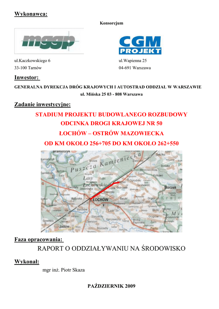 Wykonawca: Konsorcjum ul.Kaczkowskiego 6 ul.Wapienna 25 33-100 Tarnów 04-691 Warszawa Inwestor: GENERALNA DYREKCJA DRÓG KRAJOWYCH I AUTOSTRAD ODDZIAŁ W WARSZAWIE ul. Mińska 25 03 - 808 Warszawa Zadanie inwestycyjne: STADIUM PROJEKTU BUDOWLANEGO ROZBUDOWY ODCINKA DROGI KRAJOWEJ NR 50 ŁOCHÓW – OSTRÓW MAZOWIECKA OD KM OKOŁO 256+705 DO KM OKOŁO 262+550 Faza opracowania: RAPORT O ODDZIAŁYWANIU NA ŚRODOWISKO Wykonał: mgr inŜ. Piotr Skaza PAŹDZIERNIK 2009 SPIS TREŚCI 1. WPROWADZENIE ....................................................................... 6 2. CHARAKTERYSTYKA TERENU W MIEJSCU LOKALIZACJI PRZEDSIĘWZIĘCIA ............................................ 6 2.1 PołoŜenie w skali regionu, gminy i miejscowości ...................... 6 2.2 Morfologia i podział fizyczno-geograficzny terenu ..................... 7 2.3 Ogólna budowa geologiczna terenu.......................................... 7 2.4 Infrastruktura komunikacyjna.................................................... 8 2.5 Opis istniejącego zagospodarowania terenu przedsięwzięcia ........................................................................ 8 2.6 Zamierzone przedsięwzięcie w świetle planu zagospodarowania przestrzennego miasta i gminy Łochów ..................................................................................... 9 2.7 Dane meteorologiczne ............................................................ 11 3. OPIS ELEMENTÓW PRZYRODNICZYCH ŚRODOWISKA OBJĘTYCH ZAKRESEM PRZEWIDYWANEGO ODDZIAŁYWANIA PLANOWANEGO PRZEDSIĘWZIĘCIA NA ŚRODOWISKO, W TYM ELEMENTÓW ŚRODOWISKA OBJĘTYCH OCHRONĄ NA PODSTAWIE USTAWY Z DNIA 16 KWIETNIA 2004 R. O OCHRONIE PRZYRODY ............................................................................... 12 3.1 Stan czystości powierza atmosferycznego.............................. 12 3.2 Klimat akustyczny ................................................................... 13 3.3 Wody powierzchniowe ............................................................ 13 3.4 Wody podziemne .................................................................... 14 3.5 Gleba...................................................................................... 18 3.6 Opis elementów środowiska objętych ochroną na podstawie ustawy z dnia 16 kwietnia 2004 r. o ochronie przyrody objętych zakresem przewidywanego oddziaływania planowanego przedsięwzięcia oraz znajdujących się w bliskim sąsiedztwie przedsięwzięcia ......... 19 4. OPIS ISTNIEJĄCYCH W SĄSIEDZTWIE LUB W BEZPOŚREDNIM ZASIĘGU ODDZIAŁYWANIA PLANOWANEGO PRZEDSIĘWZIĘCIA ZABYTKÓW CHRONIONYCH NA PODSTAWIE PRZEPISÓW O OCHRONIE ZABYTKÓW I OPIECE NAD ZABYTKAMI ............ 28 Raport o oddziaływaniu na środowisko 5. OPIS PLANOWANEGO PRZEDSIĘWZIĘCIA ........................... 28 5.1 Charakterystyka całego przedsięwzięcia – wariant proponowany przez wnioskodawcę (wariant I)........................ 28 5.2 Warunki uŜytkowania terenu w fazie budowy i eksploatacji przedsięwzięcia ................................................... 30 5.3 Przewidywane wielkości emisji wynikające z funkcjonowania przedsięwzięcia ............................................. 31 5.4 Prognozowane natęŜenie ruchu.............................................. 31 6. OPIS ANALIZOWANYCH WARIANTÓW, W TYM: A) WARIANTU PROPONOWANEGO PRZEZ WNIOSKODAWCĘ ORAZ RACJONALNEGO WARIANTU ALTERNATYWNEGO WARIANTU B) NAJKORZYSTNIEJSZEGO DLA ŚRODOWISKA..................... 32 7. OPIS PRZEWIDYWANYCH SKUTKÓW DLA ŚRODOWISKA W PRZYPADKU NIEPODEJMOWANIA PRZEDSIĘWZIĘCIA .................................................................. 34 8. OKREŚLENIE PRZEWIDYWANEGO ODDZIAŁYWANIA NA ŚRODOWISKO ANALIZOWANYCH WARIANTÓW, W TYM RÓWNIEś W WYPADKU WYSTĄPIENIA POWAśNEJ AWARII PRZEMYSŁOWEJ, A TAKśE MOśLIWEGO TRANSGRANICZNEGO ODDZIAŁYWANIA NA ŚRODOWISKO .................................................................... 35 8.1 Faza realizacji inwestycji......................................................... 35 8.1.1 Wpływ na wody podziemne ............................................................35 8.1.2 Wpływ na wody powierzchniowe ...................................................36 8.1.3 Wpływ na powietrze.........................................................................37 8.1.4 Wpływ na klimat akustyczny...........................................................37 8.1.4.1 Wstęp .................................................................................................. 37 8.1.4.2 Identyfikacja źródeł emisji hałasu i ich lokalizacja ................................ 38 8.1.4.3 Charakterystyka obszaru objętego oddziaływaniem przedsięwzięcia.................................................................................... 38 8.1.4.4 Określenie skali oddziaływania akustycznego przedsięwzięcia ............ 39 8.1.5 Wpływ w zakresie gospodarki odpadami ......................................40 8.1.6 Wpływ projektowanego przedsięwzięcia na kopaliny ..................42 8.1.7 Wpływ na obszary podlegające ochronie na podstawie ustawy z dnia 16 kwietnia 2004r. o ochronie przyrody................42 8.1.8 Analiza i ocena moŜliwych zagroŜeń i szkód dla zabytków chronionych na podstawie przepisów o ochronie zabytków i opiece nad zabytkami, w szczególności zabytków archeologicznych, w obrębie terenu, na którym ma być realizowane przedsięwzięcie .............................................49 3 Raport o oddziaływaniu na środowisko 8.2 Faza eksploatacji .................................................................... 50 8.2.1 Oddziaływanie na wody podziemne i powierzchniowe ................50 8.2.1.1 Sposób odprowadzenia wód opadowych do środowiska...................... 50 8.2.1.2 Powierzchnia zlewni projektowanego systemu odwodnienia, ilość wód opadowych ........................................................................... 50 8.2.1.3 Wymagania dotyczące ja