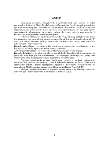 WSTĘP Monitoring zawodów deficytowych i nadwyżkowych jest jednym z zadań zawartych w Krajowym Planie Działań na rzecz Zatrudnienia. Przede wszystkim powinien być wykorzystywany jako narzędzie w celu określenia kierunków kształcenia i szkoleń organizowanych przez urzędy pracy na rzecz osób bezrobotnych. W tym celu należy systematycznie obserwować zachodzące zmiany dotyczące potrzeb pracodawców i kierunku rozwoju gospodarczego danego regionu. Jednym z elementów wpływających na właściwą realizację polityki rynku pracy jest systematycznie prowadzony monitoring zawodów deficytowych i nadwyżkowych. W tym celu należy dokonać analizy bezrobocia, struktury ofert pracy oraz zawodów deficytowych i nadwyżkowych. Zawody nadwyżkowe – to takie, w których liczba bezrobotnych i poszukujących pracy jest wyższa niż liczba zgłaszanych ofert w tych zawodach. Zawody zrównoważone – to te zawody, w których popyt jest równy podaży. Zawody deficytowe – to takie zawody, w których liczba bezrobotnych i poszukujących pracy nie zaspokaja potrzeb pracodawców, tzn. występuje przewaga ofert pracy nad możliwością zatrudnienia pracownika o pożądanych kwalifikacjach. Podstawą opracowania są dane statystyczne zawarte w aplikacji „Monitoring zawodów” dla powiatu olsztyńskiego. Dane i wskaźniki powstały na bazie półrocznych sprawozdań MPiPS. Raport sporządzono zgodnie z zaleceniami metodycznymi do prowadzenia MZDiN, opracowanymi przez Departament Rynku Pracy MPiPS. Niniejsze sprawozdanie będzie stanowić sprawozdanie z monitoringu zawodów deficytowych i nadwyżkowych dla powiatu za I półrocze 2013r. 2 1. ANALIZA BEZROBOCIA W POWIECIE OLSZTYŃSKIM WEDŁUG GRUP ZAWODÓW Na koniec I półrocza 2013r roku w powiecie olsztyńskim figurowało 8065 osób bezrobotnych (o 667 osoby więcej niż w analogicznym okresie roku ubiegłego), w tym 4000 kobiet. Stopa bezrobocia na koniec I półrocza 2013r. wynosiła 21,5 (w roku 2012 –19,8%). 1.1. Struktura bezrobotnych według dużych grup zawodowych (o kodzie dwucyfrowym) w I półroczu 2013 r. Struktura bezrobotnych według dużych grup zawodowych. Tabela 1 Lp 1 Kod grupy zawodów 1 2 "03" 2 "11" 3 "12" 4 "13" 5 "14" 6 "21" 7 "22" 8 "23" 9 "24" 10 "25" 11 "26" 12 "31" Bezrobotni Bezrobotne ogółem kobiety Nazwa grupy zawodów 3 Żołnierze szeregowi Przedstawiciele władz publicznych, wyżsi urzędnicy i dyrektorzy generalni Kierownicy do spraw zarządzania i handlu Kierownicy do spraw produkcji i usług Kierownicy w branży hotelarskiej, handlu i innych branżach usługowych Specjaliści nauk fizycznych, matematycznych i technicznych Specjaliści do spraw zdrowia Specjaliści nauczania i wychowania Specjaliści do spraw ekonomicznych i zarządzania Specjaliści do spraw technologii informacyjnokomunikacyjnych Specjaliści z dziedziny prawa, dziedzin społecznych i kultury Średni personel nauk fizycznych, chemicznych i technicznych 3 Bezrobotni Bezrobotni powyżej powyżej 12 m-cy - 12 m-cy razem kobiety 4 0,0157 0 5 0 6 0 7 0,2201 0,2595 0,1931 0,3817 0,4873 0,5838 0,3863 0,2862 0,3301 0,1945 0,3381 0,1908 0,2201 0,2594 0,0966 0,1908 1,3993 1,5894 0,7727 1,1449 0,3616 0,7135 0,3864 0,6679 1,8553 3,1463 1,4486 2,4809 2,4686 3,6327 1,6901 2,5762 0,3301 0,2269 0,1932 0,1908 1,8396 2,303 1,2556 1,1449 4,0093 2,2056 3,1869 1,622 13 "32" Średni personel do spraw zdrowia 0,9747 1,6866 1,159 1,9083 14 "33" Średni personel do spraw biznesu i administracji 4,1191 6,5845 3,9113 5,6295 15 "34" Średni personel z dziedziny prawa, spraw społecznych, kultury i pokrewny 1,0692 1,8487 0,8209 1,4312 16 "35" Technicy informatycy 0,4402 0,1946 0,1932 0,2863 17 "41" Sekretarki, operatorzy urządzeń biurowych i pokrewni 1,9182 3,6003 1,352 2,4809 18 "42" Pracownicy obsługi klienta 0,8805 1,4921 0,676 1,145 19 "43" Pracownicy do spraw finansowo-statystycznych i ewidencji materiałowej 1,7138 1,2001 1,5452 0,8588 20 "44" 0,3458 0,4217 0,3863 0,6679 21 22 "51" "52" 7,5157 14,3734 9,9254 27,5068 8,0637 15,8357 10,3053 29,582 23 "53" 0,959 1,849 1,4486 2,6717 24 25 26 "54" "61" "62" 0,7547 1,2577 1,2893 0,3243 1,8812 0,3244 0,5794 2,0281 1,9315 0,1908 2,9579 0,3817 27 "63" 0,2201 0,3244 0,338 0,4771 28 "71" 6,6981 0,2594 7,0981 0,1908 29 "72" 7,4841 0,2595 7,0015 0,1908 30 "73" 0,6446 0,7136 0,7245 0,7633 31 "74" 1,9026 0,0973 1,6901 0,0954 32 "75" 10,3772 10,1523 11,7336 12,6908 33 "81" 2,28 1,2 1,7383 1,0496 34 "82" 0,7233 0,1622 0,8209 0 35 "83" 3,915 0,1297 3,9112 0,0954 36 "91" 3,4276 6,6169 3,8629 7,3473 Pozostali pracownicy obsługi biura Pracownicy usług osobistych Sprzedawcy i pokrewni Pracownicy opieki osobistej i pokrewni Pracownicy usług ochrony Rolnicy produkcji towarowej Leśnicy i rybacy Rolnicy i rybacy pracujący na własne potrzeby Robotnicy budowlani i pokrewni (z wyłączeniem elektryków) Robotnicy obróbki metali, mechanicy maszyn i urządzeń i pokrewni Rzemieślnicy i robotnicy poligraficzni Elektrycy i elektronicy Robotnicy w przetwórstwie spożywczym, obróbce drewna, produkcji wyrobów tekstylnych i pokrewni Operatorzy maszyn i urządzeń wydobywczych i przetwórczych Monterzy Kierowcy i operatorzy pojazdów Pomoce domowe i sprzątaczki 4 37 "92" Robotnicy pomocniczy w rolnictwie, leśnictwie i rybołówstwie 38 "93" Robotnicy pomocniczy w górnictwie, przemyśle, budownictwie i transporcie 8,9779 3,6328 9,3675 3,9122 39 "94" Pracownicy pomocniczy przygotowujący posiłki 0,7862 1,4921 0,5311 0,9542 40 "96" Ładowacze nieczystości i inni pracownicy przy pracach prostych 1,0848 0,746 1,014 0,6679 100 100 100 100 Ogółem 0,3301 0,2595 0,2898 0,1908 Sporządzono na podstawie danych z załącznika T-II/P-1a Najwięcej osób bezrobotnych (według kodu sześciocyfrowego) było w następujących zawodach: Tabela 2 Liczba bezrobotnych w poszczególnych zawodach według grup zawodów o kodzie sześciocyfrowym. Kod zawodu Lp 1 2 3 4 5 6 7 8 9 10 11 12 13 14 15 16 17 18 19 20 21 22 23 "000000" "522301" "931301