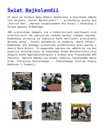 Świat Bajkolandii 21 maja na terenie Domu Pomocy Społecznej w Psarskiem odbyła się majówka „Świat Bajkolandii” – przewodnią bajką był „Piotruś Pan”, impreza zorganizowana dla dzieci i młodzieży z terenu powiatu Śremskiego. 200 uczestników zmagało się w konkurencjach sportowych oraz artystycznych. Na zwycięzców czekały bardzo ciekawe nagrody. Dodatkową atrakcją na imprezie była możliwość przejażdżki dorożką konną , koniki pochodziły ze stadniny „Konik Polski” Dodatkowo dla każdego uczestnika przewidziana była paczka z okazji Dnia Dzieck. Ta wspaniała impreza nie odbyła by się bez wsparcia wolontariuszy ze Szkolnego Klubu Wolontariusza przy Zespole Szkół Ogólnokształcących w Śremie oraz Pracowników DPS Psarskie. Impreza odbyła się dzięki wsparciu finansowemu Gminy Śrem, Starostwa Powiatowego – Powiatowego Centrum Pomocy Rodzinie i Fundacji. 21 Maja Zapraszamy na Majówkę !!! Majówka – Świat Bajkolandii Serdecznie zapraszamy na majówkę 21.05.2013 na Terenie DPS Psarskie dla dzieci i młodzieży niepełnosprawnej. Wśród wielu atrakcji znajdzie się konkurencja „Parada Przebierańców”, w której uczestnicy będą oceniani za najciekawszą aranżację indywidualnie lub grupowo tematycznie związaną z filmem ,,Piotruś Pan” oraz jak co roku konkurencje sportowe, a dla maluchów przewidziany jest kącik plastyczny, malowanie twarzy. Przewidujemy również atrakcje – niespodziankę !!! Program Majówki 2013 „Świat Bajkolandii” 21.05.2013 Teren DPS Psarskie 10 00 – 10 05 Powitanie gości i uczestników, otwarcie imprezy przez Burmistrza Śremu Pana Adama Lewandowskiego. Realizacja programu: 10 05 – 10 45 11 00 – 11 15 11 15 – 13 00 Konkurencje sportowe. 13 00 – 13 30 Obiad 13 30 – 14 00 Wręczenie nagród, zakończenie. Parada przebierańców. II śniadanie Atrakcje towarzyszące: Kącik artystyczny „Świat Bajkolandii”, Przejażdżki konne. Impreza została sfinansowana z budżetu gminy Śrem, PCPR, Fundacji na Rzecz Rewaloryzacji miasta Śrem Majówka – Świat Bajkolandii Serdecznie zapraszamy na majówkę 21.05.2013 na Terenie DPS Psarskie dla dzieci i młodzieży niepełnosprawnej. Wśród wielu atrakcji znajdzie się konkurencja „Parada Przebierańców”, w której uczestnicy będą oceniani za najciekawszą aranżację indywidualnie lub grupowo tematycznie związaną z filmem ,,Piotruś Pan” oraz jak co roku konkurencje sportowe, a dla maluchów przewidziany jest kącik plastyczny, malowanie twarzy. Przewidujemy również atrakcje – niespodziankę !!! Program Majówki 2013 „Świat Bajkolandii” 21.05.2013 Teren DPS Psarskie 10 00 – 10 05 Powitanie gości i uczestników, otwarcie imprezy przez Burmistrza Śremu Pana Adama Lewandowskiego. Realizacja programu: 10 05 – 10 45 11 00 – 11 15 11 15 – 13 00 Konkurencje sportowe. 13 00 – 13 30 Obiad 13 30 – 14 00 Wręczenie nagród, zakończenie. Parada przebierańców. II śniadanie Atrakcje towarzyszące: Kącik artystyczny „Świat Bajkolandii”, Przejażdżki konne. Impreza została sfinansowana z budżetu gminy Śrem, PCPR, Fundacji na Rzecz Rewaloryzacji miasta Śrem Koniec ferii Dnia 25.01.2013 w świetlicy odbyły się ostatnie zajęcia oraz podsumowanie cyklu spotkań w ramach ferii zimowych. Zajęcia odbywały się zgodnie z określonym programem, który w pełni udało się zrealizować. Na zakończenie uczestnicy otrzymali dyplomy jak i również słodki upominek. Ferie zostały sfinansowane z budżetu gminy Śrem Spotkanie z Alpinistą Dnia 23.01.2013 w ramach zajęć na świetlicy na specjalne zaproszenie dzieci odwiedził szczególny gośc- Pan Marcin Helak. Jest to alpinista-zdobywca wielu szczytów. Dzieci wysłuchały prelekcji, a także obejrzały wiele zdjęć z jego wypraw. Opowiadał im o swoich marzeniach jak i wielu poświęceniach, które towarzyszyły mu w drodze do realizowania swoich marzeń.Zaprezentował pełny strój alpinisty kolejno opisując poszczególne części. Dzieci uczyły się także jaki jest niezbędny sprzęt potrzebny przy tego rodzaju wyprawach jak i również poznały zasady bezpieczeństwa. Zajęcia te cieszyły się ogromnym zainteresowaniem. TEATR Podczas ferii zimowych dla dzieci uczęszczających na zajęcia do świetlicy została zorganizowana wycieczka do Gniezna. Głównym punktem programu był wyjazd do teatru na sztukę dla dzieci pt.,,Gelsomino w krainie kłamczuchów”. Po obejrzeniu przedstawienia dzieci zwiedzały miasto w tym Katedrę. Wycieczka była sfinansowana z budżetu gminy Śrem Dzień Babci i Dziadka Dnia 18.01.2013 w świetlicy zorganizowany został Dzień Babci i Dziadka. Dzieci w ramach zajęć podczas ferii przygotowywały się do występu, który zaprezentowały podczas tej uroczystości. W programie było przedstawienie pt. ,,Dziewczynka z zapałkami” a także kilka piosenek skierowanych do zaproszonych gości. Każde dziecko przygotowało również drobny upominek, który wręczyło swoim dziadkom. Po występach dzieci odbyło się karaoke, w którym uczestniczyli Dziadkowie z wnukami jak i również wspólne zabawy. Na zakończenie przygotowany został poczęstunek. Ferie zostały sfinansowane z budżetu gminy Śrem 1 tydzień ferii za nami Oprócz atrakcyjnych zajęć w sali dzieci spędzają również aktywnie czas na świeżym powietrzu. Plan na Ferie 2013 FERIE 2013 termin: 14.01.2013 do 25.01.2013 godz. 9-00–15-00 w programie realizowanym podczas ferii przewidujemy: codziennie śniadanie + obiad zajęcia integracyjne gry zabawy sportowe gry i zabawy planszowe zajęcia plastyczne , manualne zajęcia teatralne zabawy na świeżym powietrzu spotkanie z bajką terapeutyczną profilaktyka uzależnień (program dla dzieci) oraz 22 Stycznia wyjazd do teatru w Gnieźnie „GELSOMINO W KRAJU KŁAMCZUCHÓW”Koszt to ubezpieczenie zaledwie 7 zł / osoba Fundacja na Rzecz Rewaloryzacji Miasta Śrem i Rada Sołecka zaprasza dzieci do udziału w fer