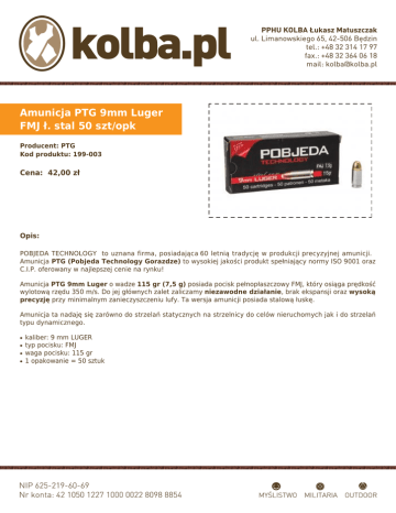 Amunicja PTG 9mm Luger FMJ ł. stal 50 szt/opk Producent: PTG Kod produktu: 199-003 Cena: 42,00 zł Opis: POBJEDA TECHNOLOGY to uznana firma, posiadająca 60 letnią tradycję w produkcji precyzyjnej amunicji. Amunicja PTG (Pobjeda Technology Gorazdze) to wysokiej jakości produkt spełniający normy ISO 9001 oraz C.I.P. oferowany w najlepszej cenie na rynku! Amunicja PTG 9mm Luger o wadze 115 gr (7,5 g) posiada pocisk pełnopłaszczowy FMJ, który osiąga prędkość wylotową rzędu 350 m/s. Do jej głównych zalet zaliczamy niezawodne działanie, brak ekspansji oraz wysoką precyzję przy minimalnym zanieczyszczeniu lufy. Ta wersja amunicji posiada stalową łuskę. Amunicja ta nadaję się zarówno do strzelań statycznych na strzelnicy do celów nieruchomych jak i do strzelań typu dynamicznego. ● ● ● ● kaliber: 9 mm LUGER typ pocisku: FMJ waga pocisku: 115 gr 1 opakowanie = 50 sztuk