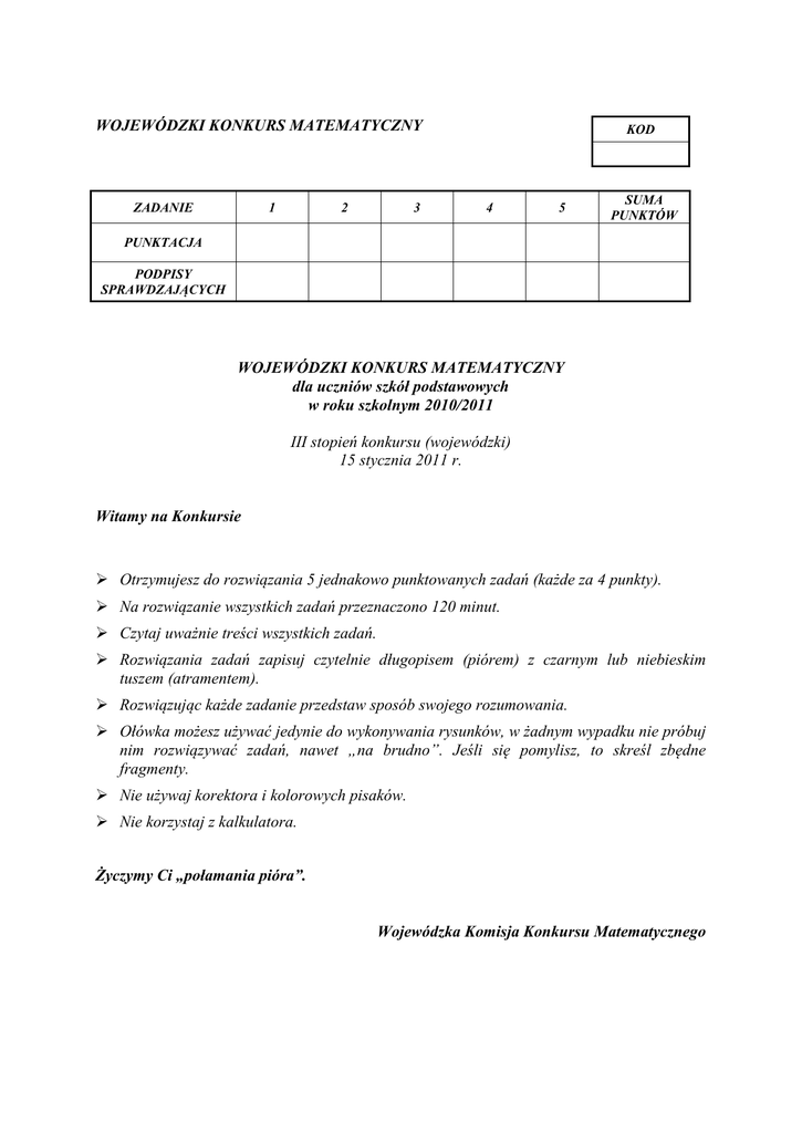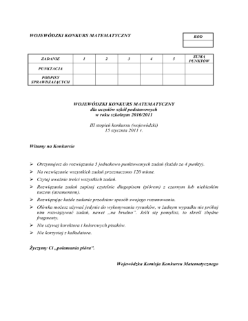WOJEWÓDZKI KONKURS MATEMATYCZNY ZADANIE 1 2 3 KOD 4 5 SUMA PUNKTÓW PUNKTACJA PODPISY SPRAWDZAJĄCYCH WOJEWÓDZKI KONKURS MATEMATYCZNY dla uczniów szkół podstawowych w roku szkolnym 2010/2011 III stopień konkursu (wojewódzki) 15 stycznia 2011 r. Witamy na Konkursie Otrzymujesz do rozwiązania 5 jednakowo punktowanych zadań (każde za 4 punkty). Na rozwiązanie wszystkich zadań przeznaczono 120 minut. Czytaj uważnie treści wszystkich zadań. Rozwiązania zadań zapisuj czytelnie długopisem (piórem) z czarnym lub niebieskim tuszem (atramentem). Rozwiązując każde zadanie przedstaw sposób swojego rozumowania. Ołówka możesz używać jedynie do wykonywania rysunków, w żadnym wypadku nie próbuj nim rozwiązywać zadań, nawet „na brudno”. Jeśli się pomylisz, to skreśl zbędne fragmenty. Nie używaj korektora i kolorowych pisaków. Nie korzystaj z kalkulatora. Życzymy Ci „połamania pióra”. Wojewódzka Komisja Konkursu Matematycznego Zadanie 1. Pewną niewiadomą liczbę trzycyfrową pomnożono przez drugą liczbę trzycyfrową utworzoną z tych samych cyfr, zapisanych w odwrotnej kolejności. W wyniku mnożenia otrzymano liczbę 125020. Znajdź niewiadome liczby trzycyfrowe. Przedstaw rozwiązanie. Zadanie 2. Oblicz po ilu pełnych minutach i pełnych sekundach od godziny piętnastej wskazówka minutowa minie wskazówkę godzinową po raz pierwszy przed godziną szesnastą. Przedstaw obliczenia, prowadzące do wyniku. Zadanie 3. Z naczynia zawierającego 24 l wody należy odlać dokładnie 10 l wody. Dysponujemy do tego dwoma pustymi naczyniami o pojemnościach 11 l i 5 l. Wodę możemy przelewać z naczynia do innego naczynia dowolną ilość razy. Podaj jak można osiągnąć zadany cel, ustalając kolejność czynności przelewania wody (w każdym kroku należy wskazać z którego i do którego naczynia przelewamy wodę). Zadanie 4. Siedem osób siedzi przy okrągłym stole na miejscach ponumerowanych w prawo od 1 do 7. Numery miejsc jednocześnie stanowią numery graczy. Osoby te rozgrywają pewną grę. Na początku gry każda z osób dysponowała pewną liczbą monet jednozłotowych. Pierwszy gracz miał ich największą liczbę, a każdy następny sąsiadujący z prawej miał o jedną monetę mniej. Siódmy gracz miał najmniejszą liczbę monet. Gra polega na tym, że każda osoba przekazuje graczowi sąsiadującemu z prawej strony, o jedną monetę więcej niż otrzymała od gracza sąsiadującego z lewej strony. Gra trwa do czasu gdy nie będzie możliwe kolejne przekazanie monet, zgodnie z określonymi wyżej zasadami. Grę rozpoczyna gracz numer jeden, przekazując 1 zł graczowi numer dwa. Po zakończeniu gry okazało się, siódmy gracz posiada 4 razy więcej monet od gracza numer jeden. Oblicz ile monet posiadał na początku gry każdy z graczy. Pokaż jak znalazłeś rozwiązanie. Zadanie 5. Na bokach kwadratu ABCD zaznaczono środki odpowiednio: na boku AB środek E, na boku BC środek F, na boku CD środek G i na boku DA środek H. Na odcinku poprowadzonym od punktu E do punktu F zaznaczono środek K. Jaką część kwadratu zajmują łącznie pola czworokątów: AEKH i CFKG.