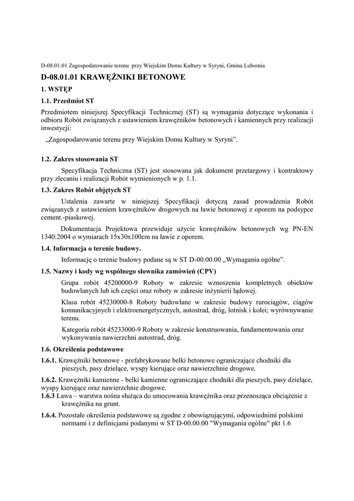 D-08.01.01 Zagospodarowanie terenu przy Wiejskim Domu Kultury w Syryni, Gmina Lubomia D-08.01.01 KRAWĘŻNIKI BETONOWE 1. WSTĘP 1.1. Przedmiot ST Przedmiotem niniejszej Specyfikacji Technicznej (ST) są wymagania dotyczące wykonania i odbioru Robót związanych z ustawieniem krawężników betonowych i kamiennych przy realizacji inwestycji: „Zagospodarowanie terenu przy Wiejskim Domu Kultury w Syryni”. 1.2. Zakres stosowania ST Specyfikacja Techniczna (ST) jest stosowana jak dokument przetargowy i kontraktowy przy zlecaniu i realizacji Robót wymienionych w p. 1.1. 1.3. Zakres Robót objętych ST Ustalenia zawarte w niniejszej Specyfikacji dotyczą zasad prowadzenia Robót związanych z ustawieniem krawężników drogowych na ławie betonowej z oporem na podsypce cement.-piaskowej. Dokumentacja Projektowa przewiduje użycie krawężników betonowych wg PN-EN 1340:2004 o wymiarach 15x30x100cm na ławie z oporem. 1.4. Informacja o terenie budowy. Informację o terenie budowy podane są w ST D-00.00.00 „Wymagania ogólne”. 1.5. Nazwy i kody wg wspólnego słownika zamówień (CPV) Grupa robót 45200000-9 Roboty w zakresie wznoszenia kompletnych obiektów budowlanych lub ich części oraz roboty w zakresie inżynierii lądowej. Klasa robót 45230000-8 Roboty budowlane w zakresie budowy rurociągów, ciągów komunikacyjnych i elektroenergetycznych, autostrad, dróg, lotnisk i kolei; wyrównywanie terenu. Kategoria robót 45233000-9 Roboty w zakresie konstruowania, fundamentowania oraz wykonywania nawierzchni autostrad, dróg. 1.6. Określenia podstawowe 1.6.1. Krawężniki betonowe - prefabrykowane belki betonowe ograniczające chodniki dla pieszych, pasy dzielące, wyspy kierujące oraz nawierzchnie drogowe. 1.6.2. Krawężniki kamienne - belki kamienne ograniczające chodniki dla pieszych, pasy dzielące, wyspy kierujące oraz nawierzchnie drogowe. 1.6.3 Ława – warstwa nośna służąca do umocowania krawężnika oraz przenosząca obciążenie z krawężnika na grunt. 1.6.4. Pozostałe określenia podstawowe są zgodne z obowiązującymi, odpowiednimi polskimi normami i z definicjami podanymi w ST D-00.00.00 "Wymagania ogólne" pkt 1.6 1.7. Ogólne wymagania dotyczące Robót Ogólne wymagania dotyczące Robót podano w ST D-00.00.00 "Wymagania ogólne" pkt 1.7. 2. MATERIAŁY 2.1. Ogólne wymagania dotyczące materiałów Ogólne wymagania dotyczące materiałów, ich pozyskiwania i składowania, podano w ST D-00.00.00 "Wymagania ogólne" pkt 2. 2.2. Stosowane materiały Dokumentacja Projektowa przewiduje użycie następujących materiałów: – krawężniki betonowe spełniające wymagania wg PN-EN 1340:2004, – piasek na podsypkę i do zapraw, – cement powszechnego użytku CEM1 wg PN-EN 197-1:2000, – woda, – materiały do wykonania ławy pod krawężniki. 2.3. Krawężniki - wymagania techniczne 2.3.1. Krawężniki betonowe Do obramowania jezdni należy stosować krawężniki betonowe drogowe jednowarstwowe o wymiarach 15x30x100cm spełniające wymagania wg PN-EN 1340:2004 2.3.2.Krawężniki kamienne W zatokach autobusowych zastosowane są krawężniki kamienne o wymiarach 20x35cm wg BN-62/6716-04 2.3.3. Dopuszczalne wady i uszkodzenia krawężników Powierzchnie krawężników betonowych powinny być bez rys, pęknięć i ubytków betonu, o fakturze z formy lub zatartej. Krawędzie elementów powinny być równe i proste. . Dopuszczalne odchyłki wymiarów nominalnych nie powinny przekraczać: - długość: ±1% z dokładnością do milimetra, nie mniej niż 4mm i nie więcej niż 10mm, - wysokość i szerokość: ±5%z dokładnością do milimetra, nie mniej niż 3mm i nie więcej niż10mm 2.3.4. właściwości fizyczne i mechaniczne Krawężniki powinny spełniać wymagania określone w tablicy 2 . Tablica 2. Cechy fizyczne i mechaniczne krawężników betonowych klasy 3 wg PN-EN 1340:2004[1] Lp. 1 Cechy Wartość Odporność na zamrażanie/rozmrażanie z udziałem soli odladzających : ≤1,0 >1,5 2 - ubytek masy po badaniu :średnio[kg/m ] 2 - przy czym pojedynczy wynik [kg/m ] 2 Wytrzymałość na zginanie: ≥6,0 - wytrzymałość charakterystyczna [MPa] ≥4,8 - wytrzymałość minimalna[MPa] 3 Odporność na ścieranie[mm] 4 Odporność na poślizg/poślizgnięcie ≤23 Przez cały okres użytkowania 2.3.5 Składowanie Krawężniki betonowe mogą być przechowywane na składowiskach otwartych, posegregowane według typów, rodzajów, odmian, gatunków i wielkości. Krawężniki betonowe należy układać z zastosowaniem podkładek i przekładek drewnianych o wymiarach: grubość 2,5 cm, szerokość 5 cm, długość min. 5 cm większa niż szerokość krawężnika. Dopuszcza się składowanie krawężników prostych w kilku warstwach, przy zastosowaniu drewnianych podkładek pomiędzy poszczególnymi warstwami, przy czym suma wysokości warstw nie powinna przekraczać 1,2 m. 2.4. Materiały na podsypkę i do zapraw Piasek na podsypkę cementowo-piaskową powinien odpowiadać wymaganiom PNEN12620:2004[4],a do zaprawy cementowo-piaskowej PN-EN13139:2003. Woda zarobowa powinna spełniać wymagania zgodnie z PN-EN1008:2004. Cement na podsypkę i do zaprawy cementowo-piaskowej należy stosować powszechnego użytku CEM I, klasy nie mniejszej niż32,5wg PN-EN 197-1:2003. 2.5. Materiały na ławy Do wykonania ławy betonowej należy stosować beton klasy C12/15, wg PN-EN 2061:2003. Masa zalewowa, do wypełnienia szczelin dylatacyjnych na gorąco, powinna odpowiadać wymaganiom BN-74/6771-04 lub Aprobaty Technicznej. 3 SPRZĘT. 3.1 Ogólne wymagania dotyczące sprzętu Ogólne wymagania dotyczące sprzętu podano w ST D-00.00.00 "Wymagania ogólne" pkt 3. 3.2. Sprzęt Roboty wykonuje się ręcznie przy zastosowaniu: - betoniarek do wytwarzania betonu i zapraw oraz przygotowania podsypki cementowopiaskowej, - wibratorów płytowych, ubijaków ręcznych lub mechanicznych. 2 TRANSPORT 4.1. Ogólne wymagania dotyczące transportu Ogólne wymagania dotyczące transportu p