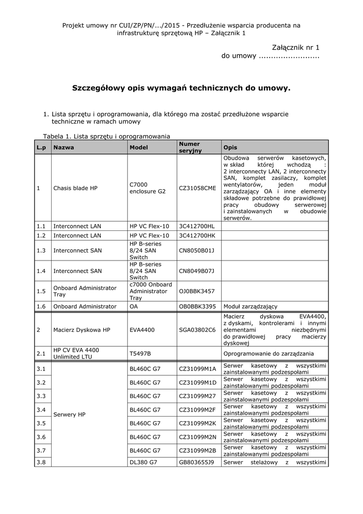 Projekt umowy nr CUI/ZP/PN/.../2015 - Przedłużenie wsparcia producenta na infrastrukturę sprzętową HP – Załącznik 1 Załącznik nr 1 do umowy ......................... Szczegółowy opis wymagań technicznych do umowy. 1. Lista sprzętu i oprogramowania, dla którego ma zostać przedłużone wsparcie techniczne w ramach umowy Tabela 1. Lista sprzętu i oprogramowania L.p Nazwa Model Numer seryjny Opis Obudowa serwerów kasetowych, w skład której wchodzą : 2 interconnecty LAN, 2 interconnecty SAN, komplet zasilaczy, komplet wentylatorów, jeden moduł zarządzający OA i inne elementy składowe potrzebne do prawidłowej pracy obudowy serwerowej i zainstalowanych w obudowie serwerów. 1 Chasis blade HP C7000 enclosure G2 CZ31058CME 1.1 Interconnect LAN HP VC Flex-10 3C412700HL 1.2 Interconnect LAN 3C412700HK 1.3 Interconnect SAN 1.4 Interconnect SAN 1.5 Onboard Administrator Tray HP VC Flex-10 HP B-series 8/24 SAN Switch HP B-series 8/24 SAN Switch c7000 Onboard Administrator Tray 1.6 Onboard Administrator OA 2 Macierz Dyskowa HP EVA4400 2.1 HP CV EVA 4400 Unlimited LTU T5497B CN8050B01J CN8049B07J OJ0BBK3457 OB0BBK3395 Moduł zarządzający SGA03802C6 Macierz dyskowa EVA4400, z dyskami, kontrolerami i innymi elementami niezbędnymi do prawidłowej pracy macierzy dyskowej Oprogramowanie do zarządzania 3.1 BL460C G7 CZ31099M1A 3.2 BL460C G7 CZ31099M1D 3.3 BL460C G7 CZ31099M27 BL460C G7 CZ31099M2F 3.5 BL460C G7 CZ31099M2K 3.6 BL460C G7 CZ31099M2N 3.7 BL460C G7 CZ31099M2B 3.8 DL380 G7 GB803655J9 3.4 Serwery HP Serwer kasetowy z wszystkimi zainstalowanymi podzespołami Serwer kasetowy z wszystkimi zainstalowanymi podzespołami Serwer kasetowy z wszystkimi zainstalowanymi podzespołami Serwer kasetowy z wszystkimi zainstalowanymi podzespołami Serwer kasetowy z wszystkimi zainstalowanymi podzespołami Serwer kasetowy z wszystkimi zainstalowanymi podzespołami Serwer kasetowy z wszystkimi zainstalowanymi podzespołami Serwer stelażowy z wszystkimi Projekt umowy nr CUI/ZP/PN/.../2015 - Przedłużenie wsparcia producenta na infrastrukturę sprzętową HP – Załącznik 1 zainstalowanymi podzespołami 3.9 DL380 G7 3.10 BL460C G7 3.11 BL460C G7 3.12 DL380 G7 3.13 DL380 G7 3.14 DL380 G7 3.15 DL380 G7 3.16 DL380 G6 3.17 DL380 G6 3.18 DL380 G6 3.19 DL380 G6 Serwer stelażowy z wszystkimi zainstalowanymi podzespołami Serwer kasetowy z wszystkimi CZ3140WDPW zainstalowanymi podzespołami Serwer kasetowy z wszystkimi CZ3140WDR6 zainstalowanymi podzespołami Serwer stelażowy z wszystkimi CZ3140WDR2 zainstalowanymi podzespołami Serwer stelażowy z wszystkimi CZ212701SY zainstalowanymi podzespołami Serwer stelażowy z wszystkimi CZ212701SX zainstalowanymi podzespołami Serwer stelażowy z wszystkimi GB803655HN zainstalowanymi podzespołami Serwer stelażowy z wszystkimi GB8949B222 zainstalowanymi podzespołami Serwer stelażowy z wszystkimi GB8949B224 zainstalowanymi podzespołami Serwer stelażowy z wszystkimi CZ2032BMG5 zainstalowanymi podzespołami Serwer stelażowy z wszystkimi CZ2032BMG6 zainstalowanymi podzespołami GB803655J2 2. Czasy reakcji i naprawy serwisowej – pakiety serwisowe Tabela 2. Ogólne czasy reakcji i czasy naprawy l.p Nazwa Czas reakcji i czas naprawy serwisowej 1 Chasis blade HP wraz z komponentami wymienionymi w tabeli 1 pkt 11.6 czas reakcji i czas naprawy nie dłuższy niż usługi producenta sprzętu oznaczone symbolem : HA105AC - komponenty sprzętowe HA107AC - oprogramowanie 2 Macierz Dyskowa HP wraz z komponentami wymienionymi w tabeli 1 pkt 22.1 3 Serwery wymienione w tabeli 1 pkt 3.13.19 czas reakcji i czas naprawy nie dłuższy niż usługi producenta sprzętu oznaczone symbolem : HA105AC - komponenty sprzętowe HA107AC - oprogramowanie czas reakcji i czas naprawy nie dłuższy niż usługi producenta sprzętu oznaczone symbolem : HA101AC - komponenty sprzętowe HA106AC - oprogramowanie 3. Tabela 3. Szczegółowe warunki obsługi serwisowej dla poszczególnych pakietów serwisowych L.p Symbol Opis warunków 1 HA101AC (sprzęt) Wsparcie w miejscu instalacji sprzętu 2 HA106AC (oprogramowanie) Dostęp do pomocy technicznej (kanał elektroniczny oraz telefoniczny) Diagnozowanie problemów z niewłaściwym działaniem sprzętu Dostarczenie części zamiennych i podzespołów Wizyta serwisanta w miejscu instalacji sprzętu w następnym dniu roboczym (pn-pt 8.00-16.00) Dostęp do pomocy technicznej od poniedziałku do piątku w godzinach 8-16 Projekt umowy nr CUI/ZP/PN/.../2015 - Przedłużenie wsparcia producenta na infrastrukturę sprzętową HP – Załącznik 1 Dostęp do nowych wersji oprogramowania (firmware, sterowniki i inne oprogramowanie dedykowane dla danego typu sprzętu) Pomoc telefoniczna oraz dokumentacja w zakresie metod wgrywania nowych wersji oprogramowania (firmware oraz inne oprogramowanie dla danego typu sprzętu) czas naprawy sprzętu : 6 godzin od zgłoszenia telefonicznego 3 HA105AC (sprzęt) Dostarczenie części zamiennych i podzespołów Diagnozowanie problemów z niewłaściwym działaniem sprzętu Wsparcie w miejscu instalacji sprzętu możliwość zgłaszania problemów 24 godziny na dobę 7 dni w tygodniu nieograniczony dostęp do pomocy technicznej (kanał elektroniczny oraz telefoniczny) dostęp do pomocy technicznej 7 dni w tygodniu 24 godziny na dobę 4 HA107AC (oprogramowanie) Dostęp do nowych wersji oprogramowania (firmware, sterowniki i inne oprogramowanie dedykowane dla danego typu sprzętu) Pomoc telefoniczna w zakresie metod wgrywania nowych wersji oprogramowania (firmware oraz inne oprogramowanie dla danego typu sprzętu) 4. Wymagania dotyczące warunków obsługi serwisowej 4.1. Zamawiający wymaga, aby oferowana przez Wykonawcę obsługa serwisowa dla poszczególnych grup sprzętu wymienionych w tabeli 2 odbywała się na zasadach nie gorszych niż usługi producenta sprzętu, których symbole dla poszczególnych grup sprzętu (obudowa serwerowa, macierz, serwery) zostały wskazane w tabeli 2 w kolumnie "czas reakcji