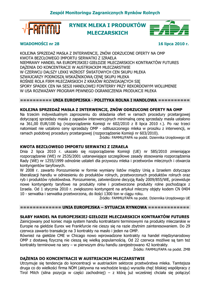 Zespół Monitoringu Zagranicznych Rynków Rolnych RYNEK MLEKA I PRODUKTÓW MLECZARSKICH WIADOMOŚCI nr 28 16 lipca 2010 r. KOLEJNA SPRZEDAś MASŁA Z INTERWENCJI, ZNÓW ODRZUCONE OFERTY NA OMP KWOTA BEZCŁOWEGO IMPORTU SERWATKI Z IZRAELA NIEMRAWY HANDEL NA EUROPEJSKIEJ GIEŁDZIE MLECZARSKICH KONTRAKTÓW FUTURES DĄśENIA DO KONCENTRACJI W AUSTRIACKIM MLECZARSTWIE W CZERWCU DALSZY LEKKI WZROST ŚWIATOWYCH CEN SKUPU MLEKA SZWAJCARZY PODNOSZĄ WSKAŹNIKOWĄ CENĘ SKUPU MLEKA ROŚNIE ROLA FIRM MLECZARSKICH Z KRAJÓW ROZWIJAJĄCYCH SIĘ SPORY SPADEK CEN NA SESJI HANDLOWEJ FONTERRY PRZY REKORDOWYM WOLUMENIE W USA ROZWAśANY PROGRAM PEWNEGO OGRANICZENIA PRODUKCJI MLEKA ========== UNIA EUROPEJSKA - POLITYKA ROLNA I HANDLOWA ========== KOLEJNA SPRZEDAś MASŁA Z INTERWENCJI, ZNÓW ODRZUCONE OFERTY NA OMP Na trzecim indywidualnym zaproszeniu do składania ofert w ramach procedury przetargowej dotyczącej sprzedaŜy masła z zapasów interwencyjnych minimalną cenę sprzedaŜy masła ustalono na 361,00 EUR/100 kg (rozporządzenie Komisji nr 602/2010 z 8 lipca 2010 r.). Po raz trzeci natomiast nie ustalono ceny sprzedaŜy OMP - odtłuszczonego mleka w proszku z interwencji, w ramach podobnej procedury przetargowej (rozporządzenie Komisji nr 603/2010). Źródło: FAMMU/FAPA na podst. Dziennika Urzędowego UE KWOTA BEZCŁOWEGO IMPORTU SERWATKI Z IZRAELA Dnia 2 lipca 2010 r. ukazało się rozporządzenie Komisji (UE) nr 585/2010 zmieniające rozporządzenie (WE) nr 2535/2001 ustanawiające szczegółowe zasady stosowania rozporządzenia Rady (WE) nr 1255/1999 odnośnie ustaleń dla przywozu mleka i przetworów mlecznych i otwarcia kontyngentów taryfowych. W 2008 r. zawarto Porozumienie w formie wymiany listów między Unią a Izraelem dotyczące liberalizacji handlu w odniesieniu do produktów rolnych, przetworzonych produktów rolnych oraz ryb i produktów rybołówstwa. Porozumienie, zatwierdzone decyzją Rady 2009/855/WE, przewiduje nowe kontyngenty taryfowe na produkty rolne i przetworzone produkty rolne pochodzące z Izraela. Od 1 stycznia 2010 r. zwiększono kontyngent na artykuł mleczny objęty kodem CN 0404 10 - serwatka i serwatka przetworzona, do ilości 1300 ton w ciągu roku. Źródło: FAMMU/FAPA na podst. Dziennika Urzędowego UE ============= UNIA EUROPEJSKA – SYTUACJA RYNKOWA ============= SŁABY HANDEL NA EUROPEJSKIEJ GIEŁDZIE MLECZARSKICH KONTRAKTÓW FUTURES Zainicjowany pod koniec maja system handlu kontraktami terminowymi na produkty mleczarskie w Europie na giełdzie Eurex we Frankfurcie nie cieszy się na razie zbytnim zainteresowaniem. Do 29 czerwca zawarto transakcje na 3 kontrakty na masło i jeden na OMP. RównieŜ na giełdzie CME w Chicago nowo wprowadzone kontrakty na handel międzynarodowy OMP z dostawą fizyczną nie cieszą się wielką popularnością. Od 22 czerwca moŜliwe są tam teŜ kontrakty terminowe na sery – w pierwszym dniu handlu zarejestrowano 42 kontrakty. Źródło: FAMMU/FAPA na podst. ZMB DĄśENIA DO KONCENTRACJI W AUSTRIACKIM MLECZARSTWIE Utrzymuje się tendencja do koncentracji w austriackim sektorze przetwórstwa mleka. Tamtejsza druga co do wielkości firma NÖM (aktywna na wschodzie kraju) wyraziła chęć bliskiej współpracy z Tirol Milch (silna pozycja w części zachodniej) – z którą juŜ wcześniej chciała się połączyć Zespół Monitoringu Zagranicznych Rynków Rolnych największa austriacka mleczarnia Berglandmilch. Rozmowy trwają pomimo faktu, Ŝe Tyrolczycy zakończyli ubiegły rok ze stratą, jak dotąd nie wyszły jednak poza sferę deklaracji prasowych. Kontynuować je jednak będzie juŜ nowe szefostwo Tirol Milch, gdyŜ dotychczasowy prezes zarządu pod koniec czerwca ustąpił ze stanowiska. Źródło: FAMMU/FAPA na podst. topagrar ================= RYNKI POZA UNIĄ EUROPEJSKĄ =============== W CZERWCU DALSZY LEKKI WZROST ŚWIATOWYCH CEN SKUPU MLEKA Publikowany przez kiloński Instytut Badań nad Gospodarką śywnościową ife indeks światowych cen skupu mleka, wzrósł w czerwcu o 1,3% do 32,20 eurocentów (za kilogram surowca o standardowych parametrach 3,7% tłuszczu i 3,4% białka). Stało się tak na skutek dalszego, 10% wzrostu cen masła, które z nadwyŜką zrekompensowały 5% spadek notowań odtłuszczonego mleka w proszku (OMP). Indeks obliczany jest bowiem w oparciu o międzynarodowe notowania podstawowych produktów mleczarskich i aktualny kurs EUR/USD. W porównaniu z czerwcem 2009 roku zwyŜka cen skupu obliczana według tej metodologii wyniosła 74%. Źródło: FAMMU/FAPA na podst. ZMB SZWAJCARZY PODNOSZĄ WSKAŹNIKOWĄ CENĘ SKUPU MLEKA Na spotkaniu pod koniec czerwca szwajcarska sektorowa organizacja BO Milch uzgodniła, Ŝe w trzecim kwartale br. wskaźnikowa cena skupu mleka w Szwajcarii zostanie podwyŜszona o niemal 5%, z 0,62 do 0,65 franka (0,45 do 0,47 euro) za litr. Uzasadnieniem jest pozytywny rozwój sytuacji na rynku i dobre widoki na przyszłość. Utrzymano jednak ceny skupu surowca, który ma trafiać do przetwórstwa na sery, poniewaŜ podwyŜka osłabiłaby zdolność konkurencyjną branŜy. Źródło: FAMMU/FAPA na podst. Agrafacts Unilever KraftFoods DFA ArlaFoods DeanFoods Fonterra FrieslandCampina Lactalis Danone Nestlé ROŚNIE ROLA FIRM MLECZARSKICH Z KRAJÓW ROZWIJAJĄCYCH SIĘ Na liście 20 największych światowych firm mleczarskich, przygotowywanej przez holenderski Rabobank, zaszły w 2009 roku pewne zmiany. JuŜ w 2008 roku na 19. pozycji znalazła się po raz pierwszy chińska mleczarnia Mengniu – która rok później przesunęła się na miejsce 16. W ub. roku tuŜ za nią wskoczyła równieŜ chińska firma Yili. W pierwszej "20", dzięki udanym fuzjom, pojawiłaby się teŜ zapewne meksykańska Grupo Lala, jednak brak dokładnych danych finansowych uniemoŜliwił formalne potwierdzenie tego awansu. To samo dotyczy brazylijskiego konglomeratu powstałego po fuzji kilku tamtejszych firm mleczarskich. NaleŜy oczekiwać, Ŝe pozycja mleczarni z krajów rozwijającyc