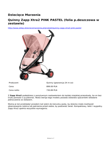 Dziecięce Marzenia Quinny Zapp Xtra2 PINK PASTEL (folia p.deszczowa w zestawie) http://www.sklep.dzieciecemarzenia.pl/produkt/quinny-zapp-xtra2-pink-pastel Producent Quinny (gwarancja 24 m-ce) Cena 899.00 PLN Cena netto 730.89 PLN Z Zapp Xtra2 podejdziesz z pozytywnym nastawieniem do każdej miejskiej przeszkody, bo on bez trudu pomoże ci ją pokonać. Nowa wersja tego modelu posiada siedzisko spacerówki składane jednocześnie ze stelażem. Można je też przekładać przodem lub tyłem do kierunku jazdy, by dziecko miało możliwość obserwowania rodzica lub patrzenia przed siebie, by podziwiać świat. Kompaktowy, lekki i wygodny. Zapp Xtra2 spełnia wszystkie wymagania. Strona 1 z 7 Strona 2 z 7 Strona 3 z 7 Strona 4 z 7 Ustawienie siedziska przodem lub tyłem do kierunku jazdy Możliwość zmiany kierunku ustawienia siedziska - wyjątkowa funkcja dla tak małego wózka. Unieś, obróć i naciśnij - tyle wystarczy, żeby zmienić ustawienie siedziska. To takie łatwe! 3 pozycje w ustawieniu przodem do kierunku i 2 pozycje w ustawieniu tyłem do kierunku jazdy Wybór 3 pozycji w ustawieniu przodem do kierunku i 2 pozycji w ustawieniu tyłem do kierunku jazdy zapewnia wyjątkowy komfort siedzenia. Niezwykle łatwy w prowadzeniu Obrotowe kółka wózka Zapp Xtra gwarantują łatwość kierowania i omijania wszelkich przeszkód w mieście. Obrotowe kółka można zablokować na trudnym terenie. Oparcie na nóżki z regulowaną wysokością Oparcie na nóżki łatwo się reguluje, dzięki czemu dziecko może spokojnie się zdrzemnąć po południu. Osłona przeciwdeszczowa Dzięki osłonie przeciwdeszczowej wózka Quinny Zapp Xtra możesz wyjść z domu bez względu na pogodę. Strona 5 z 7 Strona 6 z 7 Co znajduje się w zestawie? osłona przeciwdeszczowa, koszyk na zakupy (maks. obciążenie 5 kg), zapięcie do parasolki adaptery dla składanego nosidełka wszystkich fotelików samochodowych Maxi-Cosi lub Bébé Confort Pebble. Wiek dziecka: od urodzenia do 3,5 lat Waga dziecka: maks. 15 kg Strona 7 z 7