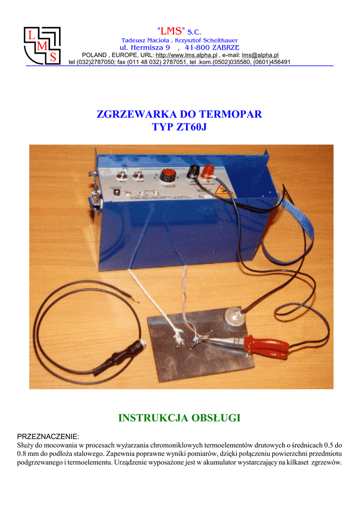 "LMS" S.C. Tadeusz Macioa , Krzysztof Scheithauer ul. Hermisza 9 , 41-800 ZABRZE POLAND , EUROPE, URL: http://www.lms.alpha.pl , e-mail: [email protected] tel (032)2787050; fax (011 48 032) 2787051, tel .kom.(0502)035580, (0601)456491 ZGRZEWARKA DO TERMOPAR TYP ZT60J INSTRUKCJA OBSŁUGI PRZEZNACZENIE: Służy do mocowania w procesach wyżarzania chromoniklowych termoelementów drutowych o średnicach 0.5 do 0.8 mm do podłoża stalowego. Zapewnia poprawne wyniki pomiarów, dzięki połączeniu powierzchni przedmiotu podgrzewanego i termoelementu. Urządzenie wyposażone jest w akumulator wystarczający na kilkaset zgrzewów. Nie dotykać gołymi rękami metalowych części obwodu wyjściowego ! Używać rękawic i okularów ochronnych ! Nie używać zgrzewarki stojąc na niewielkich powierzchniach drabin, podestów itp, gdzie wykonanie kroku w tył spowoduje upadek lub okaleczenie ! EKSPLOATACJA: [1]. Oczyścić mechanicznie (szlifierką, pilnikiem itp.) z rdzy, farby i innych zanieczyszczeń powierzchnię do której będzie zgrzewana termopara (powinna być utleniona lub zabrudzona, może być zaoliwiona - nie może być wilgotna, oszroniona) oraz miejsce kontaktu miedzianej szczotki czy magnesu (do metalicznego połysku). [2]. Odizolować szczypcami drut termoparowy na długości około 1,5 cm. [3]. Wybrać średnicę drutu przełącznikiem (φ0,5 mm ; φ0,8 mm ). Przełącznik wybiera pojemność kondensatora. [4]. Wybrać głębokość zgrzewu przełącznikiem (głębokość). Przełącznik wybiera napięcie naładowania kondensatora od ok. 45V(1) do 100V(6). [5]. Przyczepić solidnie magnes zgrzewarki albo dotknąć końcówką - szczotką, do obiektu, do którego ma być zgrzana termopara w odległości <1m od zgrzewu. [6]. Złapać końcem szczypiec drut termoparowy, tak by wystawał na długości powyżej 1cm. [7]. Załączyć zgrzewarkę przełącznikiem "ZAŁ". Zaświeci się czerwona dioda LED: "ZASIL.". [8]. Zaczekać (1...15s), aż zaświeci się niebieska dioda LED: "KONDENSATOR NAŁADOWANY" . [9]. Dotknąć końcówką termopary w miejscu zgrzewu. Poczekać sekundę na zgrzanie i ostygnięcie termopary i pozwolić za kilka sekund na impuls sprawdzający. [10]. Sprawdzić czy zgrzew jest wystarczająco wytrzymały (wytrzymałość na zerwanie co najmniej 0,5kG). Jeśli nie to powtórzyć procedurę. [11]. Drugi przewód termopary zgrzać w odległości około 3 do 10 mm od pierwszego postępując zgodnie z w/w procedurą. [12]. Po zgrzaniu grupy termopar wyłączyć zgrzewarkę przełącznikiem "WYŁ". Przykleić klejem wysoko temperaturowym termopary do obiektu w odległości kilku centymetrów od zgrzewu i podłączać drugie końce do zacisków na kablach kompensacyjnych. Dłuższe przytrzymanie zwartego obwodu powoduje przepływ impulsów prądu przez termoparę. Jest to korzystne w celu odprężenia zgrzewu, jak i jego sprawdzenia - nie powinien iskrzyć, ani odpaść. Przetwornica ładująca kondensator zgrzewarki samoczynnie startuje po każdym zgrzewie, a wyłącza się po kilku minutach bezczynności, lecz kondensator rozładowuje się przez kilka godzin. Stan oszczędnościowego wyłączenia sygnalizuje mruganie diody "ZASIL". Póki kondensator nie rozładuje się poniżej 35V, zwarcie na sekundę obwodu wyjściowego ponownie załączy przetwornicę. Jeśli dioda "ZASILanie" mruga , a przetwornica nie startuje, aby kontynuować proces zgrzewania zgrzewarkę wyłączyć na sekundę i załączyć ponownie. Poprawność zgrzewu zależy od wielu czynników, takich jak rodzaj zgrzewanych metali, wilgotność powierzchni oraz wprawność operatora. Pożądany jest trening w celu nabrania doświadczenia w zgrzewaniu. Termoparę dosuwać powoli najlepiej pod kątem ostrym lub płasko. Podobnie jak w zgrzewarkach kondensatorowych innych producentów uzyskanie mocnego zgrzewu czasami jest czasochłonne i wymaga wielu powtórzeń. Dla pospolitych stali termoparę (szczypce) łączyć do zacisku – (minus). a podłoże (magnes, szczotkę) do zacisku + (plus). Stosować odwrotne połączenie jeśli poprawia to jakość zgrzewów. Przełącznik "GŁĘBOKOŚĆ ZGRZEWU" wstępnie ustawiać na pozycji 3. Im wyższy numer (wyższe napięcie) to głębszy (mocniejszy) zgrzew. Termopara Podłoże używać maksymalnego napięcia (pozycja 6). Do zgrzewania na płasko Pamiętać, aby w czasie zgrzewania termopara nie była nigdzie podłączona (napięcie zgrzewu może spowodować uszkodzenie urządzeń elektronicznych). Nie zwierać bezpośrednio obwodu wyjściowego bez termopary. ŁADOWANIE AKUMULATORA: Stan rozładowania akumulatora sygnalizuje mruganie diody "Ładowanie akumulatora". Włożyć wtyk zasilacza prądu stałego (+ na bolcu) 18V do 24V , 1A do gniazda zgrzewarki "ŁADOWANIE" i podłączyć jego zasilanie do sieci 230V 50Hz. Zaświeci się dioda LED: "AKUMULATOR ŁADOWANIE". Stan naładowania sygnalizuje świecenie diody LED "AKUMULATOR PEŁNY". Pełne ładowanie trwa 3 godziny. Kilku minutowe ładowanie wystarcza na dokonanie kilku zgrzewów. Przy odstawieniu zgrzewarki na dłuższy czas ładować akumulator przynajmniej raz na kwartał. Zastosowano ołowiowy akumulator żelowy 12V 2Ah. Układ elektroniczny zapobiega jego przeładowaniu. Akumulator wymieniać co rok lub 300 ładowań. Jeśli zgrzewarka pracuje z rozładowanym akumulatorem czasami zadziała wewnętrzny bezpiecznik termiczny. Diody LED oprócz świecenia ciągłego sygnalizują stan pracy mruganiem. Jeśli dioda "ZASILanie" rozbłyskuje nieregularnie akumulator jest rozładowany poniżej poziomu dopuszczalnego. Zgrzewarka pozwala na silne rozładowanie akumulatora, (co w krytycznych warunkach może umożliwić wykonanie kilku brakujących zgrzewów), kosztem jej uszkodzenia (elementy wewnętrzne stają się gorące wskutek ogromnych prądów).Nie należy tego nadużywać i ładować ją natychmiast gdy zamruga dioda "ŁADOWANIE"