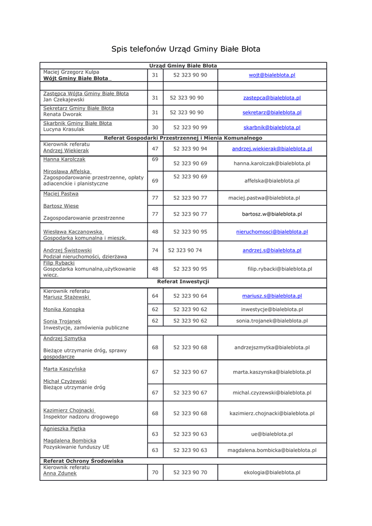 Spis telefonów Urząd Gminy Białe Błota Urząd Gminy Białe Błota Maciej Grzegorz Kulpa Wójt Gminy Białe Błota 31 Zastępca Wójta Gminy Białe Błota Jan Czekajewski 31 52 323 90 90 [email protected] Sekretarz Gminy Białe Błota Renata Dworak 31 52 323 90 90 [email protected] Skarbnik Gminy Białe Błota Lucyna Krasulak 30 52 323 90 90 52 323 90 99 [email protected] [email protected] Referat Gospodarki Przestrzennej i Mienia Komunalnego Kierownik referatu Andrzej Wiekierak 47 Hanna Karolczak 69 Mirosława Affelska Zagospodarowanie przestrzenne, opłaty adiacenckie i planistyczne Maciej Pastwa 69 52 323 90 94 [email protected] 52 323 90 69 [email protected] 52 323 90 69 [email protected] 77 52 323 90 77 [email protected] 77 52 323 90 77 [email protected] Wiesława Kaczanowska Gospodarka komunalna i mieszk. 48 52 323 90 95 [email protected] Andrzej Świstowski Podział nieruchomości, dzierżawa Filip Rybacki Gospodarka komunalna,użytkowanie wiecz. 74 Bartosz Wiese Zagospodarowanie przestrzenne 48 52 323 90 74 52 323 90 95 [email protected] [email protected] Referat Inwestycji Kierownik referatu Mariusz Stażewski 64 52 323 90 64 [email protected] Monika Konopka 62 52 323 90 62 [email protected] Sonia Trojanek Inwestycje, zamówienia publiczne 62 52 323 90 62 [email protected] 68 52 323 90 68 [email protected] 67 52 323 90 67 [email protected] 67 52 323 90 67 [email protected] 68 52 323 90 68 [email protected] 63 52 323 90 63 [email protected] 63 52 323 90 63 [email protected] 70 52 323 90 70 [email protected] Andrzej Szmytka Bieżące utrzymanie dróg, sprawy gospodarcze Marta Kaszyńska Michał Czyżewski Bieżące utrzymanie dróg Kazimierz Chojnacki Inspektor nadzoru drogowego Agnieszka Piętka Magdalena Bombicka Pozyskiwanie funduszy UE Referat Ochrony Środowiska Kierownik referatu Anna Zdunek Spis telefonów Urząd Gminy Białe Błota Karolina Gaca 36 52 323 90 82 [email protected] Jadwiga Tomaszewska Gospodarka odpadami 36 52 323 90 82 [email protected] Karolina Swoboda 50 52 323 90 96 [email protected] Monika Poliwka Ochrona środowiska 50 52 323 90 96 [email protected] Anna Kilkiewicz Księgowość opłat komunalnych 36 52 323 90 82 [email protected] Referat organizacyjny Anna Bączkowska Kontakty z organizacjami, sport i Promocja 71 52 323 90 [email protected] Mieszko Siemiński Biuro obsługi klienta 61 52 323 90 61 [email protected] Aneta Malcer Dodatki mieszkaniowe 31 52 323 90 72 [email protected] Magdalena Maison Biuro obsługi Rady Gminy 41 52 323 90 87 [email protected] 46 52 323 90 93 [email protected] Lucyna Dziamska Ewidencja ludności, kadry 53 52 323 90 93 [email protected] Marek Jakubowski Informatyk 39 52 323 90 85 [email protected] Andrzej Pasek Informatyk 66 52 323 90 66 [email protected] Renata Dworak Ewidencja ludności, PESEL Adam Ryfa Rejestracja działalności gospodarczej, 66 52 323 90 66 [email protected] kontakty z przedsiębiorcami Referat podatków i opłat lokalnych Kierownik referatu 45 52 323 90 92 [email protected] Beata Kruszka Tatiana Możdżeń Zobowiązanie od osób fizycznych ustalanie 43 52 323 90 88 [email protected] Magdalena Domagalska Zobowiązanie od osób fizycznych ustalanie 43 Wiesława Konowalska Zobowiązanie od osób fizycznych 40 52 323 90 86 [email protected] Krystyna Kołodziejczak Opłaty od środków transportowych i inne opłaty 40 52 323 90 86 [email protected] Elżbieta Pasińska Wynagrodzenia 38 52 323 90 84 52 323 90 88 [email protected] [email protected] Spis telefonów Urząd Gminy Białe Błota Aleksandra Gajewska Księgowość budżetowa 44 Gabriela Kamzelewska Księgowość budżetowa, KRUS 38 Emilia Jadomska – Bąk Księgowość budżetowa 44 52 323 90 89 [email protected] 72 52 323 90 72 [email protected] Łukasz Chmielewski Magdalena Obuchowicz Bożena Woźniak Egzekucja 73 52 323 90 89 52 323 90 84 52 323 90 73 ola.gajewskabialeblota.pl [email protected] [email protected] Urząd stanu cywilnego Skwarska Anna Kierownik USC, dowody osobiste 35 52 323 90 98 35 52 323 90 98 57 52 323 90 97 [email protected] Ryszard Gołąb Sprawy obronne, oświetlenie 37 52 323 90 83 [email protected] Joanna Rutkowska Audytor wewnętrzny 72 52 323 90 72 [email protected] Jacek Rakoczy Koncesje, profilaktyka uzależnień, Oświata Edyta Ksobiak Radca prawny [email protected] [email protected] Inne jednostki organizacyjne Marian Wiśniewski kierownik Centrum obsługi edukacji i sportu 52 349 45 04 [email protected] Księgowość Centrum obsługi edukacji i sportu 52 381 40 04 [email protected] Kierownik GOPS Gminny ośrodek pomocy społecznej tel. 52 349 44/ 04 [email protected] Sekcja świadczeń rodzinnych Gminny ośrodek pomocy społecznej 52 381 42 73 [email protected] 52 323 90 81 [email protected] Wydział komunikacji Marcin Fischer Dorota Skiba 42
