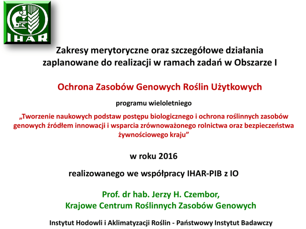 Zakresy merytoryczne oraz szczegółowe działania zaplanowane do realizacji w ramach zadań w Obszarze I Ochrona Zasobów Genowych Roślin Użytkowych programu wieloletniego „Tworzenie naukowych podstaw postępu biologicznego i ochrona roślinnych zasobów genowych źródłem innowacji i wsparcia zrównoważonego rolnictwa oraz bezpieczeństwa żywnościowego kraju” w roku 2016 realizowanego we współpracy IHAR-PIB z IO Prof. dr hab. Jerzy H. Czembor, Krajowe Centrum Roślinnych Zasobów Genowych Instytut Hodowli i Aklimatyzacji Roślin - Państwowy Instytut Badawczy Zadania Obszaru 1 Zad. 1.1. Koordynacja działań związanych z ochroną i udostępnianiem zasobów genetycznych roślin użytkowych Zad. 1.2. Gromadzenie i zachowanie w kolekcjach polowych, in vitro i kriokonserwacja, charakterystyka, ocena, dokumentacja i udostępnianie zasobów genetycznych i informacji w zakresie roślin rolniczych oraz innych roślin użytkowych, spokrewnionych dzikich gatunków i roślin towarzyszących Zad. 1.3. Gromadzenie i zachowanie w kolekcjach polowych, in vitro i kriokonserwacja, charakterystyka, ocena, dokumentacja i udostępnianie zasobów genetycznych i informacji w zakresie roślin ogrodniczych oraz innych roślin użytkowych, spokrewnionych dzikich gatunków i roślin towarzyszących Zad. 1.4. Prowadzenie centralnej długoterminowej przechowalni nasion zasobów genetycznych roślin użytkowych, prowadzenie herbarium Zad. 1.5. Prowadzenie centralnej bazy danych i udostępnianie informacji o zasobach genetycznych roślin użytkowych Zad. 1.6. Poszerzanie różnorodności gatunków i odmian roślin rolniczych i zielarskich na obszarach wiejskich oraz podnoszenie świadomości społeczeństwa w zakresie znaczenia roślinnych zasobów genowych Zad. 1.7. Poszerzanie różnorodności gatunków i odmian roślin ogrodniczych na obszarach wiejskich oraz podnoszenie świadomości społeczeństwa w zakresie znaczenia roślinnych zasobów genowych WYKONAWCY Zadania 1.1, 1.2, 1.4, 1.5 i 1.6 dotyczące zasobów roślin rolniczych i innych roślin użytkowych wykonywanych było przez IHAR-PIB; W realizacji zadnia 1.2 (prowadzone przez IHAR-PIB) uczestniczy dodatkowo 12 instytucji na podstawie zawartych umów. Zadania 1.3 i 1.7 dotyczące zasobów genowych roślin ogrodniczych realizowane są przez Instytut Ogrodnictwa w Skierniewicach. W realizacji zadnia 1.3 – (prowadzone przez IO) dodatkowo 8 instytucji na podstawie zawartych umów. Wykaz kolekcji roślin objętych Programem: Kol. roślin rolniczych: żyta, pszenicy jarej i ozimej, grochu, łubinu i seradeli, gatunków marginalnych roślin strączkowych, pszenicy twardej, pszenżyta, gryki, kukurydzy, ziemniaka, roślin zielarskich, leczniczych i aromatycznych (w tym przyprawowych), chmielu, konopi, roślin motylkowatych drobnonasiennych, łąkowo-pastwiskowych, rekultywacyjnych i energetycznych i traw Kol. roślin warzywnych (w tym cebuli, czosnku, szalotki, ogórka, roślin dyniowatych, pomidora, pietruszki, selera, kopru, fasoli, szparaga, marchwi, kapusty, kalafiora, brokuła i papryki), Kol. drzew owocowych (w tym jabłoni, gruszy, śliwy, wiśni, czereśni, brzoskwini, moreli, leszczyny i orzecha włoskiego, podkładek drzew ziarnkowych i pestkowych oraz kolekcje rzadkich gatunków roślin sadowniczych), Kol. roślin jagodowych (w tym truskawki i poziomki, maliny, jeżyny, porzeczki, agrestu, borówki wysokiej i żurawiny wielkoowocowej), winorośli, roślin ozdobnych (lilii, narcyzów, tulipanów, mieczyków i róż)i dzikich krewniaków roślin uprawnych. Kolekcja roślin dzikich pokrewnych oraz roślin towarzyszących Kolekcje obejmują: odmiany i populacje miejscowe zbierane podczas ekspedycji krajowych i w krajach sąsiedzkich oraz uzyskane w drodze wymiany, dzikie gatunki spokrewnione z roślinami uprawnymi, dziko rosnące rośliny jadalne i rośliny towarzyszące uprawom polowym, odmiany polskie skreślone z krajowego rejestru, nowe polskie odmiany zarejestrowane w COBORU oraz linie i inne materiały hodowlane polskiego pochodzenia o szczególnych cechach dla hodowli, cenne materiały zagranicznego pochodzenia stanowiące źródło poszukiwanych cech. Zad. 1.1 Koordynacja działań związanych z ochroną i udostępnianiem zasobów genetycznych roślin użytkowych 1. koordynacja i merytoryczna kontrola zadań realizowanych w ramach obszaru I Programu; 2. określenie działań w ramach obszaru I Programu i ich okresowa weryfikacja stosownie do realizacji celów ochrony zasobów genetycznych roślin użytkowych; 3. koordynacja spotkań i szkoleń prowadzonych w ramach realizacji zadań obszaru I Programu w tym: zorganizowanie spotkania koordynacyjnego z wykonawcami zadań realizowanych przez Instytut Hodowli i Aklimatyzacji Roślin PIB i Instytut Ogrodnictwa w Skierniewicach, zorganizowanie spotkania koordynacyjnego członków Rady Banku Genów i wykonawców obszaru I, zorganizowanie seminarium zdawczo-odbiorczego dla wykonawców realizujących zadania w obszarze I, przygotowanie planu szkoleń na rok 2016, regularne informowanie wykonawców o zaplanowanych spotkaniach, szkoleniach i ekspedycjach terenowych w obszarze I (Zad, 1.2 – 1.7). Zad. 1.1 - Koordynacja działań – c.d. 4. koordynacja organizacji ekspedycji terenowych i wyjazdów w ramach zobowiązań międzynarodowych, w tym przygotowanie planu ekspedycji na rok 2016 w uzgodnieniu z wykonawcami obszaru I. 5. wizytacja 4 kolekcji utrzymywanych w ramach obszaru I Programu; 6. opracowanie sprawozdań okresowych dla Ministra Rolnictwa i Rozwoju Wsi; 7. koordynacja wdrażania postanowień aktów prawnych dotyczących ochrony zasobów genetycznych roślin objętych Krajowym Programem Ochrony Zasobów Genowych Roślin Użytkowych w tym opracowanie projektu programu ochrony roślinnych zasobów genowych po roku 2020; 8. opracowywanie wytycznych w zakresie wdrażania m.in. umów i dokumentów międzynarodowych oraz kontrola realizacji zadań z nich wynikających; 9. udział w Komite