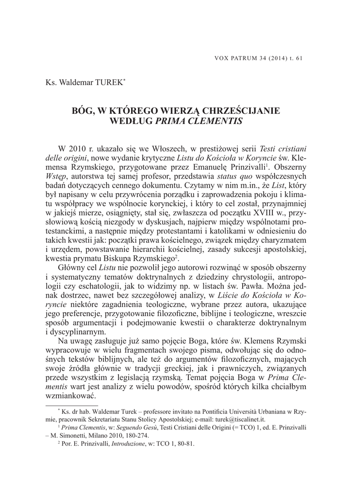 V O X PAT R U M 3 4 ( 2 0 1 4 ) t . 6 1 Ks. Waldemar TUREK* BÓG, W KTÓREGO WIERZĄ CHRZEŚCIJANIE WEDŁUG PRIMA CLEMENTIS W 2010 r. ukazało się we Włoszech, w prestiżowej serii Testi cristiani delle origini, nowe wydanie krytyczne Listu do Kościoła w Koryncie św. Klemensa Rzymskiego, przygotowane przez Emanuelę Prinzivalli1. Obszerny Wstęp, autorstwa tej samej profesor, przedstawia status quo współczesnych badań dotyczących cennego dokumentu. Czytamy w nim m.in., że List, który był napisany w celu przywrócenia porządku i zaprowadzenia pokoju i klimatu współpracy we wspólnocie korynckiej, i który to cel został, przynajmniej w jakiejś mierze, osiągnięty, stał się, zwłaszcza od początku XVIII w., przysłowiową kością niezgody w dyskusjach, najpierw między wspólnotami protestanckimi, a następnie między protestantami i katolikami w odniesieniu do takich kwestii jak: początki prawa kościelnego, związek między charyzmatem i urzędem, powstawanie hierarchii kościelnej, zasady sukcesji apostolskiej, kwestia prymatu Biskupa Rzymskiego2. Główny cel Listu nie pozwolił jego autorowi rozwinąć w sposób obszerny i systematyczny tematów doktrynalnych z dziedziny chrystologii, antropologii czy eschatologii, jak to widzimy np. w listach św. Pawła. Można jednak dostrzec, nawet bez szczegółowej analizy, w Liście do Kościoła w Koryncie niektóre zagadnienia teologiczne, wybrane przez autora, ukazujące jego preferencje, przygotowanie filozoficzne, biblijne i teologiczne, wreszcie sposób argumentacji i podejmowanie kwestii o charakterze doktrynalnym i dyscyplinarnym. Na uwagę zasługuje już samo pojęcie Boga, które św. Klemens Rzymski wypracowuje w wielu fragmentach swojego pisma, odwołując się do odnośnych tekstów biblijnych, ale też do argumentów filozoficznych, mających swoje źródła głównie w tradycji greckiej, jak i prawniczych, związanych przede wszystkim z legislacją rzymską. Temat pojęcia Boga w Prima Clementis wart jest analizy z wielu powodów, spośród których kilka chciałbym wzmiankować. Ks. dr hab. Waldemar Turek – professore invitato na Pontificia Università Urbaniana w Rzymie, pracownik Sekretariatu Stanu Stolicy Apostolskiej; e-mail: [email protected]. 1 Prima Clementis, w: Seguendo Gesù, Testi Cristiani delle Origini (= TCO) 1, ed. E. Prinzivalli – M. Simonetti, Milano 2010, 180-274. 2 Por. E. Prinzivalli, Introduzione, w: TCO 1, 80-81. * 270 KS. WALDEMAR TUREK W przypadku Listu do Kościoła w Koryncie mamy do czynienia z jednym z najstarszych, jeśli nie najstarszym, z zachowanych tekstów chrześcijańskich, które przetrwały do naszych czasów, a które nie należą do kanonu Pisma Świętego. Wątpliwe jest bowiem, w świetle współczesnych opracowań, aby inne pismo z początku chrześcijaństwa, mam na uwadze Didache, powstało wcześniej. Ponadto Prima Clementis jest jednym z najwcześniejszych tekstów chrześcijańskich, znowu jeśli nie najwcześniejszym, mających pewne pochodzenie rzymskie. O ile w odniesieniu do Listu do Hebrajczyków, Pierwszego Listu św. Piotra i więziennych listów św. Pawła, nie kończą się dyskusje dotyczące miejsca i daty powstania, Prima Clementis jest zdecydowanie osadzona w środowisku Rzymu, stanowiąc pewne źródło wiadomości o chrześcijanach zamieszkujących to miasto w końcu I wieku3. W przeżywanym Roku Wiary warto zapytać o obraz Boga przedstawiony w Prima Clementis jeszcze dla innej racji: temat ten stanowił w przeszłości raczej element jednoczący specjalistów analizujących z różnych punktów widzenia dzieło św. Klemensa. Ponieważ jednak poruszając dzisiaj jakikolwiek argument związany z Listem do Kościoła w Koryncie, wchodzimy od razu w morze opracowań, wydaje się rzeczą nieodzowną, z punktu widzenia metodologicznego, podać pewne ustalenia wstępne. Będą nas interesowały przede wszystkim tytuły, jakich w odniesieniu do Boga używa autor Listu. Chodzi o rzeczowniki: qeÒj, kÚrioj, despÒthj, pat»r, pantokr£twr, dhmiourgÒj, kt…sthj. Będziemy pytać o ich znaczenie w tradycji literackiej i w Liście do Kościoła w Koryncie, o sposób ich użycia, o wyrażaną przez nie treść. Pozwoli nam to, mamy nadzieję, nie tylko przybliżyć pojęcie Boga przedstawione w Liście, ale też osobę samego autora Listu, ciągle mało znanego i ciągle dosyć tajemniczego. Z indeksu zamieszczonego w edycji Prima Clementis przygotowanej przez Annie Jaubert wynika, że najczęściej stosowanym tytułem w odniesieniu do Boga jest qeÒj, następnie kÚrioj, despÒthj i pat»r, wreszcie pantokr£twr, dhmiourgÒj i kt…sthj4. Biorąc pod uwagę zarówno dane statystyczne jak i znaczenie dla interesującego nas pojęcia Boga, zajmiemy się bliżej czterema pierwszymi tytułami, czyli: qeÒj, kÚrioj, despÒthj, pat»r. 1. Bóg-θεός. Tytuł qeÒj odnoszony jest wyłącznie do Boga Ojca, nigdy do Jezusa Chrystusa. Pojawia się czterokrotnie już w pierwszym zdaniu Prima Clementis: „Kościół Boży (toà qeoà) w Rzymie do Kościoła Bożego (toà qeoà) w Koryncie, do tych, którzy zostali powołani i uświęceni w woli Bożej (qeoà) przez Pana naszego Jezusa Chrystusa: Niechaj Bóg wszechmogący 3 4 Por. tamże, s. 79. Por. A. Jaubert, Index des mots, w : SCh 167, Paris 1971, 240, 241, 251, 255, 262 i 263. BÓG, W KTÓREGO WIERZĄ CHRZEŚCIJANIE 271 (pantokr£toroj qeoà) użyczy wam przez Jezusa Chrystusa łaski i pokoju w obfitości!”5 Jest to jedno z tych zdań Listu, które były i są do dzisiaj najczęściej analizowane i na różne sposoby wyjaśniane. Chodzi o tak zwane praescriptum, podające nadawcę Listu, odbiorcę i pozdrowienie. Sam Bóg, qeÒj, przedstawiony jest od razu w odniesieniu do Kościoła, nazwanego zresztą Jego Kościołem. Określenie „Kościół Boży” jest ulubionym wyrażeniem św. Pawła, który go używa m.in. w Pierwszym Liście do Koryntian (1, 1-2)6: „Paweł, z woli Bożej powołany n