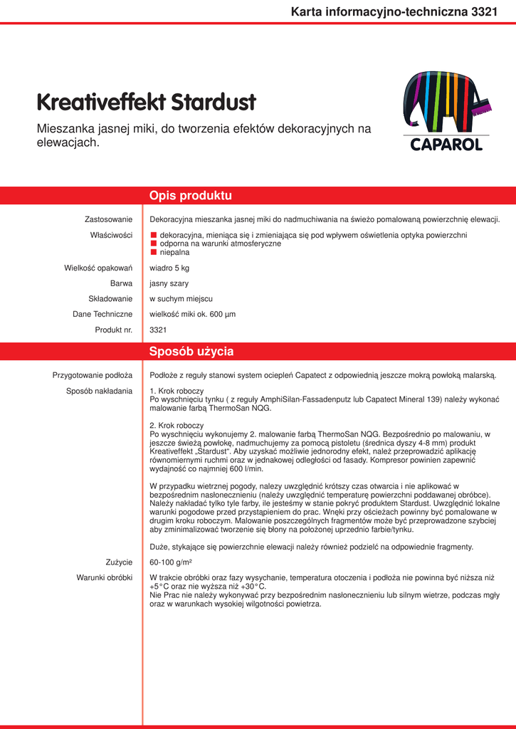 Karta informacyjno-techniczna 3321 Kreativeffekt Stardust Mieszanka jasnej miki, do tworzenia efektów dekoracyjnych na elewacjach. Opis produktu Zastosowanie Właściwości Dekoracyjna mieszanka jasnej miki do nadmuchiwania na świeżo pomalowaną powierzchnię elewacji. ■ dekoracyjna, mieniąca się i zmieniająca się pod wpływem oświetlenia optyka powierzchni ■ odporna na warunki atmosferyczne ■ niepalna Wielkość opakowań wiadro 5 kg Barwa jasny szary Składowanie Dane Techniczne Produkt nr. w suchym miejscu wielkość miki ok. 600 µm 3321 Sposób użycia Przygotowanie podłoża Sposób nakładania Podłoże z reguły stanowi system ociepleń Capatect z odpowiednią jeszcze mokrą powłoką malarską. 1. Krok roboczy Po wyschnięciu tynku ( z reguły AmphiSilan-Fassadenputz lub Capatect Mineral 139) należy wykonać malowanie farbą ThermoSan NQG. 2. Krok roboczy Po wyschnięciu wykonujemy 2. malowanie farbą ThermoSan NQG. Bezpośrednio po malowaniu, w jeszcze świeżą powłokę, nadmuchujemy za pomocą pistoletu (średnica dyszy 4-8 mm) produkt Kreativeffekt „Stardust“. Aby uzyskać możliwie jednorodny efekt, należ przeprowadzić aplikację równomiernymi ruchmi oraz w jednakowej odległości od fasady. Kompresor powinien zapewnić wydajność co najmniej 600 l/min. W przypadku wietrznej pogody, nalezy uwzględnić krótszy czas otwarcia i nie aplikować w bezpośrednim nasłonecznieniu (należy uwzględnić temperaturę powierzchni poddawanej obróbce). Należy nakładać tylko tyle farby, ile jesteśmy w stanie pokryć produktem Stardust. Uwzględnić lokalne warunki pogodowe przed przystąpieniem do prac. Wnęki przy ościeżach powinny być pomalowane w drugim kroku roboczym. Malowanie poszczególnych fragmentów może być przeprowadzone szybciej aby zminimalizować tworzenie się błony na położonej uprzednio farbie/tynku. Duże, stykające się powierzchnie elewacji należy również podzielć na odpowiednie fragmenty. Zużycie Warunki obróbki 60-100 g/m² W trakcie obróbki oraz fazy wysychanie, temperatura otoczenia i podłoża nie powinna być niższa niż +5°C oraz nie wyższa niż +30°C. Nie Prac nie należy wykonywać przy bezpośrednim nasłonecznieniu lub silnym wietrze, podczas mgły oraz w warunkach wysokiej wilgotności powietrza. Karta informacyjno-techniczna 3321 Wskazówka Przed podjęciem działań zaleca się wykonanie powierzchni próbnej i zatwierdzenie jej oraz odbiór przez inwestora/projektanta. Mieniąca się i intensywna optyka powierzchni jest cechą charakterystyczną tej techniki wykończenia powierzchni. Na ciemnych kolorach efekt ten się wzmacnia w związku z tym zaleca się stosowanie kolorów jasnych. Rusztowanie należy ustawić w odpowiedniej odległości od ściany oraz zabezpieczyć plandekami sąsiadujące otoczenie i budynki. W trakcie prac należy używać odpowiedniego ubrania ochronnego. Pracując z pistoletetem do aplikacji efektu Stardust należy używać okularów ochronnych. Nieodpowiednie stosowanie produktu może prowdzić do urazów szczególnie w obszarze oczu. Nigdy nie kierować pistoletu podłączonego do kompresora w stronę innych osób. Nie używać ponownie materiału który opadł na ziemię. Poprzez zanieczyszczenia może dojść do tworzenia się grudek i w efekcie do zapchania urządzenia. Dodatkowo może to spowodować pogorszenie efektu wizualnego. W przypadku zwartych, chłodnych podłoży lub w przypadku spowolnionego przez warunki atmosferyczne wysychania, mogą powstać na powierzchni powłoki żółto/transparenten, lekko błyszczące i klejące przebarwienia. Przebarwienia te są rozpuszczalne w wodzie i można je usunąć samodzielnie poprzez wielokrotne zmywanie wodą lub zostaną spłukane przez padające silniejsze deszcze. Przebarwienia tego typu nie mają negatywnego wpływu na jakość powłoki. Należy uwzględniać wytyczne zawarte w karcie technicznej dla danego produktu. Wskazówki Wskazówki bezpieczeństwa (stan na dzień wydania) Utylizacja Wskazówki bezpieczeństwa / oznakowanie w transporcie Produkt może reagować alkalicznie. Chronić przed dziećmi. Nie wdychać pyłu lub mgły. Nie wprowadzać do oczu, na skórę lub na odzież. W przypadku kontaktu z oczami natychmiast przemyć je wodą. Wyjąć soczewki kontaktowe, jeżeli są i mona je łatwo usunąć. Nadal płukać. Nie pić nie jeść, nie palić podczas używania produktu. W przypadku połknięcia: Wypłukać usta. NIE wywoływać wymiotów. Zasięgnąć porady/zgłosić się pod opiekę lekarza. Opróżnić z pozostałych resztek. Opróżnione opakowania powinny być przekazane na zatwier-dzone składowisko odpadów do recyklingu lub usunięcia. Patrz karta charakterystyki. Giscode ZP1 Infolinia Tel. (22) 544 20 40 Fax (22) 544 20 41 [email protected] Karta informacyjno-techniczna3321, stan na listopad 2016 Niniejsza karta informacyjna została sporządzona na bazie najnowszych osiągnięć techniki i naszych doświadczeń. Ze względu na różnorodność możliwych podłoży i warunków wykonawstwa każdorazowy Kupujący / Użytkownik jest zobowiązany sprawdzić na własną odpowiedzialność przydatność naszych produktów do zamierzonego celu przy każdorazowym uwzględnieniu warunków obiektowych wykonawstwa oraz wymogów i zasad sztuki i rzemiosła. Po ukazaniu się następnej wersji niniejsza karta traci swoją ważność. Caparol Polska Sp. z o. o. · ul. Puławska 393 · PL – 02-801 Warszawa · tel. 022 544 20 40, faks 022 544 20 41 · internet: www.caparol.pl Caparol Farben Lacke Bautenschutz GmbH · Roßdörfer Straße 50 · D – 64372 Ober Ramstadt · tel. +49 6154 71-0, faks +49 6154 711391 · internet: www.caparol.de