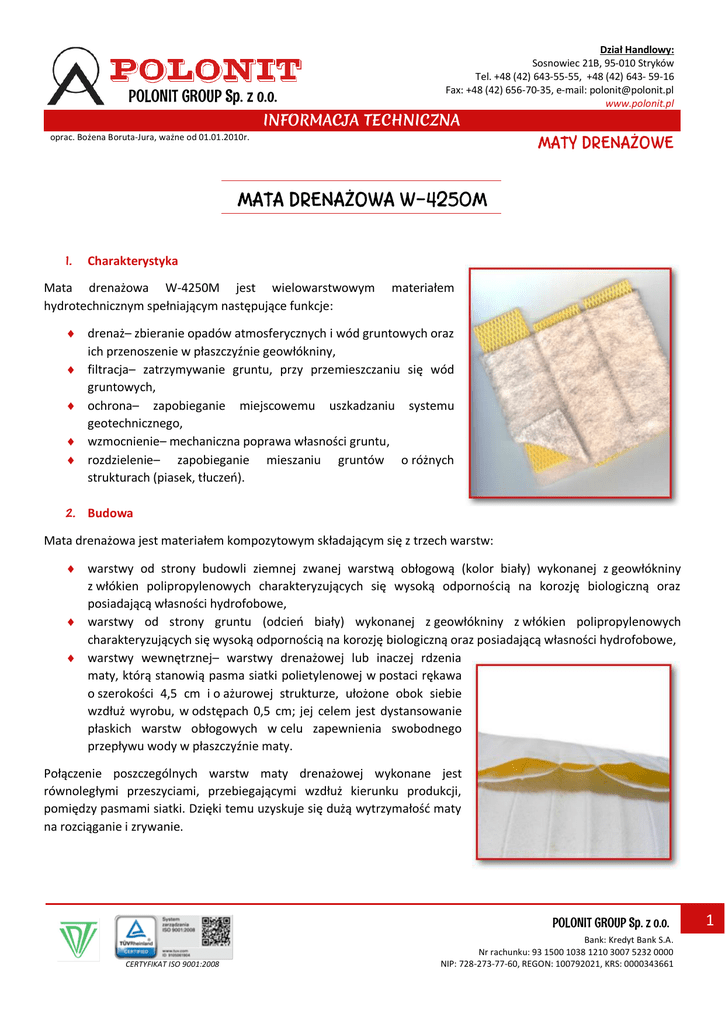 POLONIT GROUP Sp. z o.o. Dział Handlowy: Sosnowiec 21B, 95-010 Stryków Tel. +48 (42) 643-55-55, +48 (42) 643- 59-16 Fax: +48 (42) 656-70-35, e-mail: [email protected] www.polonit.pl INFORMACJA TECHNICZNA MATY DRENAŻOWE oprac. Bożena Boruta-Jura, ważne od 01.01.2010r. MATA DRENAŻOWA W-4250M 1. Charakterystyka Mata drenażowa W-4250M jest wielowarstwowym hydrotechnicznym spełniającym następujące funkcje: materiałem drenaż– zbieranie opadów atmosferycznych i wód gruntowych oraz ich przenoszenie w płaszczyźnie geowłókniny, filtracja– zatrzymywanie gruntu, przy przemieszczaniu się wód gruntowych, ochrona– zapobieganie miejscowemu uszkadzaniu systemu geotechnicznego, wzmocnienie– mechaniczna poprawa własności gruntu, rozdzielenie– zapobieganie mieszaniu gruntów o różnych strukturach (piasek, tłuczeń). 2. Budowa Mata drenażowa jest materiałem kompozytowym składającym się z trzech warstw: warstwy od strony budowli ziemnej zwanej warstwą obłogową (kolor biały) wykonanej z geowłókniny z włókien polipropylenowych charakteryzujących się wysoką odpornością na korozję biologiczną oraz posiadającą własności hydrofobowe, warstwy od strony gruntu (odcień biały) wykonanej z geowłókniny z włókien polipropylenowych charakteryzujących się wysoką odpornością na korozję biologiczną oraz posiadającą własności hydrofobowe, warstwy wewnętrznej– warstwy drenażowej lub inaczej rdzenia maty, którą stanowią pasma siatki polietylenowej w postaci rękawa o szerokości 4,5 cm i o ażurowej strukturze, ułożone obok siebie wzdłuż wyrobu, w odstępach 0,5 cm; jej celem jest dystansowanie płaskich warstw obłogowych w celu zapewnienia swobodnego przepływu wody w płaszczyźnie maty. Połączenie poszczególnych warstw maty drenażowej wykonane jest równoległymi przeszyciami, przebiegającymi wzdłuż kierunku produkcji, pomiędzy pasmami siatki. Dzięki temu uzyskuje się dużą wytrzymałość maty na rozciąganie i zrywanie. POLONIT GROUP Sp. z o.o. CERTYFIKAT ISO 9001:2008 Bank: Kredyt Bank S.A. Nr rachunku: 93 1500 1038 1210 3007 5232 0000 NIP: 728-273-77-60, REGON: 100792021, KRS: 0000343661 1 Dział Handlowy: Sosnowiec 21B, 95-010 Stryków Tel. +48 (42) 643-55-55, +48 (42) 643- 59-16 Fax: +48 (42) 656-70-35, e-mail: [email protected] www.polonit.pl POLONIT GROUP Sp. z o.o. INFORMACJA TECHNICZNA MATY DRENAŻOWE oprac. Bożena Boruta-Jura, ważne od 01.01.2010r. Mata drenażowa W-4250M dostarczana jest w zwojach o szerokości 170 ± 10 cm, owiniętych w folię, dzięki czemu mogą być składowane na otwartych przestrzeniach. Standardowa długość maty w zwoju wynosi 30 m, może być jednak inna w zależności od potrzeb klienta. 3. Przeznaczenie Mata drenażowa W-4250M posiada: Aprobatę Techniczną nr AT/18-2007-0010-01 wydaną przez Instytut Melioracji i Użytków Zielonych. Zgodnie z tymi dokumentami mata drenażowa W-4250M jest przeznaczona do stosowania w budownictwie melioracyjnym do konstruowania warstwy drenażowej, mogącej pełnić jednocześnie funkcję warstwy rozdzielającej różne rodzaje gruntu oraz warstwy wzmacniającej grunt. Może być ona stosowana jako drenaż budowli melioracyjnych, wałów przeciwpowodziowych, nasypów, przy regulacji rzek, w umocnieniach i systemach drenażowych zboczy naturalnych i sztucznych, odwodnieniach dróg rolniczych, boisk, bieżni, kortów sportowych, ujeżdżalni, a także placów składowych i składowisk odpadów. 4. Zalety maty drenażowej typu W-4250M rozprowadzanie i usuwanie wód gruntowych i opadowych z miejsc zagrożonych obsunięciem, osłabieniem podłoża, wysoka zdolność do odprowadzania dużej ilości wody wzdłuż płaszczyzny maty bez i pod obciążeniem, pełnienie również funkcji filtracyjnej i ochronnej, po zainstalowaniu nad warstwą izolacyjną, brak uszkodzeń podczas wbudowywania oraz długi okres eksploatacji dzięki wysokiej wytrzymałości mechanicznej, odporność na działanie substancji chemicznych występujących w gruncie, zdolność do ścisłego dopasowywania się do narożników, zagięć i innych elementów budynku, dzięki wysokiej elastyczności, łatwy i szybki montaż maty w porównaniu z dotychczas stosowanymi drenażami mineralnymi. 5. Parametry techniczne maty drenażowej typ W 4250M Lp. 1. 2. 3. 4. Właściwość Grubość (±10%) przy nacisku 2, 20, 200 kPa Masa powierzchniowa (± 10%) Wytrzymałość na rozciąganie- wzdłuż Wytrzymałość na rozciąganie– wszerz Wydłużenie przy zerwaniu– wzdłuż Wydłużenie przy zerwaniu– wszerz Jednostka Wartość wymagana mm 9,5; 5,3; 3,2 g/m2 885 ≥ 5,5 ≥ 6,0 ≥ 100 ≥ 45 kN/m % Metoda badania PN-EN 964-1:1999 sposób B PN-EN 965:1999 PN-ISO 10319:1996 POLONIT GROUP Sp. z o.o. CERTYFIKAT ISO 9001:2008 Bank: Kredyt Bank S.A. Nr rachunku: 93 1500 1038 1210 3007 5232 0000 NIP: 728-273-77-60, REGON: 100792021, KRS: 0000343661 2 Dział Handlowy: Sosnowiec 21B, 95-010 Stryków Tel. +48 (42) 643-55-55, +48 (42) 643- 59-16 Fax: +48 (42) 656-70-35, e-mail: [email protected] www.polonit.pl POLONIT GROUP Sp. z o.o. INFORMACJA TECHNICZNA MATY DRENAŻOWE oprac. Bożena Boruta-Jura, ważne od 01.01.2010r. Wodoprzepuszczalność w kierunku prostopadłym do płaszczyzny: - wskaźnik prędkości przepływu VIH50 - współczynnik filtracji kv Wodoprzepuszczalność w płaszczyźnie wyrobu; - współczynnik filtracji kH (przy nacisku 2, 20 i 200 kPa) zdolność przepływu qng, przy nacisku: 2 kPa 20 kPa 50 kPa 100 kPa 200 kPa 5. 6. 7. Charakterystyczna wielkość porów, 090 8. Współczynnik filtracji po zakolmatowaniu, przy nacisku 50, 100 i 200 kPa ≥ 4300 ≥ 860 m/d ≥ 3900 ≥ 860 ≥ 86 m/d m2/s ZUAT-15/VI.04 PN-EN ISO 11058 i = 0,1 ≥ 3,0 x 10–5 ≥ 4,5 x 10–6 ≥ 1,0 x 10–6 ≥ 4,5 x 10–7 ≥ 2,0 x 10–7 i = 1,0 ≥ 2,0 x 10–4 ≥ 4,0 x 10–5 ≥ 1,5 x 10–5 ≥ 5,0 x 10–6 ≥ 1,0 x 10–6 ZUAT-15/VI. 04 PN-EN ISO 12958 mm 0,14 ZUAT-15/VI.04 PN-EN ISO 12956 m/d ≥ 