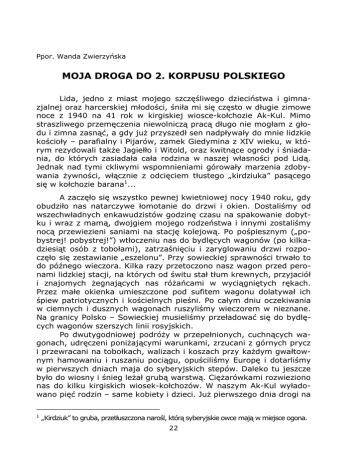 Ppor. Wanda Zwierzyńska MOJA DROGA DO 2. KORPUSU POLSKIEGO Lida, jedno z miast mojego szczęśliwego dzieciństwa i gimnazjalnej oraz harcerskiej młodości, śniła mi się często w długie zimowe noce z 1940 na 41 rok w kirgiskiej wiosce-kołchozie Ak-Kul. Mimo straszliwego przemęczenia niewolniczą pracą długo nie mogłam z głodu i zimna zasnąć, a gdy juŜ przyszedł sen nadpływały do mnie lidzkie kościoły – parafialny i Pijarów, zamek Giedymina z XIV wieku, w którym rezydowali takŜe Jagiełło i Witold, oraz kwitnące ogrody i śniadania, do których zasiadała cała rodzina w naszej własności pod Lidą. Jednak nad tymi ckliwymi wspomnieniami górowały marzenia zdobywania Ŝywności, włącznie z odcięciem tłustego „kirdziuka” pasącego się w kołchozie barana1... A zaczęło się wszystko pewnej kwietniowej nocy 1940 roku, gdy obudziło nas natarczywe łomotanie do drzwi i okien. Dostaliśmy od wszechwładnych enkawudzistów godzinę czasu na spakowanie dobytku i wraz z mamą, dwojgiem mojego rodzeństwa i innymi zostaliśmy nocą przewiezieni saniami na stację kolejową. Po pośpiesznym („pobystrej! pobystrej!”) wtłoczeniu nas do bydlęcych wagonów (po kilkadziesiąt osób z tobołami), zatrzaśnięciu i zaryglowaniu drzwi rozpoczęło się zestawianie „eszelonu”. Przy sowieckiej sprawności trwało to do późnego wieczora. Kilka razy przetoczono nasz wagon przed peronami lidzkiej stacji, na których od świtu stał tłum krewnych, przyjaciół i znajomych Ŝegnających nas róŜańcami w wyciągniętych rękach. Przez małe okienka umieszczone pod sufitem wagonu dolatywał ich śpiew patriotycznych i kościelnych pieśni. Po całym dniu oczekiwania w ciemnych i dusznych wagonach ruszyliśmy wieczorem w nieznane. Na granicy Polsko – Sowieckiej musieliśmy przeładować się do bydlęcych wagonów szerszych linii rosyjskich. Po dwutygodniowej podróŜy w przepełnionych, cuchnących wagonach, udręczeni poniŜającymi warunkami, zrzucani z górnych prycz i przewracani na tobołkach, walizach i koszach przy kaŜdym gwałtownym hamowaniu i ruszaniu pociągu, opuściliśmy Europę i dotarliśmy w pierwszych dniach maja do syberyjskich stepów. Daleko tu jeszcze było do wiosny i śnieg leŜał grubą warstwą. CięŜarówkami rozwieziono nas do kilku kirgiskich wiosek-kołchozów. W naszym Ak-Kul wyładowano pięć rodzin – same kobiety i dzieci. JuŜ pierwszego dnia drogi na 1 „Kirdziuk” to gruba, przetłuszczona narośl, którą syberyjskie owce mają w miejsce ogona. 22 Sybir moja mama przygarnęła trójkę wtłoczonych do wagonu sierot, naszych znajomych; w mojej rodzinie było więc nas razem sześcioro dzieci. Pierwsze zetknięcie z mongolskimi mieszkańcami kołchozu wywołało u nas przeraŜenie. Wkrótce przekonaliśmy się jednak, Ŝe nasze uprzedzenie i nieufność do nich były całkowicie bezpodstawne. Okazali się bardzo ludzcy, a wspólna wrogość do stalinowskich okrucieństw sprawiła, Ŝe znaleźliśmy się po tej samej stronie barykady. MąŜ naszej gospodyni, która przygarnęła nas siedem osób, od dziesięciu lat siedział w sowieckim łagrze za to, jak mówiła, Ŝe był zacnym człowiekiem. Nas nigdy nie spotkała Ŝadna krzywda od mieszkańców wioski, nigdy nic nam z naszych rzeczy nie zginęło, a widmo głodu, na który sami cierpieli, nie usposobiło ich wrogo do nas. W Ak-Kulu przeŜyliśmy wiosnę zjadając zapasy Ŝywności przywiezione jeszcze z Polski, krótkie gorące lato pracując w polu oraz cięŜką, okrutną zimę głodując po społu z naszymi gospodarzami. Kołchoz biedny, spłaciwszy zbiorami wszystkie „naleŜności” władzy sowieckiej, nie zebrawszy z pola większości kartofli z powodu braku części do psujących się kombajnów, czekał przednówka z pustymi zasiekami i Ŝołądkami. Z nastaniem następnej wiosny 1941 roku ściągnięto nas nocą (NKWD jak pająki działała zawsze w nocy) na stację kolejową Tokoszy, dokąd zwoŜono wszystkich Polaków z okolicy. Tu zastała nas jedyna wiadomość – pocztówka od ojca, ukrywającego się dotychczas na Litwie. Z jednej strony przyjęliśmy ją z ogromną radością, Ŝe Ŝyje, z drugiej wzmianka, Ŝe „jadę w waszym kierunku”, uświadomiła nam, Ŝe go aresztowano (dostał wyrok 10 lat łagrów). Kartkę po aresztowaniu w Kownie wyrzucił przez szparę w wagonie bez znaczka. Litościwe ręce podniosły ją … Znowu załadowano nas w wagony w ogromnie długim „eszelonie” i po wielodniowej podróŜy zaczęto wyładowywać po około 60 osób wraz z małymi dziećmi co 30 km wzdłuŜ trasy kolei transsyberyjskiej na linii Akmolińsk – Kartały. KaŜdej takiej 60-cio osobowej „brygadzie roboczej” nakazano przebudować po 15 km linii kolejowej w kaŜdą stronę od miejsca wyładunku. Praca nieludzko cięŜka dla kobiet i dzieci, na wysokich nasypach, ale wynagradzana kilkuset gramami niewidzianego przedtem chleba… Wśród nas znalazła się lektorka polskiej literatury. Zajęła się potrzebą duchową i umysłową naszej młodzieŜy szkolnej, a w naszej „brygadzie” było nas około 30-ro (tych zebrano wybiórczo bez rodzin) w wieku szkolnym. Z braku polskich ksiąŜek radziła nam uczyć się języka rosyjskiego i czytać choćby skrawki rosyjskich gazet, by w smutnym niewolniczym Ŝyciu nie dopuścić do umysłowego zastoju i 23 skostnienia, a pod naporem ponurej rzeczywistości nie załamać się i nie wpaść w stan zobojętnienia i beznadziei. Mimo zmęczenia codzienną katorŜniczą pracą organizowała wieczorki literackie, na których z pamięci deklamowała poezję i recytowała prozę. Pewnej nocy NKWD aresztowało ją za tę działalność i wszelki słuch po niej zaginął. W kilka miesięcy po tak zwanej „amnestii” dobrnęły do nas trzy osoby wypuszczone z łagrów, które na wiadomość, Ŝe na tej trasie pracują polskie kobiety i dzieci, szły wzdłuŜ linii kolejowej lub jechały czepiając się 
