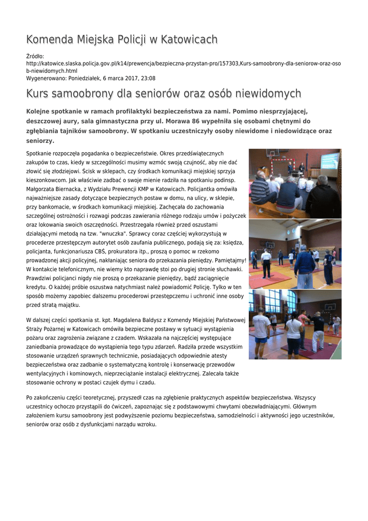 Komenda Miejska Policji w Katowicach Źródło: http://katowice.slaska.policja.gov.pl/k14/prewencja/bezpieczna-przystan-pro/157303,Kurs-samoobrony-dla-seniorow-oraz-oso b-niewidomych.html Wygenerowano: Poniedziałek, 6 marca 2017, 23:08 Kurs samoobrony dla seniorów oraz osób niewidomych Kolejne spotkanie w ramach profilaktyki bezpieczeństwa za nami. Pomimo niesprzyjającej, deszczowej aury, sala gimnastyczna przy ul. Morawa 86 wypełniła się osobami chętnymi do zgłębiania tajników samoobrony. W spotkaniu uczestniczyły osoby niewidome i niedowidzące oraz seniorzy. Spotkanie rozpoczęła pogadanka o bezpieczeństwie. Okres przedświątecznych zakupów to czas, kiedy w szczególności musimy wzmóc swoją czujność, aby nie dać złowić się złodziejowi. Ścisk w sklepach, czy środkach komunikacji miejskiej sprzyja kieszonkowcom. Jak właściwie zadbać o swoje mienie radziła na spotkaniu podinsp. Małgorzata Biernacka, z Wydziału Prewencji KMP w Katowicach. Policjantka omówiła najważniejsze zasady dotyczące bezpiecznych postaw w domu, na ulicy, w sklepie, przy bankomacie, w środkach komunikacji miejskiej. Zachęcała do zachowania szczególnej ostrożności i rozwagi podczas zawierania różnego rodzaju umów i pożyczek oraz lokowania swoich oszczędności. Przestrzegała również przed oszustami działającymi metodą na tzw. "wnuczka". Sprawcy coraz częściej wykorzystują w procederze przestępczym autorytet osób zaufania publicznego, podają się za: księdza, policjanta, funkcjonariusza CBŚ, prokuratora itp., proszą o pomoc w rzekomo prowadzonej akcji policyjnej, nakłaniając seniora do przekazania pieniędzy. Pamiętajmy! W kontakcie telefonicznym, nie wiemy kto naprawdę stoi po drugiej stronie słuchawki. Prawdziwi policjanci nigdy nie proszą o przekazanie pieniędzy, bądź zaciągnięcie kredytu. O każdej próbie oszustwa natychmiast należ powiadomić Policję. Tylko w ten sposób możemy zapobiec dalszemu procederowi przestępczemu i uchronić inne osoby przed stratą majątku. W dalszej części spotkania st. kpt. Magdalena Baldysz z Komendy Miejskiej Państwowej Straży Pożarnej w Katowicach omówiła bezpieczne postawy w sytuacji wystąpienia pożaru oraz zagrożenia związane z czadem. Wskazała na najczęściej występujące zaniedbania prowadzące do wystąpienia tego typu zdarzeń. Radziła przede wszystkim stosowanie urządzeń sprawnych technicznie, posiadających odpowiednie atesty bezpieczeństwa oraz zadbanie o systematyczną kontrolę i konserwację przewodów wentylacyjnych i kominowych, nieprzeciążanie instalacji elektrycznej. Zalecała także stosowanie ochrony w postaci czujek dymu i czadu. Po zakończeniu części teoretycznej, przyszedł czas na zgłębienie praktycznych aspektów bezpieczeństwa. Wszyscy uczestnicy ochoczo przystąpili do ćwiczeń, zapoznając się z podstawowymi chwytami obezwładniającymi. Głównym założeniem kursu samoobrony jest podwyższenie poziomu bezpieczeństwa, samodzielności i aktywności jego uczestników, seniorów oraz osób z dysfunkcjami narządu wzroku. Ocena: 0/5 (0) Tweetnij