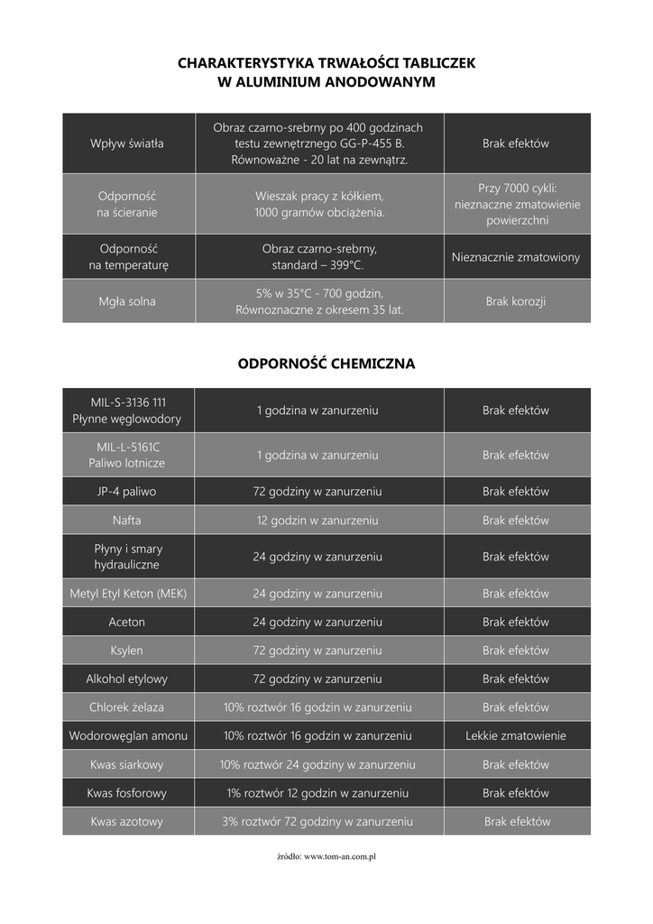CHARAKTERYSTYKA TRWAŁOŚCI TABLICZEK W ALUMINIUM ANODOWANYM Wpływ światła Obraz czarno-srebrny po 400 godzinach testu zewnętrznego GG-P-455 B. Równoważne - 20 lat na zewnątrz. Brak efektów Odporność na ścieranie Wieszak pracy z kółkiem, 1000 gramów obciążenia. Przy 7000 cykli: nieznaczne zmatowienie powierzchni Odporność na temperaturę Obraz czarno-srebrny, standard – 399°C. Nieznacznie zmatowiony Mgła solna 5% w 35°C - 700 godzin, Równoznaczne z okresem 35 lat. Brak korozji ODPORNOŚĆ CHEMICZNA MIL-S-3136 111 Płynne węglowodory 1 godzina w zanurzeniu Brak efektów MIL-L-5161C Paliwo lotnicze 1 godzina w zanurzeniu Brak efektów JP-4 paliwo 72 godziny w zanurzeniu Brak efektów Nafta 12 godzin w zanurzeniu Brak efektów Płyny i smary hydrauliczne 24 godziny w zanurzeniu Brak efektów Metyl Etyl Keton (MEK) 24 godziny w zanurzeniu Brak efektów Aceton 24 godziny w zanurzeniu Brak efektów Ksylen 72 godziny w zanurzeniu Brak efektów Alkohol etylowy 72 godziny w zanurzeniu Brak efektów Chlorek żelaza 10% roztwór 16 godzin w zanurzeniu Brak efektów Wodorowęglan amonu 10% roztwór 16 godzin w zanurzeniu Lekkie zmatowienie Kwas siarkowy 10% roztwór 24 godziny w zanurzeniu Brak efektów Kwas fosforowy 1% roztwór 12 godzin w zanurzeniu Brak efektów Kwas azotowy 3% roztwór 72 godziny w zanurzeniu Brak efektów źródło: www.tom-an.com.pl