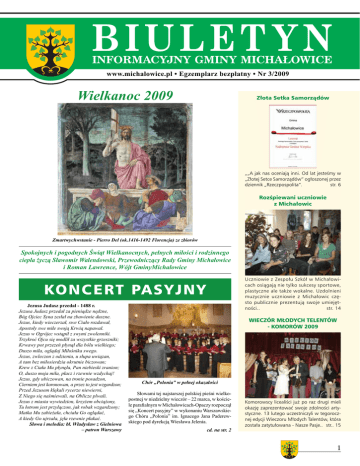 www.michalowice.pl • Egzemplarz bezpłatny • Nr 3/2009 Wielkanoc 2009 Złota Setka Samorządów „„A jak nas oceniają inni. Od lat jesteśmy w „Złotej Setce Samorządów” ogłoszonej przez dziennik „Rzeczpospolita”. str. 6 Rozśpiewani uczniowie z Michałowic Zmartwychwstanie - Pierro Del (ok.1416-1492 Florencja) ze zbiorów Spokojnych i pogodnych Świąt Wielkanocnych, pełnych miłości i rodzinnego ciepła życzą Sławomir Walendowski, Przewodniczący Rady Gminy Michałowice i Roman Lawrence, Wójt GminyMichałowice Uczniowie z Zespołu Szkół w Michałowicach osiągają nie tylko sukcesy sportowe, plastyczne ale także wokalne. Uzdolnieni muzycznie uczniowie z Michałowic często publicznie prezentują swoje umiejętności.. str. 14 KON C ER T PA S Y JN Y Jezusa Judasz przedał - 1488 r. Jezusa Judasz przedał za pieniądze nędzne, Bóg Ojciec Syna zesłał na zbawienie duszne. Jezus, kiedy wieczerzał, swe Ciało rozdawał, Apostoły swe miłe swoją Krwią napawał. Jezus w Ogrójec wstąpił z swymi zwolenniki. Trzykroć Ojcu się modlił za wszystkie grzeszniki; Krwawy pot przezeń płynął dla bólu wielkiego; Duszo miła, oglądaj Miłośnika swego. Jezus, zwleczon z odzienia, u słupa uwiązan, A tam bez miłosierdzia okrutnie biczowan; Krew z Ciała Mu płynęła, Pan niebieski zranion; O, duszo moja miła, płacz i rzewnie wzdychaj! Jezus, gdy ubiczowan, na tronie posadzon, Cierniem jest koronowan, a przez to jest wzgardzon; Przed Jezusem klękali rycerze niewierni, Z Niego się naśmiewali, na Oblicze plwali. Jezus z miasta wywiedzion, krzyżem obciążony, Tu łotrom jest przyłączon, jak robak wzgardzony; Matka Mu zabieżała, chciała Go oglądać, A kiedy Go ujrzała, jęła rzewnie płakać. Słowa i melodia: bł. Władysław z Gielniowa – patron Warszawy WIECZÓR MŁODYCH TELENTÓW - KOMORÓW 2009 Chór „Polonia” w pełnej okazałości Słowami tej najstarszej polskiej pieśni wielkopostnej w niedzielny wieczór – 22 marca, w kościele parafialnym w Michałowicach-Opaczy rozpoczął się „Koncert pasyjny” w wykonaniu Warszawskiego Chóru „Polonia” im. Ignacego Jana Paderewskiego pod dyrekcją Wiesława Jelenia. cd. na str. 2 Komorowscy licealiści już po raz drugi mieli okazję zaprezentować swoje zdolności artystyczne. 13 lutego uczestniczyli w tegorocznej edycji Wieczoru Młodych Talentów, która została zatytułowana - Nasze Pasje.. str.. 15 1 Z GMINY MICHAŁOWICE CHÓR POLONIA Chór „Polonia” wykonał utwory tak znanych kompozytorów, jak Wolfganga Amadeusza Mozarta „Ave verum Corpus” oraz Jana Sebastiana Bacha „Pasterzu i obrońco” oraz polskich twórców, w tym jeszcze z XVI w. bł. Władysława z Gielniowa „Jesusa Judasz przedał” czy z muzyką Wacława z Szamotuł (też XVI w.) do słów A. Trzecieskiego „Ach mój Niebieski Panie”. Występ zakończyło wykonanie wiersza Juliusza Słowackiego pt. „Wierzę” do muzyki Józefa Świdra. Przypomnijmy, pasja jako gatunek w muzyce religijnej przedstawia mękę i śmierć Chrystusa. Jak powiedziała narratorka koncertu, w czasie wielkiego postu nie pokuta jest najważniejsza, ale modlitwa. Modlitwa niekiedy mylona jest z gadulstwem. Skutecznie modlić można się poprzez muzykę. Muzyka pasyjna pomaga nam zrozumieć mękę Jezusa. (cd. ze str. 1) O istocie tej męki mówił w czasie kazania ksiądz proboszcz Leon Forlej. Nam ludziom XX i XXI wieku trudno łączyć radość z wyrzeczeniem. Powodem smutku może być chęć posiadania rzeczy, które nie są potrzebne do życia, a ukazywane w reklamach. Ale czy realizacja takiego celu lub celów wystarczy, by stać się radosnym? Są jeszcze potrzeby duchowe. Jakbyś postąpił: gdybyś miał dać wszystko, by uratować człowieka? Chrystus pokazuje nam swoim życiem i śmiercią, że trzeba być gotowym tracić, by zyskać. Paradoksalnie ta droga prowadzi do szczęścia. Taki był święty Franciszek – miał odwagę porzucić wszystko. Czy był człowiekiem smutnym? Uzyskał prawdziwą radość. Tylko w krzyżu jest nasze zbawienie. - Koncert zakończył się poetyckim wyznaniem wiary: „Wierzę” Juliusza Słowackiego – podkreślił ks. towali pod kierunkiem Grażyny Matyszkiewicz. Tuż przed występem swoich studentów, powiedziała o degradacji języka polskiego, o błędach językowych, jak również o błędach fonetycznych, złym akcencie i intonacji. Z żalem mówiła też, że zanikają gwary, a szczególnie droga jej gwara podhalańska. Gra- żyna Matuszkiewicz przeczytała wiersz „Kino”,Wandy Czubernatowej, poetki z Raby Wyżnej. Studentom na żywo towarzyszyła muzyka rodem z polskich gór. W Salonie uczestniczył również Zbigniew Zamachowski, który tym razem był wśród publiczności. Niemniej jednak, na zakończenie, z rozrzewnieniem wspominał szkolne lata, kiedy również uczył się gwary podhalańskiej. Dziś dzięki temu, z łatwością opowiada góralskie dowcipy. W kwietniowym Salonie poezji, tak jak w roku ubiegłym, wystąpią przyjaciele Darii Trafankowskiej, zmarłej kilka lat temu aktorki. Będą też zbierane pieniądze na rzecz fundacji imienia aktorki. Fundacja im. Darii Trafankowskiej jest pierwszą i jak dotąd jedyną Fundacją wspomagającą środowisko ludzi związanych ze sceną. Celem Fundacji jest pomoc w ratowaniu życia i zdrowia artystów. W niedzielne południe, 22 lutego, miłośnicy poezji mieli okazję posłuchać wierszy autorów dotkniętych chorobami psychicznymi, a także wierszy Władysława Broniewskiego, który był uzależniony od alkoholu. Gościem specjalnym salonu poezji była Maria Pałuba, wieloletnia dyrektor Szpitala Psychiatrycznego w Tworkach, a także założycielka Towarzystwa Amici di Tworki (Towarzystwa Przyjaciół Tworek). Maria Pałuba powiedziała, że ważne jest, aby ludzie jak najwięcej wiedzieli o chorobach psychicznych. Są one swoistą chorobą duszy, a zapadają na nie osoby nadwrażliwe. Przypomniała też, że sztuk