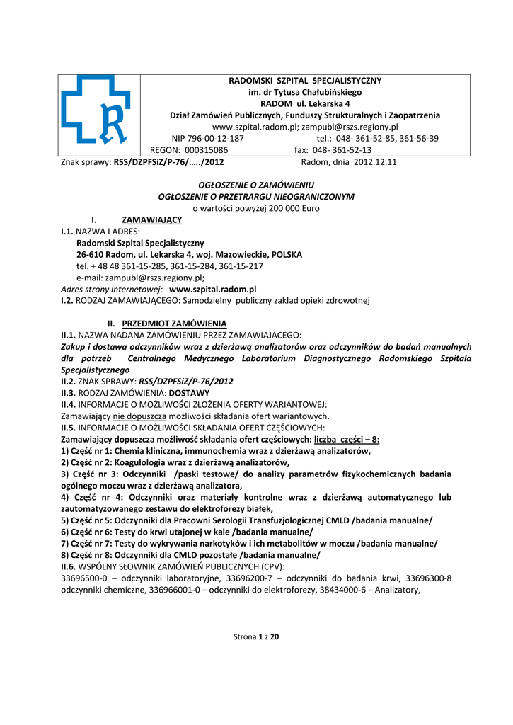 RADOMSKI SZPITAL SPECJALISTYCZNY im. dr Tytusa Chałubińskiego RADOM ul. Lekarska 4 Dział Zamówień Publicznych, Funduszy Strukturalnych i Zaopatrzenia www.szpital.radom.pl; [email protected] NIP 796-00-12-187 tel.: 048- 361-52-85, 361-56-39 REGON: 000315086 fax: 048- 361-52-13 Znak sprawy: RSS/DZPFSiZ/P-76/…../2012 Radom, dnia 2012.12.11 OGŁOSZENIE O ZAMÓWIENIU OGŁOSZENIE O PRZETRARGU NIEOGRANICZONYM o wartości powyżej 200 000 Euro I. ZAMAWIAJĄCY I.1. NAZWA I ADRES: Radomski Szpital Specjalistyczny 26-610 Radom, ul. Lekarska 4, woj. Mazowieckie, POLSKA tel. + 48 48 361-15-285, 361-15-284, 361-15-217 e-mail: [email protected]; Adres strony internetowej: www.szpital.radom.pl I.2. RODZAJ ZAMAWIAJĄCEGO: Samodzielny publiczny zakład opieki zdrowotnej II. PRZEDMIOT ZAMÓWIENIA II.1. NAZWA NADANA ZAMÓWIENIU PRZEZ ZAMAWIAJACEGO: Zakup i dostawa odczynników wraz z dzierżawą analizatorów oraz odczynników do badań manualnych dla potrzeb Centralnego Medycznego Laboratorium Diagnostycznego Radomskiego Szpitala Specjalistycznego II.2. ZNAK SPRAWY: RSS/DZPFSiZ/P-76/2012 II.3. RODZAJ ZAMÓWIENIA: DOSTAWY II.4. INFORMACJE O MOŻLIWOŚCI ZŁOŻENIA OFERTY WARIANTOWEJ: Zamawiający nie dopuszcza możliwości składania ofert wariantowych. II.5. INFORMACJE O MOŻLIWOŚCI SKŁADANIA OFERT CZĘŚCIOWYCH: Zamawiający dopuszcza możliwość składania ofert częściowych: liczba części – 8: 1) Część nr 1: Chemia kliniczna, immunochemia wraz z dzierżawą analizatorów, 2) Część nr 2: Koagulologia wraz z dzierżawą analizatorów, 3) Część nr 3: Odczynniki /paski testowe/ do analizy parametrów fizykochemicznych badania ogólnego moczu wraz z dzierżawą analizatora, 4) Część nr 4: Odczynniki oraz materiały kontrolne wraz z dzierżawą automatycznego lub zautomatyzowanego zestawu do elektroforezy białek, 5) Część nr 5: Odczynniki dla Pracowni Serologii Transfuzjologicznej CMLD /badania manualne/ 6) Część nr 6: Testy do krwi utajonej w kale /badania manualne/ 7) Część nr 7: Testy do wykrywania narkotyków i ich metabolitów w moczu /badania manualne/ 8) Część nr 8: Odczynniki dla CMLD pozostałe /badania manualne/ II.6. WSPÓLNY SŁOWNIK ZAMÓWIEŃ PUBLICZNYCH (CPV): 33696500-0 – odczynniki laboratoryjne, 33696200-7 – odczynniki do badania krwi, 33696300-8 odczynniki chemiczne, 336966001-0 – odczynniki do elektroforezy, 38434000-6 – Analizatory, Strona 1 z 20 II.7. SZCZEGÓŁOWY OPIS PRZEDMIOTU ZAMÓWIENIA: Przedmiotem zamówienia jest Zakup i dostawa odczynników wraz z dzierżawą analizatorów oraz odczynników do badań manualnych dla potrzeb Centralnego Medycznego Laboratorium Diagnostycznego Radomskiego Szpitala Specjalistycznego L.p 1. 2. 3. 4. 5. 6. 7. 8. 9. 10. 11. 12. 13. 14. 15. 16. 17. 18. 19. 20. 21. 22. 23. Część nr 1 - CHEMIA KLINICZNA, IMMUNOCHEMIA. I. Dzierżawa analizatorów Parametry graniczne platformy analitycznej, zintegrowanego analizatora (systemu) biochemicznoimmunochemicznego wykonującego badania z zakresu chemii klinicznej i immunochemii z jednej próbki pierwotnej wraz dzierżawą zastępczego analizatora do badań biochemicznych i zastępczego analizatora do badań immunochemicznych . W przypadku braku możliwości spełnienia oczekiwań zamawiającego dotyczącego menu (analizatora zintegrowanego , platformy analitycznej, systemu ) istnieje możliwość zaproponowania dodatkowych analizatorów immunochemicznych dla maksymalnie 5 badań innych niż wyszczególnione dla analizatorów zastępczych spośród badań wymienionych w SIWZ. Analizatory zastępcze do badań biochemicznych i immunochemicznych wykonujące wyszczególnione w SIWZ badania w oparciu o te same odczynniki co analizator zintegrowany , platforma analityczna . 1) Zintegrowany analizator (system) biochemiczno-immunochemiczny Parametry graniczne zintegrowanego analizatora biochemiczno-immunochemicznego. Producent, model, typ Automatyczny ,zintegrowany analizator (system) immuno-biochemiczny (połączenie oferowanego analizatora biochemicznego z oferowanym analizatorem immunochemicznym)umożliwiające aspirację materiału do badań biochemicznych i immunochemicznych z tej samej próbki, bez konieczności jej ręcznego przenoszenia między analizatorami. Sterowanie zintegrowanym analizatorem z jednego stanowiska operatorskiego. Koszty integracji analizatorów ponosi wykonawca w momencie instalacji analizatorów. Analizator (system) nowy , rok produkcji 2011/2012. Analizator (system) pracujący w trybie rutynowym i trybie cito bez przerywania ciągłości pracy Pojemność analizatora (systemu) zintegrowanego nie mniej niż 150 próbek badanych. Wbudowany system kontroli jakości Możliwość pracy z różnymi typami próbek ( surowica, osocze, mocz, pmr,) Możliwość pracy z różnymi typami probówek (systemów zamkniętych) Możliwość dostawiania statywów z probówkami w trakcie pracy analizatora (systemu) Identyfikacja odczynników i prób badanych za pomocą wbudowanego czytnika kodów kreskowych. Analizatory wyposażone w pozycję STAT. Detekcja skrzepu oraz informacja o skrzepie dla operatora Rejestracja wykonywanych przeglądów i procedur konserwacyjnych przez analizator. Wyposażenie w modem serwisowy dla celów zdalnej diagnostyki serwisowej. Komputerowa archiwizacja danych. Funkcja automatycznego rozcieńczania próbki. Możliwość automatycznego wykonywania powtórzeń oznaczeń. Analizator (system) wyposażony w drukarkę zewnętrzną i komputer sterujący. Podtrzymanie pracy analizatorów w przypadku braku zasilania przez UPS przynajmniej przez 20 minut. Bezpłatne szkolenie personelu w obsłudze aparatu. Bezpłatny serwis analizatorów przez cały okres trwania dzierżawy łącznie z przeglądami okresowymi. Instrukcja obsługi w języku polskim Czas przyjazdu serwisanta – 12 godzin Strona 2 z 20 L.p 1. 2. 3. 4. 5. 6. 7. 8. 9. 10. 11. L.p 1. 2. 3. 4. 5. 6. 7. 8. L.p. 1. 2. 3. 4. 5. L.p 1. 2. 3. 4. 5. 2) Analizator-część biochemiczna sy