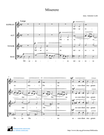 Miserere muz. Antonio Lotti ° Largo ∑ SOPRAN & b c ALT TENOR & bc & bc ‹ ∑ ∑ p ∑ ° &b w ˙ re me & b œ nœ œ ˙ me ˙ ˙ - ˙ ˙ us n˙ De - - - ˙ se ˙ w œ w i - i De œ œ# œ ˙ rit. - De ˙ De rit. #˙ - w - - #˙ re ˙ us œ #œnœ ˙ w us - ˙ œ œ ˙ re ˙ - re ˙ se - cun - dum ma - gnam mf us ˙ ˙ ˙ mi - se - re mf w w ˙ re - mi - se - re - - - re rit. i #˙ - re - - œ œ#œ ˙ ˙ œ œœ˙ - w w rit. ˙ - - œ œœ˙ re - œ œœ˙ me - ˙ w w ˙ ˙™ 7 De ∑ Mi - se - re p ˙ p Mi Mi - se ? #˙ ¢ b ∑ Mi - se - re ∑ ? c˙ BAS ¢ b ˙ &b ‹ ∑ p Œ us œ œ œ ˙ ˙ se - cun - dum ma - gnam Œ #œ œ œ #˙ mf mf ˙ ˙ se - cun - dum ma - gnam œ œ ˙ ˙ se - cun - dum ma - gnam http://www.idn.org.pl/towmuz/biblioteka ° j & b Œ œ œ œ #œ ™ œ ˙ 2 13 mi - se - ri - cor - di - am, &b Œ j œ œ œ™ œ ˙ œ mi - se - ri - cor - di - am, œ œ œ nœ ™ œj ˙ b Œ & ‹ mi - se - ri - cor - di - am, ? Œ œ œ œ œ™ œ ˙ ¢ b J mi - se - ri - cor - di - am, ° &b 19 &b Œ & b œ™ ‹ cun ? ¢ b Œ nœ œ œ œ™ œj ˙ mf w mi - se - ri - cor - di - am Œ tu w am, - mf #œ œ œ œ œ ˙ œ #œnœ ˙ mi - se - ri - cor - di - am mf tu - j Œ œ œ œ œ™ œ ˙ w mi - se - ri - cor - di - am tu Œ œ œ œ œ™ œ ˙ J mf ∑ Ó œ™ j œ œ œ tu œ™ nœ œ™ J œ™ ˙ œ™ ˙ œ et se - cun - dum mul - ti - tu - di - nem j œ œ œ n˙ ™ - dum mul - ti - tu ∑ #œ di - nem - ∑ œ™ mf mi - se - ra am, et se - œ™ - f œ œ œ J ti - o - num f j œ œ œ mi - se - ra - ti j œ ˙™ f mi - se - ra œ œ™ J œ am, - mf j œ ˙ œ ˙ w mi - se - ra mf am, mf - w mi - se - ri - cor - di - am ∑ w - - œ œ ti œ œ ™ nœJ œ f œ J ti - o - - - num http://www.idn.org.pl/towmuz/biblioteka ° œ & b nœ œ #œ œ 23 tu - a j j &b œ œ œ ˙ o - num tu - a ¢ ˙™ &b ‹ -o ?b ˙ tu - - - ˙ j j œ œ n˙ ˙ a ˙ - - rum de - f - - œ ˙ rum de f œ œ > - num tu - a - - >œ œ #œ œ f œ œ > œ ˙ le œ ˙ rum de f >œ - rum de - œ le le œ ˙ le œ œ™ œ œ œ J rit. i - ni - qui- ta - tem rit. œ jœ œ œ™ œ œ j œ™ œ œ œ i - ni - qui- ta - tem rit. i - ni - qui- ta - tem œ œ™ œrit.œ œ J i - ni - qui- ta - tem ˙ p me - U ˙ 3 am. U œ œ ˙ p me - am. ˙ p me - ˙ me - U ˙ am. p U ˙ am. http://www.idn.org.pl/towmuz/biblioteka