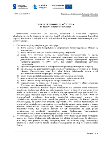 OAK.KCB.2621/15/16 Załącznik nr 1 do Zaproszenia do złożenia ofert –Opis przedmiotu zamówienia OPIS PRZEDMIOTU ZAMÓWIENIA na dostawę tonerów do drukarek Przedmiotem zamówienia jest dostawa, rozładunek i wniesienie artykułów eksploatacyjnych do drukarek na potrzeby LAWP w Lublinie, do pomieszczeń Lubelskiej Agencji Wspierania Przedsiębiorczości w Lublinie (ul. Wojciechowska 9a) wskazanych przez Zamawiającego. 1. Oferowane artykuły eksploatacyjne muszą być: 1) dobrej jakości, w pełni kompatybilne z urządzeniami Zamawiającego, do których są przeznaczone; 2) muszą zapewniać należyte bezpieczeństwo pracy urządzenia; 3) muszą być fabrycznie nowe, tj.: nieużywane, nieregenerowane w ogóle, nierefabrykowane, nie poddane procesowi ponownego napełniania ani wymiany jakichkolwiek elementów, do ich produkcji zostały wykorzystane wyłącznie elementy/półprodukty w 100% nowe, bez śladów poprzedniego używania i uszkodzenia; 4) zapakowane próżniowo lub w inny sposób zabezpieczający toner przed wilgocią; 5) zabezpieczone na czas transportu oraz przechowywania przed wysypaniem się tonera z kasety. Zabezpieczony musi być także bęben światłoczuły tonera przed uszkodzeniami mechanicznymi jak i dostępem światła; 6) tonery muszą posiadać nienaruszone cechy pierwotnego opakowania; 7) opakowane w kartonowe opakowanie zewnętrzne z opisem zawartości; 8) muszą spełniać normy obowiązujące na tego rodzaju artykuł; 9) wyprodukowane w okresie do 12 miesięcy przed datą dostawy i objęte gwarancją Wykonawcy na okres co najmniej 12 miesięcy; 2. W przypadku oferowania tonerów innych producentów niż zalecane przez producenta urządzenia, Wykonawca złoży np. zaświadczenie (raport z testów) wystawione przez producenta oferowanych tonerów do drukarek lub jego upoważnionego przedstawiciela, potwierdzające spełnienie odpowiednio normy ISO/IEC 19752 i/lub ISO/IEC 19798 lub równoważnych w zakresie testowania wydajności oferowanych tonerów lub zaświadczenie wystawione przez niezależny podmiot uprawniony do kontroli jakości potwierdzający, że dostarczone produkty odpowiadają ww. normom technicznym lub równoważne zaświadczenie wystawione przez podmioty mające swoją siedzibę w innym państwie członkowskim Europejskiego Obszaru Gospodarczego. Wszystkie złożone dokumenty winny być w języku polskim lub ich tłumaczenia na język polski potwierdzone za zgodność z oryginałem przez Wykonawcę. Udowodnienie równoważności artykułów eksploatacyjnych leży po stronie Wykonawcy. 3. W przypadku, zaoferowania tonerów do drukarek wyprodukowanych przez producenta innego niż Epson, Wykonawca zobowiązany jest złożyć oświadczenie, że oferowany przez niego toner posiada sprawny, inteligentny układ elektroniczny (chip) przekazujący informację o stanie zużycia tonera, działający analogicznie jak chip w tonerach marki Epson. Strona 1 z 3 4. Dostarczone materiały eksploatacyjne do drukarek, powinny zawierać wszystkie elementy, które zawierają oryginalne materiały eksploatacyjne (takie jak np. rolki zbierające zużyty toner). W przypadku stwierdzenia przez Zamawiającego, w którymkolwiek z dostarczonych przez Wykonawcę nieoryginalnych materiałów eksploatacyjnych, braku chociaż jednego elementu, który występuje w oryginalnym materiale eksploatacyjnym, Zamawiający ma prawo zwrócić całą partię materiałów eksploatacyjnych i żądać niezwłocznie dostarczenia nowych, wolnych od wad, zgodnych z opisem przedmiotu zamówienia materiałów eksploatacyjnych. 5. Wykonawca zobowiązany będzie do pokrycia kosztów naprawy drukarki, jeżeli jej uszkodzenie nastąpiło wskutek użytkowania tonera dostarczonego przez Wykonawcę. 6. Protokół zdawczo - odbiorczy, który jest podstawą do wystawienia i zapłaty faktury, zostanie podpisany po uprzednim sprawdzeniu całej partii dostarczonych materiałów eksploatacyjnych pod względem zgodności z opisem przedmiotu zamówienia. 7. Termin i sposób realizacji dostawy przez Wykonawcę: 1) Termin realizacji zamówienia: 15 dni od daty podpisania umowy. 2) Dostawa tonerów do siedziby Zamawiającego na terenie Lublina (ul. Wojciechowska 9a) połączona z ich wniesieniem bez udziału Zamawiającego. Powyższe czynności Wykonawca powinien wykonać w ramach własnych zasobów ludzkich i sprzętowych z uwzględnieniem konieczności dostawy w godzinach pracy Zamawiającego. Zamawiający dopuszcza dostawy realizowane za pomocą firm spedycyjnych itp. ale wymagane jest wniesienie tonerów do wskazanych miejsc (pomieszczeń) przez Zamawiającego, bez udziału Zamawiającego. Lp. Nazwa i opis tonera 1 toner do drukarki EPSON AcuLaser C3800 spełniający poniższe wymagania minimalne: 1) Wydajność* min. 9 500 stron A4 2) Kod produktu**: C13S051127 2 Ilość BLACK szt. 25 CYJAN szt. 7 MAGENTA szt. 5 YELLOW szt. 10 toner do drukarki EPSON AcuLaser C3800 spełniający poniższe wymagania minimalne: 1) Wydajność* min. 9 000 stron A4; 2) Kod produktu**: C13S051125 4 J. m. toner do drukarki EPSON AcuLaser C3800 spełniający poniższe wymagania minimalne: 1) Wydajność* min. 9 000 stron A4 2) Kod produktu**: C13S051126 3 kolor toner do drukarki EPSON AcuLaser C3800 spełniający poniższe wymagania minimalne: 1) Wydajność* min. 9 000 stron A4 2) Kod produktu**: C13S051124 Strona 2 z 3 * zgodnie z normą ISO/IEC 19752 oraz ISO/IEC 19798 ** kod produktu zalecany przez producenta urządzenia określa klasę produktu będącego przedmiotem zamówienia i służy ustaleniu standardu w zakresie wymogów technicznych, użytkowych i jakościowych postawionych przez Zamawiającego lub artykuły eksploatacyjne równoważne. Przez równoważne należy rozumieć artykuły nowe, tj.: nieużywane, nieregenerowane w ogóle, nierefabrykowane, nie poddane procesowi ponownego napełniania ani wymiany jakichkolwiek elementów, do których produkcji zostały wykorzystane wyłącznie elementy/półprodukty w 100%