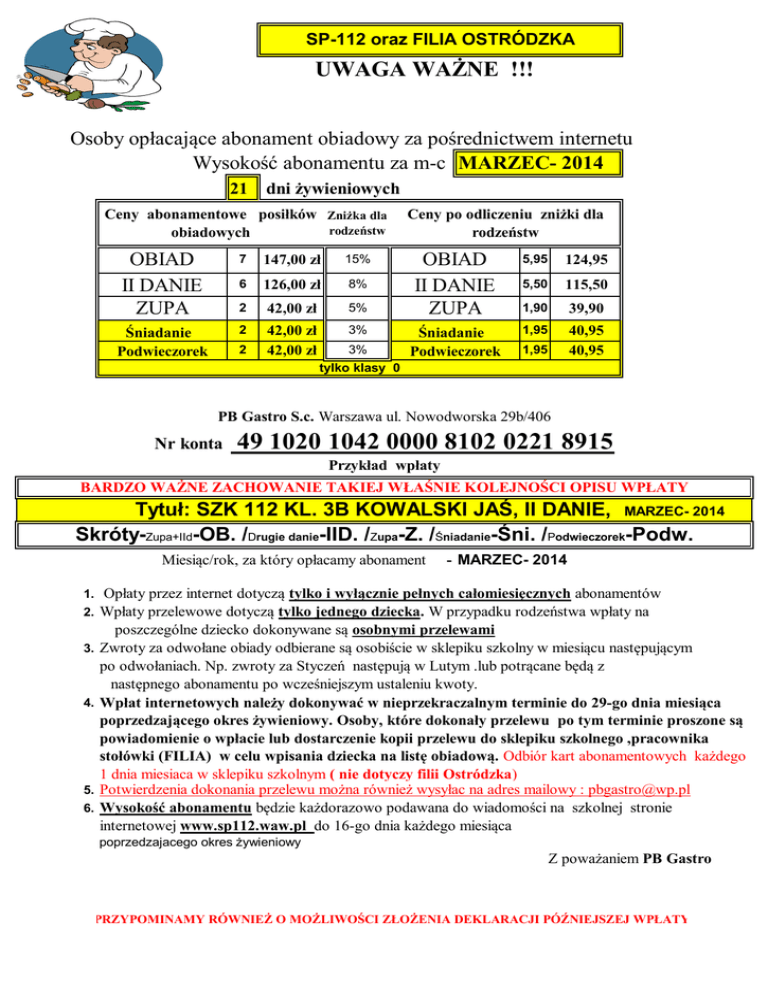 SP-112 oraz FILIA OSTRÓDZKA UWAGA WAŻNE !!! Osoby opłacające abonament obiadowy za pośrednictwem internetu Wysokość abonamentu za m-c MARZEC- 2014 21 dni żywieniowych Ceny abonamentowe posiłków Zniżka dla rodzeństw obiadowych OBIAD II DANIE ZUPA 7 147,00 zł 15% 6 126,00 zł 8% 2 42,00 zł 5% Śniadanie Podwieczorek 2 42,00 zł 42,00 zł 3% 2 3% tylko klasy 0 Ceny po odliczeniu zniżki dla rodzeństw OBIAD II DANIE ZUPA 5,95 124,95 5,50 115,50 1,90 39,90 Śniadanie Podwieczorek 1,95 40,95 40,95 1,95 PB Gastro S.c. Warszawa ul. Nowodworska 29b/406 Nr konta 49 1020 1042 0000 8102 0221 8915 Przykład wpłaty BARDZO WAŻNE ZACHOWANIE TAKIEJ WŁAŚNIE KOLEJNOŚCI OPISU WPŁATY Tytuł: SZK 112 KL. 3B KOWALSKI JAŚ, II DANIE, MARZEC- 2014 Skróty-Zupa+IId-OB. /Drugie danie-IID. /Zupa-Z. /Śniadanie-Śni. /Podwieczorek-Podw. Miesiąc/rok, za który opłacamy abonament - MARZEC- 2014 1. Opłaty przez internet dotyczą tylko i wyłącznie pełnych całomiesięcznych abonamentów 2. Wpłaty przelewowe dotyczą tylko jednego dziecka. W przypadku rodzeństwa wpłaty na 3. 4. 5. 6. poszczególne dziecko dokonywane są osobnymi przelewami Zwroty za odwołane obiady odbierane są osobiście w sklepiku szkolny w miesiącu następującym po odwołaniach. Np. zwroty za Styczeń następują w Lutym .lub potrącane będą z następnego abonamentu po wcześniejszym ustaleniu kwoty. Wpłat internetowych należy dokonywać w nieprzekraczalnym terminie do 29-go dnia miesiąca poprzedzającego okres żywieniowy. Osoby, które dokonały przelewu po tym terminie proszone są powiadomienie o wpłacie lub dostarczenie kopii przelewu do sklepiku szkolnego ,pracownika stołówki (FILIA) w celu wpisania dziecka na listę obiadową. Odbiór kart abonamentowych każdego 1 dnia miesiaca w sklepiku szkolnym ( nie dotyczy filii Ostródzka) Potwierdzenia dokonania przelewu można również wysyłac na adres mailowy : [email protected] Wysokość abonamentu będzie każdorazowo podawana do wiadomości na szkolnej stronie internetowej www.sp112.waw.pl do 16-go dnia każdego miesiąca poprzedzajacego okres żywieniowy Z poważaniem PB Gastro PRZYPOMINAMY RÓWNIEŻ O MOŻLIWOŚCI ZŁOŻENIA DEKLARACJI PÓŹNIEJSZEJ WPŁATY