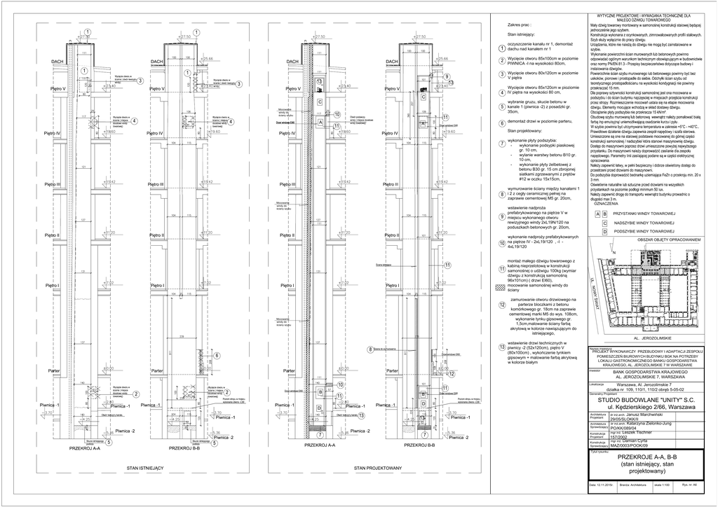 Zakres prac : Mocowanie windy do wybranie gruzu, skucie betonu w kanale 1 (piwnica -2) z posadzki gr. 35cm, Stan projektowany: - wykonanie podsypki piaskowej gr. 10 cm, wylanie warstwy betonu B10 gr. 10 cm, betonu B30 gr. 15 cm zbrojonej #12 w oczku 15x15cm, zaprawie cementowej M5 gr. 20cm, Mocowanie windy do OZNACZENIA PRZYSTANKI WINDY TOWAROWEJ miejscu wykonanego otworu rewizyjnego windy 2xL19N/120 na poduszkach betonowych gr. 20cm, NADSZYBIE WINDY TOWAROWEJ PODSZYBIE WINDY TOWAROWEJ 4xL19/120 N UL. 96x101cm) ( drzwi EI60), a4 b4 b4 zamurowanie otworu drzwiowego na parterze bloczkami z betonu Mocowanie windy do cementowej marki M5 do wys. 108cm, wykonanie tynku gipsowego gr. AL. JEROZOLIMSKIE wstawienie drzwi technicznych w Nazwa inwestycji LOKALU GASTRONOMICZNEGO BANKU GOSPODARSTWA KRAJOWEGO, AL. JEROZOLIMSKIE 7 W WARSZAWIE Inwestor BANK GOSPODARSTWA KRAJOWEGO AL. JEROZOLIMSKIE 7, WARSZAWA Lokalizacja Warszawa, Al. Jerozolimskie 7 Generalny Projektant STUDIO BUDOWLANE "UNITY" S.C. Architektura Projektant Architektura Konstrukcja Projektant Konstrukcja 29/05/SLOKK/II Katarzyna Zielonko-Jung PO/KK/089/04 Leszek Tischner 157/2002 Damian Cyrta MAZ/0003/POOK/09 PRZEKROJE A-A, B-B projektowany) Data: 12.11.2015r. skala 1:100 Rys. nr: A6