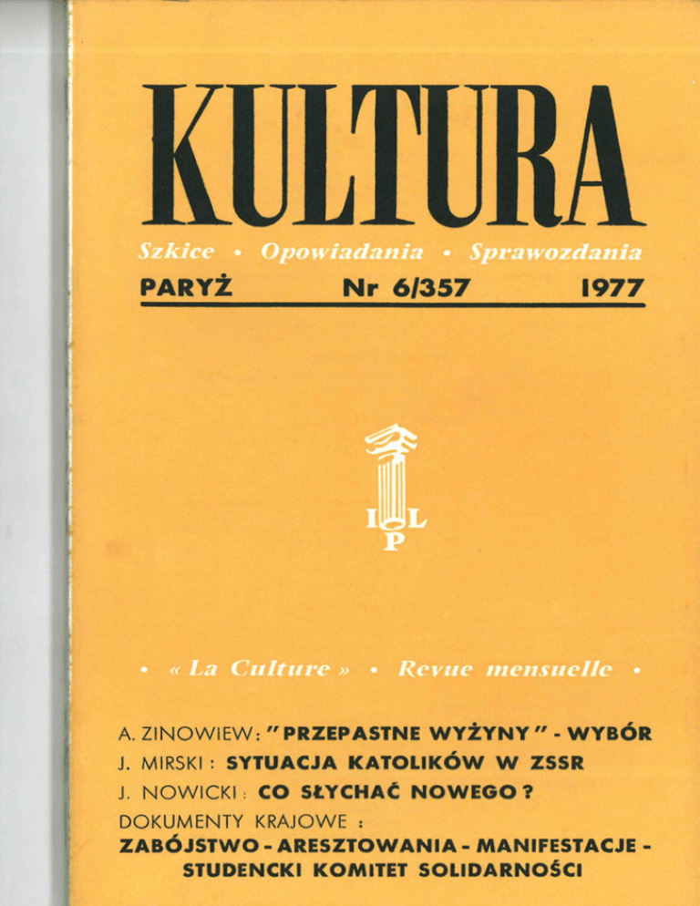 KULTURA PARYŻ « La Nr 6/357 Culture Revue 1977 mensuelle A ZINOWIEW: " PRZEPASTNE W Y Ż Y N Y " - WYBÓR J. MIRSKI : SYTUACJA KATOLIKÓW W ZSSR J. NOWICKI: CO SŁYCHAĆ N O W E G O ? DOKUMENTY KRAJOWE : ZABÓJSTWO - ARESZTOWANIA - MANIFESTACJE STUDENCKI KOMITET SOLIDARNOŚCI SPIS RZECZY Czesław Miłosz: jïe?aMtrki Jozer Mirski. o Ogród nauk f^zepastne wyżyny" - wybór Sytuacja katolików w ZSSR WiBW: Lucjan Perzanowski: Brukselczyk: Dominik Morawski: '.'.WW ARCHIWUM POLITYCZNE Fenomen kubariski . Widziane z Brukseli .... Korespondencja z Rzymu ....." | " Komisja Kontroli Helsinek K R A J Co słychać nowego? Manowce polityki gospodarczej PRL Jan Nowicki: Antom Gutowski: '(2j SĄSIEDZI sowieckiej prasie W Adam Kruczek: „ 26 « « 60 62 4 6 3 73 KUMM Szkice • Opowiadania • Sprawozdania Czerwiec - Juin PARYŻ 1977 8 5 SFRAWY I TROSKI Joztf Czapski: KRONIKA KULTURALNA Romantyczność w Grand Palais Komunikaty .... ( 105 i ng V 'Si KSIĄŻKI 2 ^ ? o/ moiocm s v ^ ' LnS^orawski: M I Z , " ^ ^ Mat C DanUcwi,:z C U mana Uanilcwicz /Znumskn: W*? * " *, *' »j • K™;„,„*c ! „ , „*y , / nUte^Mch 01( 0J c ić,„;cj!e ~ ^^pUarz trtfa 111 ^ 71 • Wydarzenia miesiąca 203 • W. Babiński, K. Cichecki i A. Zorkrot, A. Czerniawski, St. Gomułka, A. Gutowski, Z. Michałowski, W. Sukien, nicki, H. Świderska: lAsly do Redakcji Dokumenty: Mur. — Oświadcze nia KOR'u z 9. 5, 17. 5, 23. 5. 1977 —Pogrzeb St. Pyjasa. — Studencki Komitet Solidarności. — Deklaracja pisarzy. — Kalendarzyk Wydarzeń. — Oświadczenie Młodzieżowego Ko mitetu. — Oświadczenie PPN. Oświadczenie O. Szechtera. . . Z osta tniej chwili 1 2 9 INSTYTUT joj LITERACKI