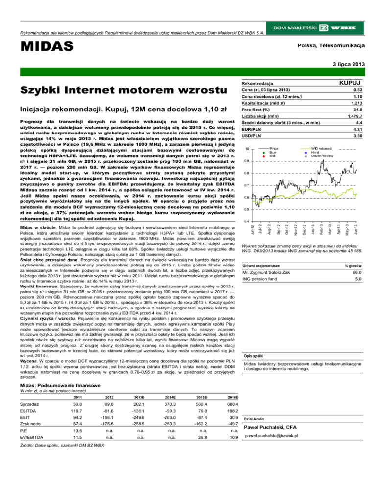 Rekomendacja dla klientów podlegających Regulaminowi świadczenia usług maklerskich przez Dom Maklerski BZ WBK S.A. MIDAS Polska, Telekomunikacja 3 lipca 2013 KUPUJ Rekomendacja 0.82 Cena docelowa (zł, 12-mies.) 1.10 Kapitalizacja (mld zł) Inicjacja rekomendacji. Kupuj, 12M cena docelowa 1,10 zł 1,213 Free float (%) 34.0 Liczba akcji (mln) 4.31 USD/PLN 3.30 Pric e Buy Sell 1.0 WIG rebased H old Under Review 0.9 0.8 0.7 0.6 0.5 EBITDA 2011 2012 2013E 2014E 2015E 2016E 89.8 202.1 378.3 568.4 688.4 198.2 119.7 -81.6 -136.1 -59.3 79.8 EBIT 94.2 -186.1 -249.6 -203.0 -87.4 30.9 Zysk netto 87.4 -175.6 -258.5 -250.3 -162.2 -49.7 P/E 13.5 n.a. n.a. n.a. n.a. n.a. EV/EBITDA 11.5 n.a. n.a. n.a. 26.8 10.9 Źródło: Dane spółki, szacunki DM BZ WBK Apr-13 May-13 Mar-13 Feb-13 J an-13 Wykres pokazuje zmianę ceny akcji w stosunku do indeksu WIG. 7/03/2013 indeks WIG zamknął się na poziomie 45 185. Główni akcjonariusze Mr. Zygmunt Solorz-Zak ING pension fund % głosów 66.0 5.0 Opis spółki Midas świadczy bezprzewodowe usługi telekomunikacyjne i dostępu do internetu mobilnego. W mln zł, o ile nie podano inaczej 30.8 Dec -12 Nov-12 Oct -12 Sep-12 Aug-12 0.4 Midas: Podsumowanie finansowe Sprzedaż 4.4 EUR/PLN J ul-12 Midas w skrócie. Midas to podmiot zajmujący się budową i serwisowaniem sieci Internetu mobilnego w Polsce, która umożliwia swoim klientom korzystanie z technologii HSPA+ lub LTE. Spółka dysponuje wyjątkowo szerokim pasmem częstotliwości w zakresie 1800 MHz. Midas powinien zrealizować swoją strategię (rozbudowa sieci do 4,8 tys. bezprzewodowych stacji bazowych) do połowy 2014 r., dzięki czemu penetracja technologii LTE osiągnie w ciągu kilku lat 66%. Spółka świadczy usługi hurtowe wyłącznie dla Polkomtela i Cyfrowego Polsatu, naliczając stałą opłatę za 1 GB transmisji danych. Świat chce przesyłać dane. Prognozy dla transmisji danych na świecie wskazują na bardzo duży wzrost użytkowania, a dzisiejsze wolumeny prawdopodobnie potroją się do 2015 r. Liczba godzin filmów wideo zamieszczanych w Internecie podwoiła się w ciągu ostatnich dwóch lat, a liczba zdjęć przekazywanych każdego dnia 2013 r. jest dwukrotnie wyższa niż w roku 2011. Udział ruchu bezprzewodowego w globalnym ruchu w Internecie szybko rośnie, aż do 14% w maju 2013 r. Wyniki finansowe. Szacujemy, że wolumen usług transmisji danych zrealizowanych przez spółkę w 2013 r. potroi się r/r i sięgnie 31 mln GB; w 2015 r. przekroczony zostanie próg 100 mln GB, natomiast w 2017 r. — poziom 200 mln GB. Równocześnie naliczana przez spółkę opłata będzie zapewne wyraźnie spadać do 5,0 zł za 1 GB w 2015 r. i 4,0 zł za 1 GB w 2018 r., spadając o 38% w stosunku do roku 2013 r. Koszty spółki są uzależnione od liczby działających stacji bazowych, a zgodnie z naszymi prognozami wysokie koszty na wczesnym etapie nie pozwoląna rozpoznanie zysku EBITDA przed 4 kw. 2014 r. Czynniki ryzyka / wzrostu. Pojawienie się konkurencji na rynku polskim i promowanie szybkiego przesyłu danych może w zasadzie zwiększyć popyt na transmisję danych, jednak agresywna kampania spółki Play może spowodować jeszcze wyraźniejsze obniżenie opłat za transmisję danych. To naszym zdaniem kluczowe ryzyko, ponieważ nie ma żadnej gwarancji, że w przyszłości opłaty te będą spadać wolniej. Jeśli ich spadek okaże się szybszy niż oczekiwano na najbliższe kilka lat, wyniki finansowe Midasa mogą wypaść słabiej od naszych prognoz. Z drugiej strony dostrzegamy szansę na osiągnięcie niskich kosztów stacji bazowych budowanych w trzeciej fazie, co stanowi potencjał wzrostowy, który może urzeczywistnić się już w I poł. 2014 r. Wycena. W oparciu o model DCF wyznaczyliśmy 12-miesięczną cenę docelową dla spółki na poziomie PLN 1,12. adku tej spółki wycena porównawcza jest bezużyteczna (strata EBITDA i strata netto), model DDM wskazuje natomiast na cenę docelową w granicach 0,76–0,95 zł za akcję, w zależności od przyjętych założeń. Średni dzienny obrót (3 mies., w mln) Jun-12 Prognozy dla transmisji danych na świecie wskazują na bardzo duży wzrost użytkowania, a dzisiejsze wolumeny prawdopodobnie potroją się do 2015 r. Co więcej, udział ruchu bezprzewodowego w globalnym ruchu w Internecie również szybko rośnie, osiągając 14% w maju 2013 r. Midas jest właścicielem wyjątkowo szerokiego pasma częstotliwości w Polsce (19,6 MHz w zakresie 1800 MHz), a zarazem pierwszą i jedyną polską spółką dysponującą działającymi stacjami bazowymi dostosowanymi do technologii HSPA+/LTE. Szacujemy, że wolumen transmisji danych potroi się w 2013 r. r/r i sięgnie 31 mln GB; w 2015 r. przekroczony zostanie próg 100 mln GB, natomiast w 2017 r. — poziom 200 mln GB. W zakresie wyników finansowych Midas reprezentuje idealny model start-up, w którym początkowe straty zostaną pokryte przyszłymi zyskami, jednakże z gwarancjami finansowania rozwoju. Inwestorzy najczęściej pytają zwyczajowo o punkty zwrotne dla EBITDA: przewidujemy, że kwartalny zysk EBITDA Midasa zacznie rosnąć od I kw. 2014 r., a spółka osiągnie rentowność w IV kw. 2014 r. Jeśli Midas spełni nasze oczekiwania, w 2014 r. zachowanie kursu akcji spółki pozytywnie wyróżniałoby się na tle innych spółek. W oparciu o przyjęte przez nas założenia dla modelu DCF wyznaczamy 12-miesięczną cenę docelową na poziomie 1,10 zł za akcję, a 37% potencjału wzrostu wobec bieżgo kursu rozpoczynamy wydawanie rekomendacji dla tej spółki od zalecenia Kupuj. 1,479.7 J un-13 Szybki Internet motorem wzrostu Cena (zł, 03 lipca 2013) Dział Analiz Pawel Puchalski, CFA [email protected] MIDAS 3 lipca 2013 Wycena Rys. 1. Midas: Wycena DCF W milionach złotych, o ile nie stwierdzono inaczej 2013P Sprzedaż 202 EBIT -250 Podatek 0 NOPAT -250 Amortyzacja 113 Kapitał obrotowy 25 104 Wyd. Inwestycyjne Inwestycje netto 16 FCF -266 WACC 10.4% PV FCF 2013-2022 325 