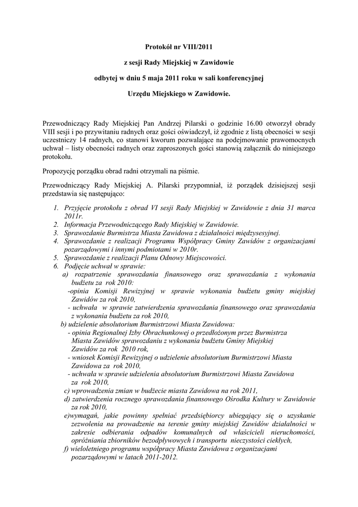 Protokół nr VIII/2011 z sesji Rady Miejskiej w Zawidowie odbytej w dniu 5 maja 2011 roku w sali konferencyjnej Urzędu Miejskiego w Zawidowie. Przewodniczący Rady Miejskiej Pan Andrzej Pilarski o godzinie 16.00 otworzył obrady VIII sesji i po przywitaniu radnych oraz gości oświadczył, iż zgodnie z listą obecności w sesji uczestniczy 14 radnych, co stanowi kworum pozwalające na podejmowanie prawomocnych uchwał – listy obecności radnych oraz zaproszonych gości stanowią załącznik do niniejszego protokołu. Propozycję porządku obrad radni otrzymali na piśmie. Przewodniczący Rady Miejskiej A. Pilarski przypomniał, iż porządek dzisiejszej sesji przedstawia się następująco: 1. Przyjęcie protokołu z obrad VI sesji Rady Miejskiej w Zawidowie z dnia 31 marca 2011r. 2. Informacja Przewodniczącego Rady Miejskiej w Zawidowie. 3. Sprawozdanie Burmistrza Miasta Zawidowa z działalności międzysesyjnej. 4. Sprawozdanie z realizacji Programu Współpracy Gminy Zawidów z organizacjami pozarządowymi i innymi podmiotami w 2010r. 5. Sprawozdanie z realizacji Planu Odnowy Miejscowości. 6. Podjęcie uchwał w sprawie: a) rozpatrzenie sprawozdania finansowego oraz sprawozdania z wykonania budżetu za rok 2010: -opinia Komisji Rewizyjnej w sprawie wykonania budżetu gminy miejskiej Zawidów za rok 2010, - uchwała w sprawie zatwierdzenia sprawozdania finansowego oraz sprawozdania z wykonania budżetu za rok 2010, b) udzielenie absolutorium Burmistrzowi Miasta Zawidowa: - opinia Regionalnej Izby Obrachunkowej o przedłożonym przez Burmistrza Miasta Zawidów sprawozdaniu z wykonania budżetu Gminy Miejskiej Zawidów za rok 2010 rok, - wniosek Komisji Rewizyjnej o udzielenie absolutorium Burmistrzowi Miasta Zawidowa za rok 2010, - uchwała w sprawie udzielenia absolutorium Burmistrzowi Miasta Zawidowa za rok 2010, c) wprowadzenia zmian w budżecie miasta Zawidowa na rok 2011, d) zatwierdzenia rocznego sprawozdania finansowego Ośrodka Kultury w Zawidowie za rok 2010, e)wymagań, jakie powinny spełniać przedsiębiorcy ubiegający się o uzyskanie zezwolenia na prowadzenie na terenie gminy miejskiej Zawidów działalności w zakresie odbierania odpadów komunalnych od właścicieli nieruchomości, opróżniania zbiorników bezodpływowych i transportu nieczystości ciekłych, f) wieloletniego programu współpracy Miasta Zawidowa z organizacjami pozarządowymi w latach 2011-2012. Po odczytaniu porządku obrad Przewodniczący Rady A. Pilarski zwrócił się z zapytaniem, czy któryś z radnych chciałby wystąpić z wnioskiem o dokonanie zmian w wyżej wymienionym porządku obrad. Burmistrz Miasta Zawidowa Józef Sontowski przekazał głos w tej kwestii Sekretarzowi Miasta Marcinowi Rogackiemu. Sekretarz Miasta Zawidowa Marcin Rogacki poprosił o usunięcie z porządku obrad podpunktu „e” w punkcie „6”, z uwagi na fakt, iż gmina nie posiada aktualnej uchwały w sprawie utrzymania czystości i porządku w gminie, oraz poprosił o usunięcie podpunktu „f”, gdyż projekt będzie mógł być podjęty w momencie przeprowadzenia konsultacji. Przewodniczący A. Pilarski poddał zgłoszony wniosek pod głosowanie. Rada Miejska w obecności 14 radnych, wstrzymujących się- 0, przyjęła ww. wniosek. w głosowaniu:/ za-14, przeciw-0, Przewodniczący A. Pilarski przedstawił zmiany w porządku obrad: w punkcie „6”, w podpunkcie „a” wprowadzić z podpunktu „b” „Opinię Regionalnej Izby Obrachunkowej o przedłożonym przez Burmistrza Miasta Zawidów sprawozdaniu z wykonania budżetu Gminy Miejskiej Zawidów za rok 2010”. Przewodniczący A. Pilarski poinformował, iż ta zmiana nie wymaga głosowania. Przewodniczący A. Pilarski wystąpił z wnioskiem o kolejną zmianę w porządku obrad, a mianowicie, zmianę w punkcie „6” w podpunkcie „b” dodać jako drugą pozycję „Opinia Regionalnej Izby Obrachunkowej o wniosku Komisji Rewizyjnej Rady Miejskiej w Zawidowie w sprawie udzielenia absolutorium Burmistrzowi Miasta Zawidów za 2010 rok. Przewodniczący A. Pilarski wyjaśnił, iż ten dokument jest wymagany przed podjęciem uchwały. Przewodniczący A. Pilarski poddał zgłoszony wniosek pod głosowanie. Rada Miejska w obecności 14 radnych, wstrzymujących się- 0, przyjęła ww. wniosek. w głosowaniu:/ za-14, przeciw-0, Radna Gabriela Micińska wniosła o wprowadzenie do porządku obrad punktu „7. Zapytania, wnioski, interpelacje.” Przewodniczący A. Pilarski poddał zgłoszony wniosek pod głosowanie. Rada Miejska w obecności 14 radnych, w głosowaniu:/ za-6, przeciw-5, wstrzymujących się- 3, nie przyjęła ww. wniosku. Radna G. Micińska wniosła o wprowadzenie do porządku obrad punktu „7. Sprawy różne.” Przewodniczący A. Pilarski poddał zgłoszony wniosek pod głosowanie. Rada Miejska w obecności 14 radnych, w głosowaniu:/ za- 6, przeciw-3, wstrzymujących się- 5, nie przyjęła ww. wniosku. Przewodniczący A. Pilarski poinformował, iż po zmianach porządek obrad przedstawia się następująco: 1. Przyjęcie protokołu z obrad VI sesji Rady Miejskiej w Zawidowie z dnia 31 marca 2011r. 2. Informacja Przewodniczącego Rady Miejskiej w Zawidowie. 3. Sprawozdanie Burmistrza Miasta Zawidowa z działalności międzysesyjnej. 4. Sprawozdanie z realizacji Programu Współpracy Gminy Zawidów z organizacjami pozarządowymi i innymi podmiotami w 2010r. 5. Sprawozdanie z realizacji Planu Odnowy Miejscowości. 6. Podjęcie uchwał w sprawie: a) rozpatrzenie sprawozdania finansowego oraz sprawozdania z wykonania budżetu za rok 2010: - opinia Regionalnej Izby Obrachunkowej o przedłożonym przez Burmistrza Miasta Zawidów sprawozdaniu z wykonania budżetu Gminy Miejskiej Zawidów za rok 2010, -opinia Komisji Rewizyjnej w sprawie wykonania budżetu gminy miejskiej Zawidów za rok 2010, - uchwała w sprawie zatwierdzenia sprawozdania finansowego oraz sprawozdania z wykonania budżetu za rok 2010, b) udzielenie absolutorium Burmistrzowi Miasta Z