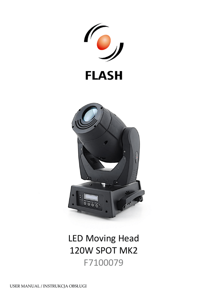 LED Moving Head 120W SPOT MK2 F7100079 USER MANUAL / INSTRUKCJA OBSŁUGI LED Moving Head 120W SPOT MK2 F7100079 Table of Contents 1 Introduction ...................................................................................................................................................... 2 2 Safety information ........................................................................................................................................... 2 2.1 General information ................................................................................................................................... 2 2.2 AC Power .................................................................................................................................................... 2 3 Specification ..................................................................................................................................................... 3 4 Installation ........................................................................................................................................................ 3 5 Connections ...................................................................................................................................................... 4 5.1 Connecting DMX signal............................................................................................................................. 4 5.2 Fixture linking ............................................................................................................................................ 4 5.3 Master/Slave fixture linking ...................................................................................................................... 5 5.4 Voltage specification .................................................................................................................................. 5 5.5 Connecting power supply ......................................................................................................................... 5 6 Menu ................................................................................................................................................................. 6 7 DMX channel list.............................................................................................................................................. 7 Spis Treści 1 Wprowadzenie ................................................................................................................................................. 8 2 Bezpieczeństwo ................................................................................................................................................ 8 2.1 Informacje o bezpieczeństwie ................................................................................................................... 8 2.2 Zasilanie ...................................................................................................................................................... 9 3 Specyfikacja ...................................................................................................................................................... 9 4 Instalacja ......................................................................................................................................................... 10 5 Połączenia ....................................................................................................................................................... 10 5.1 Podłączanie sygnału DMX ...................................................................................................................... 10 5.2 Łączenie urządzeń szeregowo ................................................................................................................ 10 5.3 Łączenie urządzeń w układzie Master/Slave ........................................................................................ 11 5.4 Specyfikacja zasilania............................................................................................................................... 11 5.5 Podłączanie zasilania ............................................................................................................................... 11 6 Menu ............................................................................................................................................................... 12 7 Lista kanałów DMX ....................................................................................................................................... 13 1 www.flash-butrym.pl 1 INTRODUCTION Thank you for purchasing LED Moving Head 120W SPOT MK2. For safety reasons and to ensure the troublefree operation, carefully read the instructions. 2 2.1 SAFETY INFORMATION General information 1. 2. 3. 4. 5. 6. 7. 8. 9. 10. 11. 12. 13. 14. 15. 16. 17. 18. 19. 2.2 Installation should be done by qualified personnel in order to minimize the risk of accidental electric shock. Disconnect the power supply before installation. Before connecting the unit to the mains, make sure it is not damaged mechanically. If you notice any signs of damage you should contact your dealer immediately. Do not connect the device to the mains. Do not use the device in high humidity conditions and at temperatures above 40° C The device must be installed on stable structures. Please keep this user guide for future consultation. If you sell the unit to another user, be sure that they also receive this instruction booklet. Always make sure that you are connecting to the proper voltage, and that the line voltage you are connecting to is not higher than that stated on the decal or rear panel of the fixture. This product is intended for indoor use only! To prevent risk of fire or shock, do not expose fixture to rain or moisture. Make sure that there are no flammable materials close to the unit while operatin