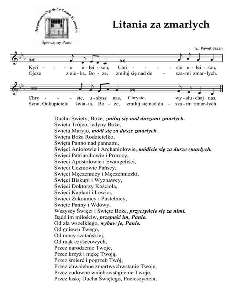 Litania za zmarłych b &bb W Kyri Ojcze b &bb W - j œ œj œ œ œ - e e - lei - son, z nie - ba, Bo - że, j j œ œ œ m.: Paweł Bazan W œ Chri - ste e - lei - son, zmiłuj się nad du sza - mi zmar - łych. j œ œj œ œ œ Chry - ste, u - słysz nas, Synu, Odkupicielu świa - ta, Bo - że, W j j œ œ œ œ Chryste, wy - słu - chaj nas. zmiłuj się nad du - sza - mi zmar -łych. Duchu Święty, Boże, zmiłuj się nad duszami zmarłych. Święta Trójco, jedyny Boże, Święta Maryjo, módl się za dusze zmarłych. Święta Boża Rodzicielko, Święta Panno nad pannami, Święci Aniołowie i Archaniołowie, módlcie się za dusze zmarłych. Święci Patriarchowie i Prorocy, Święci Apostołowie i Ewangeliści, Święci Uczniowie Pańscy, Święci Męczennicy i Męczenniczki, Święci Biskupi i Wyznawcy, Święci Doktorzy Kościoła, Święci Kapłani i Lewici, Święci Zakonnicy i Pustelnicy, Święte Panny i Wdowy, Wszyscy Święci i Święte Boże, przyczyńcie się za nimi. Bądź im miłościw, przepuść im, Panie. Od zła wszelkiego, wybaw je, Panie. Od gniewu Twego, Od mocy szatańskiej, Od mąk czyśćcowych, Przez narodzenie Twoje, Przez krzyż i mękę Twoją, Przez śmierć i pogrzeb Twój, Przez chwalebne zmartwychwstanie Twoje, Przez cudowne wniebowstąpienie Twoje, Przez łaskę Ducha Świętego, Pocieszyciela, Litania za zmarłych My grzeszni, za cierpiącymi duszami, prosimy Cię, Panie. Za duszami biskupów, kapłanów i duchownych wszelkich stanów, Za duszami królów, książąt i wszelkiej zwierzchności na świecie, Za duszami rodziców, braci, sióstr, krewnych i powinowatych naszych, Za duszami tych, którzy nam dobrze czynili względem duszy i ciała, Za duszami tych, których kochaliśmy szczególnie, Za duszami tych, którzy nam albo my im tu na świecie nieprzyjaźni byli, Za duszami tych, którzy z naszej przyczyny lub zgorszenia męki czyśćcowe cierpią, Za duszami tych, którzy niespodzianie zeszli z tego świata, Za duszami tych, którzy zmarli bez sakramentów świętych, Za duszami tych, którzy w tym domu i w tej parafii umarli, Za duszami tych, których ciała cmentarzu leżą, Za duszami tych, których ciała nie miały chrześcijańskiego pogrzebu, Za duszami dobrodziejów tego kościoła i innych miejsc świętych, Za duszami tych, którzy się za umarłych pobożnie modlili, Za duszami, które najdłużej lub najciężej cierpią, Za duszami, które od krewnych i przyjaciół nie mają ratunku, Za duszami, za które najbardziej jesteśmy obowiązani się modlić, Za duszami, przez których wybawienie mamy mieć od nich podobną pomoc, Za duszami, których wybawienia gorąco pragnie Najświętsze Serce Niepokalanej Maryi Panny, Za duszami, dla których nasze prośby są najbardziej potrzebne, Abyś wszystkich zmarłych do wiekuistego odpoczynku doprowadzić raczył, Abyś wszystkich żyjących do nabożeństwa za dusze zmarłych pobudzić raczył, Abyś wspomnienia za dusze zmarłych we mszy św. od wszystkich kapłanów łaskawie przyjmować raczył, Abyś świętych Aniołów Twoich na pociechę cierpiących dusz i na ich wyprowadzenie z czyśćca posyłać raczył, Abyś niegodne prośby nasze miłościwie przyjąć raczył, Synu Boży, a Boże miłosierdzia, wysłuchaj nas, Panie. Baranku Boży, który gładzisz grzechy świata, przepuść im, Panie. Baranku Boży, który gładzisz grzechy świata, wysłuchaj nas, Panie. Baranku Boży, który gładzisz grzechy świata, zmiłuj się nad duszami zmarłych, Panie. K.: Chryste, usłysz nas.Chryste, wysłuchaj nas. W.: Kyrie eleison. Chryste eleison. Kyrie eleison. Litania za zmarłych Ojcze nasz, któryś jest w niebie… K.: Od bram piekielnych. W.: Wybaw, Panie, ich dusze. K.: Panie, wysłuchaj modlitwy nasze. W.: A wołanie nasze niech do Ciebie przyjdzie. Módlmy się: Boże, Ty raczyłeś nam zostawić znaki Twej Męki na świętym całunie, którym zostało owinięte przez Józefa z Arymatei Twoje Ciało Przenajświętsze zdjęte z krzyża, spraw łaskawie, abyśmy przez śmierć i pogrzeb Twój zostali doprowadzeni do chwalebnego zmartwychwstania. Który żyjesz i królujesz z Bogiem Ojcem w jedności Ducha Świętego, Bóg przez wszystkie wieki wieków. W.: Amen. WSZELKIE PRAWA ZASTRZEŻONE Copyright © by Paweł Bazan [email protected] dso.diecezja.rzeszow.pl