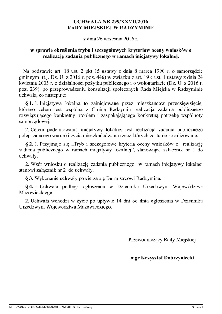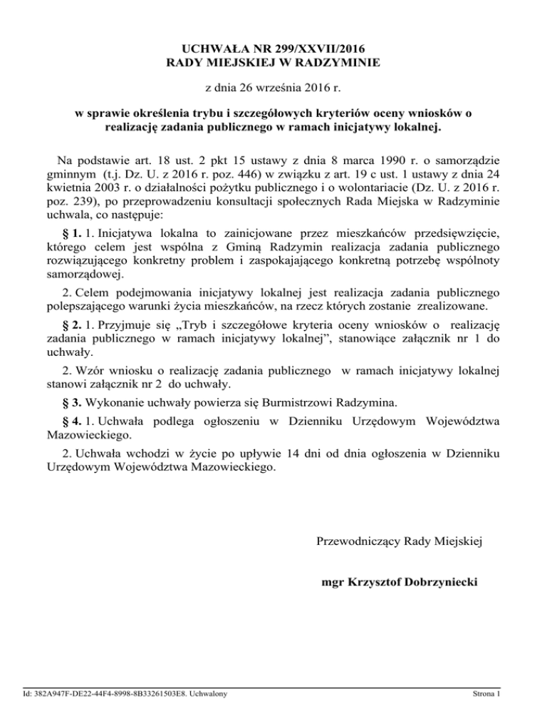 UCHWAŁA NR 299/XXVII/2016 RADY MIEJSKIEJ W RADZYMINIE z dnia 26 września 2016 r. w sprawie określenia trybu i szczegółowych kryteriów oceny wniosków o realizację zadania publicznego w ramach inicjatywy lokalnej. Na podstawie art. 18 ust. 2 pkt 15 ustawy z dnia 8 marca 1990 r. o samorządzie gminnym (t.j. Dz. U. z 2016 r. poz. 446) w związku z art. 19 c ust. 1 ustawy z dnia 24 kwietnia 2003 r. o działalności pożytku publicznego i o wolontariacie (Dz. U. z 2016 r. poz. 239), po przeprowadzeniu konsultacji społecznych Rada Miejska w Radzyminie uchwala, co następuje: § 1. 1. Inicjatywa lokalna to zainicjowane przez mieszkańców przedsięwzięcie, którego celem jest wspólna z Gminą Radzymin realizacja zadania publicznego rozwiązującego konkretny problem i zaspokajającego konkretną potrzebę wspólnoty samorządowej. 2. Celem podejmowania inicjatywy lokalnej jest realizacja zadania publicznego polepszającego warunki życia mieszkańców, na rzecz których zostanie zrealizowane. § 2. 1. Przyjmuje się „Tryb i szczegółowe kryteria oceny wniosków o realizację zadania publicznego w ramach inicjatywy lokalnej”, stanowiące załącznik nr 1 do uchwały. 2. Wzór wniosku o realizację zadania publicznego w ramach inicjatywy lokalnej stanowi załącznik nr 2 do uchwały. § 3. Wykonanie uchwały powierza się Burmistrzowi Radzymina. § 4. 1. Uchwała podlega ogłoszeniu w Dzienniku Urzędowym Województwa Mazowieckiego. 2. Uchwała wchodzi w życie po upływie 14 dni od dnia ogłoszenia w Dzienniku Urzędowym Województwa Mazowieckiego. Przewodniczący Rady Miejskiej mgr Krzysztof Dobrzyniecki Id: 382A947F-DE22-44F4-8998-8B33261503E8. Uchwalony Strona 1 Załącznik Nr 1 do Uchwały Nr 299/XXVII/2016 Rady Miejskiej w Radzyminie z dnia 26 września 2016 r. Tryb i szczegółowe kryteria oceny wniosków o realizację zadania publicznegow ramach inicjatywy lokalnej Rozdział 1. Informacje ogólne § 1. 1. Inicjatywa lokalna w rozumieniu art. 2 pkt 4 ustawy z dnia 24 kwietnia 2003 r. o działalności pożytku publicznego i o wolontariacie (Dz. U. z 2016 r., poz. 239), zwanej dalej „ustawą”, to forma współpracy Gminy Radzymin, zwanej dalej „Gminą”, z jej mieszkańcami, w celu wspólnego realizowania zadania publicznego na rzecz społeczności lokalnej. 2. Inicjatywa lokalna jest jedną z form rozwoju społeczeństwa obywatelskiego Gminy, w ramach której jej mieszkańcy mogą wnioskować o realizację zadań publicznych, o których mowa w art. 19 b ust.1 ustawy. § 2. 1. Wnioski w ramach inicjatywy lokalnej mogą składać mieszkańcy Gminy bezpośrednio, bądź za pośrednictwem organizacji pozarządowych lub podmiotów wymienionych w art. 3 ust. 3 ustawy. 2. Podmioty wymienione w ust. 1, zwane dalej „Inicjatorem”, mogą realizować przedsięwzięcia służące wyłącznie zaspokajaniu zbiorowych potrzeb wspólnoty Gminy, zgodnie z art. 7 ustawy z dnia 8 marca 1990 r. o samorządzie gminnym (t.j. Dz. U. z 2016 r., poz. 446). Rozdział 2. Zadania publiczne § 3. W ramach inicjatywy lokalnej mogą być realizowane zadania publiczne, należące do zadań własnych gminy, z zakresu: 1) budowy, rozbudowy lub remontu dróg, kanalizacji, sieci wodociągowej, budynków oraz obiektów architektury stanowiących własność Gminy; 2) działalności charytatywnej; 3) podtrzymywania i upowszechniania tradycji narodowej, pielęgnowania polskości oraz rozwoju świadomości narodowej, obywatelskiej i kulturowej; 4) kultury, sztuki, ochrony dóbr kultury i dziedzictwa narodowego; 5) promocji i organizacji wolontariatu; 6) edukacji, oświaty i wychowania; 7) działalności w sferze kultury fizycznej i turystyki; Id: 382A947F-DE22-44F4-8998-8B33261503E8. Uchwalony Strona 1 8) ochrony przyrody, w tym zieleni w mieście i wsiach; 9) porządku i bezpieczeństwa publicznego; 10) rewitalizacji. § 4. 1. Współudział Inicjatora w realizacji zadania publicznego w ramach inicjatywy lokalnej, może polegać na świadczeniu pracy społecznej, na świadczeniach pieniężnych i rzeczowych. 2. Wysokość udziału Gminy i Inicjatora w zadaniach publicznych realizowanych w ramach inicjatywy lokalnej oraz zasady rozliczania poniesionych nakładów będą ustalane każdorazowo w odrębnych umowach pomiędzy podmiotami, z zastrzeżeniem, że wkład własny Inicjatora nie może być niższy niż 30 % kosztów całkowitych zadania. Rozdział 3. Wniosek na zadanie publiczne § 5. 1. W celu rozpoczęcia postępowania wynikającego z inicjatywy lokalnej, Inicjator składa wniosek o realizację zadania publicznego, którego wzór określa załącznik nr 2 do uchwały. 2. Wniosek o którym mowa w ust. 1, należy złożyć w zamkniętej kopercie z napisem „Inicjatywa lokalna”, w Urzędzie Miasta i Gminy Radzymin, zwanym dalej „Urzędem”. 3. Do przeprowadzenia postępowania w sprawie oceny wniosku o realizację zadania publicznego w ramach inicjatywy lokalnej Burmistrz Radzymina wyznacza właściwą komórkę organizacyjną Urzędu lub jednostkę organizacyjną Gminy. 4. Wniosek o realizację zadania publicznego powinien zawierać w szczególności: 1) informację o grupie inicjatywnej, obejmującą listę mieszkańców Gminy składających wniosek lub nazwę i adres organizacji pozarządowej, lub podmiotu wymienionego w art. 3 ust. 3 ustawy oraz dane osób upoważnionych do składania oświadczeń woli w imieniu organizacji - wraz z podpisami tych osób; 2) nazwę, cel i opis inicjatywy; 3) termin realizacji zadania publicznego; 4) miejsce wykonywania zadania; 5) szczegółowy zakres rzeczowy zadania wraz z propozycją harmonogramu realizacji; 6) opis dotychczas wykonywanych prac; 7) opis działań planowanych przy realizacji zadania (w przypadku inicjatyw inwestycyjnych także parametry techniczne zadania); 8) kalkulację przewidywanych kosztów realizacji inicjatywy, w tym: a) całkowity koszt, b) rodzaj kosztów, Id: 382A947F-DE22-44F4-8998-8B33261503E8. Uchwalony Strona 2 c) wnioskowaną